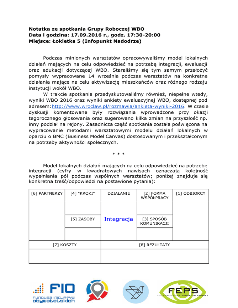 Notatka ze spotkania Grupy Roboczej WBO Data i godzina: 17.09.2016 r., godz. 17:30-20:00 Miejsce: Łokietka 5 (Infopunkt Nadodrze) Podczas minionych warsztatów opracowywaliśmy model lokalnych działań mających na celu odpowiedzieć na potrzebę integracji, ewaluacji oraz edukacji dotyczącej WBO. Staraliśmy się tym samym przełożyć pomysły wypracowane 14 września podczas warsztatów na konkretne działania mające na celu aktywizację mieszkańców oraz różnego rodzaju instytucji wokół WBO. W trakcie spotkania przedyskutowaliśmy również, niepełne wtedy, wyniki WBO 2016 oraz wyniki ankiety ewaluacyjnej WBO, dostępnej pod adresem:http://www.wroclaw.pl/rozmawia/ankieta-wyniki-2016. W czasie dyskusji komentowane były rozwiązania wprowadzone przy okazji tegorocznego głosowania oraz sugerowano kilka zmian na przyszłość np. inny podział na rejony. Zasadnicza część spotkania została poświęcona na wypracowanie metodami warsztatowymi modelu działań lokalnych w oparciu o BMC (Business Model Canvas) dostosowanym i przekształconym na potrzeby aktywności społecznych. *** Model lokalnych działań mających na celu odpowiedzieć na potrzebę integracji (cyfry w kwadratowych nawisach oznaczają kolejność wypełniania pól podczas wspólnych warsztatów; poniżej znajduje się konkretna treść/odpowiedzi na postawione pytania): [6] PARTNERZY [4] “KROKI” DZIAŁANIE [2] FORMA WSPÓŁPRACY [5] ZASOBY Integracja [3] SPOSÓB KOMUNIKACJI [7] KOSZTY [8] REZULTATY [1] ODBIORCY [1] ODBIORCY (do kogo skierowane jest działanie? kto ma za nie odpowiadać? kto z niego korzystać?): aktywiści, mieszkańcy, “użytkownicy osiedla/jego części” np. parku, lokalny biznes, zarządcy, rodzice, ngo, RO, osoby pracujące na osiedlu (ogarniające osiedle) np. osoby sprzątające [2] FORMY WSPÓŁPRACY (w jaki sposób współpracować?): spotkania, laboratoria, imprezy np. zawody sportowe, festyny, wspólne świętowanie, “maratony” pisania projektów, [3] KANAŁY KOMUNIKACJI (jak się komunikować? ale też dzięki komu i w jaki sposób?): ogłoszenia (słupy, bilbordy, gazetki osiedlowe), ulotki, ogłoszenia parafialne, media społecznościowe, strony, tablice ogłoszeń w sklepach, rady rodziców w szkołach, grupy seniorów, grupy “hobbystyczne” np. biegających czy właścicieli psów, poprzez elity działania (zadanie: wychwycenie, wskazanie elit działania), osoby skupione wokół miejsca, które może służyć integracji na osiedlu np. welodrom; stworzenie banku umiejętności na danym osiedlu; osobiste komunikowanie się z liderami, zainteresowanymi osobami na danym osiedlu (rozmowa w cztery oczy, telefon), [4] “KROKI” (jakie pierwsze kroki należy podjąć żeby “się zorganizować”? zacząć integrować się na osiedlu, wokół projektu lub innego wspólnego celu?): znalezienie konkretnych odbiorców, wyłonienie grupy liderów/chcących działać, ustalenie sposobu komunikacji, wybranie miejsca i czasu na pierwsze spotkanie oraz przygotowanie programu spotkania, określenie celów krótkotrwałych i długofalowego planu działania, zaczynanie od rzeczy małych/”nieporywanie się z motyką na słońce”, [5] ZASOBY (jakimi zasobami dysponujemy? co można wykorzystać? czego potrzebujemy): centrum lokalne (miejsce spotkań), poświęcony czas osób zaangażowanych, przygotowanie mapy zasobów/możliwości /umiejętności poszczególnych osób (zebranie informacji o tym “kto co może?”, zebranie deklaracji chcących włączyć się w działania (wzięcie odpowiedzialności za podejmowane działania), stworzenie miłej i przyjaznej atmosfery spotkań “kawa, herbata”, [6] PARTNERZY (kto może merytorycznie, informacyjnie Dom Pokoju, Fundacja na Rozwiązań Systemowych, rady i powinien nas wspierać i pomagać etc.?): Biuro Partycypacji UM, Fundacja Rzecz Studiów Europejskich, Centrum osiedli, [7] KOSZTY (jakie koszty będziemy ponosić? na co możemy potrzebować środków finansowych): czas, miejsce, drobne materiały biurowe/potrzebne do pracy w zespole, “kawa, herbata”, wybór - ustalenie gradacji stawianych sobie celów, wybór najważniejszych zadań, zostawienie na przyszłość mniej ważnych kwestii, [8] REZULTATY (jakie są oczekiwane rezultaty?): nowe kontakty, wyłonienie aktywnych mieszkańców, wykreowanie grupy liderów (elity działania), zwiększenie liczby liderów, zwiększenie zainteresowania osiedlem i aktywności mieszkańców na osiedlu, wypracowanie strategii lokalnego działania, stworzeni osiedlowej grupy projektowej (pisanie wspólnie wypracowanych, przemyślanych i poddanych społecznym konsultacją wniosków do WBO i innych programów, oraz ich ewaluowanie), wypracowanie wspólnej wizji osiedla i próba jej realizacji (myślenie długofalowe). *** W czasie spotkania ustaliliśmy, że pilotażowe działania, oparte na wypracowanym przez nas modelu, zostaną zorganizowane na osiedlach Karłowice - Różanka oraz Psie Pole - Zawidawie. Na tych osiedlach będziemy organizowali spotkania lokalnych liderów i osób zainteresowanych WBO. Naszą rolą będzie wsparcie organizatorów, pozyskanie partnerów oraz udzielenie logistycznego wsparcia, jeżeli będzie ono potrzebne. Kolejne nasze spotkanie odbędzie się w tygodniu pomiędzy 20 a 25 listopada. Dokładna data zostanie ustalona z zainteresowanymi stronami. Do czasu kolejnego spotkania będziemy starali się (wspólnie z lokalnymi liderami) poznać dokładnie potrzeby lokalnych aktorów, nawiązać współpracę z partnerami oraz zebrać i przeanalizować dane dotyczące wyników WBO na danym osiedlu. Do udziału w spotkaniu zachęcamy jednak wszystkich zainteresowanych tematem WBO - będzie to bowiem szansa przetestowania tego pilotażowego rozwiązania. Jednocześnie informujemy, aby te osoby, które nie mogły uczestniczyć w ostatnich warsztatach, a są zdeterminowane, aby na ich osiedlach również zorganizować podobne działania, skontaktowały się z nami