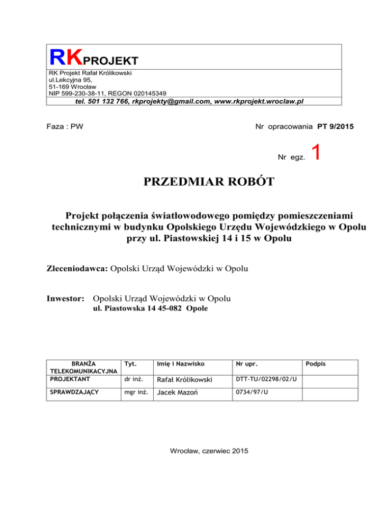 RKPROJEKT RK Projekt Rafał Królikowski ul.Lekcyjna 95, 51-169 Wrocław NIP 599-230-38-11, REGON 020145349 tel. 501 132 766, [email protected], www.rkprojekt.wroclaw.pl Faza : PW Nr opracowania PT 9/2015 Nr egz. 1 PRZEDMIAR ROBÓT Projekt połączenia światłowodowego pomiędzy pomieszczeniami technicznymi w budynku Opolskiego Urzędu Wojewódzkiego w Opolu przy ul. Piastowskiej 14 i 15 w Opolu Zleceniodawca: Opolski Urząd Wojewódzki w Opolu Inwestor: Opolski Urząd Wojewódzki w Opolu ul. Piastowska 14 45-082 Opole BRANŻA TELEKOMUNIKACYJNA PROJEKTANT Tyt. Imię i Nazwisko Nr upr. dr inż. Rafał Królikowski DTT-TU/02298/02/U SPRAWDZAJĄCY mgr inż. Jacek Mazoń 0734/97/U Wrocław, czerwiec 2015 Podpis P R Z E D M I A R R O B Ó T Projekt połączenia światłowodowego pomiędzy pomieszczeniami technicznymi w budynku Opolskiego Urządu Wojewódzkiego w Opolu przy ul.Piastowskiej 14 i 15 Data: 2015-07-01 Inwestor: Opolski Urząd Wojewódzki w Opolu ul.Piastowska 14 45-082 Opole Obiekt: Budynek Opolskiego Urzędu Wojewódzkiego w Opolu Sprawdzający: Inwestor: Wykonawca: Wykonujący: dr inż Rafał Królikowski RK Projekt ul.Lekcyjna 95 51-169 Wrocław .......... .......... .......... .......... Zbiór: Przedmiar robót PT9_2015 OTK Opole Zuzia (C) DataComp 1994-2002 Projekt połączenia światłowodowego pomiędzy pomieszczeniami technicznymi w budynku Opolskiego 01/07/15 Przedmiar Robót Podstawa nakładu, opis pozycji, wyliczenie ilości robót Ilość Krot. Jedn. 1 Montaż linii OTK 1.001 KNR 508/803/1 1.002 KNR 508/809/5 1.003 KNR 508/809/4 1.004 KNR 508/701/3 1.005 KNR 508/705/1 1.006 KNR 508/705/8 1.007 KNR 508/804/2 1.008 KNR 501/606/8 1.009 KNR 508/212/1 1.010 TPSA 39/613/4 1.011 TPSA 39/701/1 1.012 TPSA 39/701/2 1.013 TPSA 39/607/1 1.014 TPSA 39/607/2 1.015 1.016 TPSA 39/901/9 1.017 TPSA 39/901/10 1.018 TPSA 39/902/3 1.019 TPSA 39/902/4 1.020 TPSA 39/903/3 1.021 TPSA 39/903/4 Mechaniczne wykonanie ślepych otworów i wnęk w betonie, głębokość do 8·cm i średnicy do 10·mm Osadzenie w podłożu kołków, kołki kotwiące M10, na stropie Osadzenie w podłożu kołków, kołki kotwiące M10, na ścianie Montaż na gotowym podłożu konstrukcji wsporczych przykręcanych, ciężar do 1·kg, na stropie, ilość mocowań 1 Montaż koryt siatkowych przykręcanie do gotowych elementów, szerokości 200·mm Montaż koryt PCV190x50 Ręczne usuwanie zaprawy i masy uszczelniającej z przepustów kablowych Uszczelnianie otworów przepustów kablowych masą ogniochronną Kabel światłowodowy układany w proj. i istniejących korytach Montaż zapasu kabla światłowodowego Montaż przełącznic światłowodowych, przełącznica panelowa 19'' 1U, jeden łącznik centrujący i jeden patchcord Montaż przełącznic światłowodowych, przełącznica panelowa, dodatek za każdy następny jeden łącznik centrujący i jeden patchcord Montaż złączy końcowych kabli światłowodowych, kabel tubowy, przełącznica skrzynkowa, jeden spajany światłowód Montaż złączy końcowych kabli światłowodowych, kabel tubowy, przełącznica skrzynkowa, dodatek za każdy następny spajany światłowód Dostawa patchcordów Pomiary reflektometryczne linii światłowodowych, pomiary końcowe odcinka kontrolnego z kabla, mierzony 1 światłowód Pomiary reflektometryczne linii światłowodowych, pomiary końcowe odcinka kontrolnego z kabla, dodatek za każdy następny zmierzony światłowód Pomiary tłumienności optycznej linii światłowodowych metodą transmisyjną, pomiar przeprowadzany razem z innymi pomiarami, mierzony 1 światłowód Pomiary tłumienności optycznej linii światłowodowych metodą transmisyjną, pomiar przeprowadzany razem z innymi pomiarami, dodatek za każdy następny zmierzony światłowód Pomiary tłumienności odbicia wstecznego (reflektancji) złączek światłowodowych, pomiar przeprowadzany razem z innymi pomiarami, mierzony 1 światłowód Pomiary tłumienności odbicia wstecznego (reflektancji) złączek światłowodowych, pomiar przeprowadzany razem z innymi pomiarami, dodatek za każdy następny zmierzony światłowód 50 szt 40 szt 10 szt 20 szt 14 3 m m 8 szt 8 szt 280 2 m szt 2 szt 22 szt 2 złącze 46 8 złącze szt 1 odcinek 23 odcinek 1 odcinek 23 odcinek 1 zakończ 23 zakończ Jedn. m szt Ilość 280 50 Zestawienie materiałów Nazwa materiału Kabel światłowodowy ZW-NOTKtsd 24G50 OM3 Kołki kotwiące strona nr 2 Zbiór: Przedmiar robót PT9_2015 OTK Opole Zuzia (C) DataComp 1994-2002 Projekt połączenia światłowodowego pomiędzy pomieszczeniami technicznymi w budynku Opolskiego 01/07/15 Nazwa materiału Koryto PCV 190x50 Koryto siatkowe ocynkowane 200x60 Łącznik centrujący światłowodowy SC/PC MM Duplex Masa uszczelniająca ogniochronna trwale plastyczna Osłonka spoiny światłowodu Patchcord światłowodowy MM OM3 duplex SC/PC-LC/PC długość 15m Pigtail - sznur optyczny zakończeniowy Przełącznica światłowodowa panelowa wysuwana 1U 19'' 12xSC/PC MM OM3 Duplex Śruba M6 Zawiesie sufitowe/wspornik sufitowy do koryta o szerokości 200mm Jedn. m m szt kg szt szt kpl kpl szt szt Ilość strona nr 3 14 24 4 48 8 48 2 2 20 3