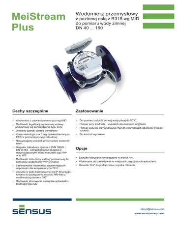 Wodomierz przemysłowy MeiStream Plus z poziomą osią z R315 wg MID do pomiaru wody zimnej DN 40 ... 150 Cechy szczególne Zastosowanie Wodomierz z zatwierdzeniem typu wg MID ź Do pomiaru zużycia zimnej wody pitnej do 50°C. Możliwość legalizacji wymiennej wstawy pomiarowej wg zatwierdzenia typu EEC ź Pomiar przy średnich i wysokich strumieniach objętości. Unikalny szeroki zakres pomiarowy Klasa metrologiczna C wg zatwierdzenia typu EEC w poziomej pozycji zabudowy ź Pomiar zużycia przy relatywnie małych strumieniach objętości wysoka czułość. ź Do kontroli wycieków. Niewymagany odcinek prosty przed wodomierzem Długości zabudowy zgodne z DIN 19625 i EN 14154 - kompatybilność długości z dotychczasowymi wodo-mierzami typu WP oraz WS. Możliwość zabudowy wstawy pomiarowej do korpusów wodomierzy WP-Dynamic Zastosowanie materiałów zapewniających odporność dla temperatury do 70°C Opcje ź Liczydło fabrycznie wyposażone w moduł HRI. ź Wykonania dla zastosowań w miejscach zagrożonych wybuchem. ź Gniazdo G¼" do podłączenia czujnika ciśnienia. Liczydło w pełni hermetyczne wg IP 68 przygotowane do podłączenia modułu HRI-Mei z możliwością obrotu o 355O Możliwość stosowania nadajnika optoelektronicznego typu OD [email protected] www.sensusesaap.com Zatwierdzenie typu Kompletny wodomierz Wstawa pomiarowa Zatwierdzenie typu MID: DE-09-MI001-PTB012, zgodne z wymaganiami: - 2004/22/EC - PN-EN 14154:2007 - OIML R49:2006 D02 DN 40 ... 150 6.132.48 Klasa C; 30 C O Dane techniczne Wielkość DN 40 50 65 80 100 150 3 m /h 50 55 60 120 160 400 Przeciążeniowy strumień strumień objętości wg MID m3/h 31,25 31,25 50 78,75 125 312,5 Q3' Ciągły strumień objętości (deklarowany przez producenta) m3/h 30 35 40 83 100 250 Q3 Ciągły strumień objętości wg MID m3/h 25 25 40 63 100 250 Q2 Pośredni strumień objętości wg MID dla zabudowy poziomej m3/h 0,13 0,13 0,16 0,25 0,4 0,63 Q1 Minimalny strumień objętości wg MID dla zabudowy poziomej m3/h 0,06 0,08 0,1 0,16 0,25 0,4 Q1' Min. strumień objętości dla zabudowy poziomej (deklarowany przez producenta) m3/h 0,08 0,07 0,1 0,13 0,2 0,35 Q3/Q1 Max. zakres pomiarowy dla zabudowy poziomej (deklarowany przez producenta) R 315 315 400 400 400 630 R 315 315 315 315 315 315 Rozruchowy strumień objętości m3/h 0,03 0,03 0,04 0,04 0,07 0,12 Strata ciśnienia przy Q3 zgodnie z EN 14154 bar 0,08 0,18 0,17 0,07 0,16 0,14 Q5 Szczytowy strumień objętości (w krótkim czasie) Q4 Q3/Q1 Standardowy zakres pomiarowy Δp Tarcza liczydła DN 40 ... 125 Średnica nominalna DN Wartość działki elementarnej m3 Zakres wskazań liczydła m3 40 ... 100 0,0005 1 000 000 150 0,005 10 000 000 DN 150 LB 1060 PL Strona 2 Typowy wykres błędów DN 150 DN 40 DN 50 DN 65 DN 80 DN 100 Typowy wykres straty ciśnienia 5% + p 0.5 5 0.4 4 bar 2% Błąd [%] 0.2 2 0.1 1 Strata ciśnienia 0,05 0,02 - 2% 0,01 5% 0.005 5 0.002 2 Q1 (min) 0.001 1 2 1 5 10 20 50 100 200 500 1000 2000 Q2 (t) Q4 (max) Q3(n) m3/h 5000 Strumień objętości [ m3/h] Strumień objętości [ m3/h] Wartościowości impulsowania Nadajnik impulsów Wartość impulsu DN 40 ... 100 DN 150 HRI-Mei (karta katalogowa LS 8400) 0,01; 0,05; 0,1 lub 1m3 0,1; 0,5; 1 lub 1 m3 OD 01 (karta katalogowa LB 8300) 0,001 m3 0,01 m3 OD 03 (karta katalogowa LB 8300) 0,01 m3 0,1 m3 Rysunek z wymiarami Zabudowa poziom Liczydło wodomierza tarczą do góry H g Rurociąg h Wymaganie instalacyjne • Przed wodomierzem odcinek prosty 0 x DN. • Brak wymagań zachowania odcinka prostego bezpośrednio za wodomierzem. L Dostępne długości zabudowy Materiały żeliwo Średnica nominalna Wstawa pomiarowa tworzywo sztuczne Wirnik tworzywo sztuczne Długość L dla WS wg DIN/ISO mm Pozostałe materiały mosiądz stal nierdzewna Długość L dla WP wg DIN/ISO mm 220 Korpus 40 50 65 80 100 150 270 300 300 300 360 350 350 500 200 200 225 200 250 300 LB 1060 PL Strona 3 Wymiary i masa (dla wykonań PN 16) Średnica nominalna DN 40 50 50 50 65 65 80 80 Nominalny strumień obj. Qn 10 15 15 15 25 25 40 40 Wymiar Długość L mm 220 200 270 300 200 300 200 225 Wysokość H mm 120 120 120 120 120 120 150 150 h mm 69 73 73 73 85 85 95 95 g mm 200 200 200 200 200 200 270 270 Wodomierz Wstawa pomiarowa kg 7,5 7,8 9,6 9,9 10,1 12,0 13,6 14,2 kg 1,5 1,5 1,5 1,5 1,5 1,5 3,2 3,2 Korpus kg 6,0 6,3 8,1 8,4 8,6 10,5 10,6 11,0 Średnica nominalna DN 80 80 100 100 100 150 150 Nominalny strumień obj. Qn 40 40 60 60 60 150 150 Wymiar Masa Masa Długość L mm 300 350 250 350 360 300 500 Wysokość H mm 150 150 150 150 150 177 177 h mm 95 95 105 105 105 135 135 g mm 270 270 270 270 270 356 356 Wodomierz Wstawa pomiarowa kg 16,3 17,7 18,2 20,0 20,2 35,9 44,2 kg 3,2 3,2 3,2 3,2 3,2 5,9 5,9 Korpus kg 13,1 14,5 15,0 16,8 17,0 30,0 38,3 Informacje dotyczące zamówienia Nazwa Dugość zabudowy w mm Nr katalogowy Meistream Plus DN 40 50 C / PN16 220 5401AHQ1CB1A1X Meistream Plus DN 50 50OC / PN16 200 5401BHQ1AB1A1X O O Meistream Plus DN 50 50 C / PN16 270 5401BHQ1FB1A1X Meistream Plus DN 50 50OC / PN16 300 5401BHQ1GB1A1X Meistream Plus DN 65 50OC / PN16 200 5401CIQ1AB1A1X O Meistream Plus DN 65 50 C / PN16 300 5401CIQ1GB1A1X Meistream Plus DN 80 50OC / PN16 200 5401DKQ1AB1A1X Meistream Plus DN 80 50OC / PN16 225 5401DKQ1DB1A1X Meistream Plus DN 80 50OC / PN16 300 5401DKQ1GB1A1X Meistream Plus DN 80 50OC / PN16 350 5401DKQ1IB1A1X Meistream Plus DN 100 50 C / PN16 250 5401ELQ1EB1A1X Meistream Plus DN 100 50OC / PN16 350 5401ELQ1IB1A1X O O Meistream Plus DN 100 50 C / PN16 360 5401ELQ1JB1A1X Meistream Plus DN 150 50OC / PN16 300 5401GNQ1GB1A1X Meistream Plus DN 150 50OC / PN16 500 5401GNQ1NB1A1X System zarządzania jakością OQS - certyfikat wg ISO 9001, Reg.-Nr.: 3496/0 Polska Sensus Polska Sp. z o.o., ul. Chrobrego 64/70, 87-100 Toruń T: +48 (56) 654 33 03 F: +48 (56) 657 21 45 E-mail: [email protected] www.sensusesaap.com International Enquiries Sensus GmbH Hannover, Meineckenstr. 10, 30880 Laatzen, Germany T: +49 (0) 5