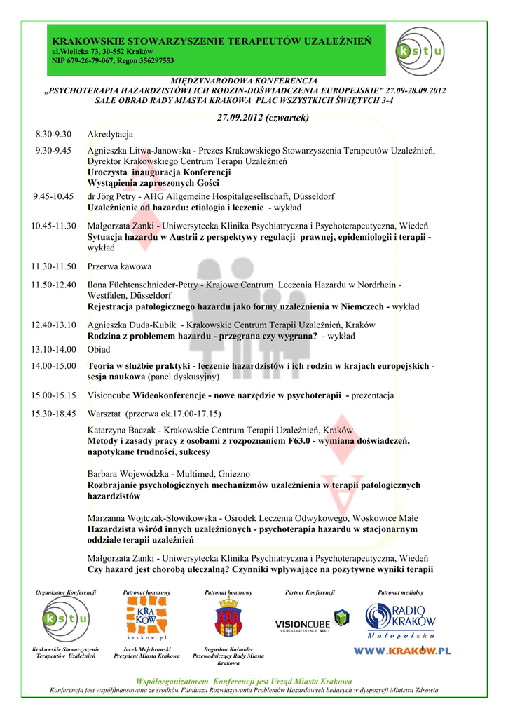 KRAKOWSKIE STOWARZYSZENIE TERAPEUTÓW UZALEŻNIEŃ ul.Wielicka 73, 30-552 Kraków NIP 679-26-79-067, Regon 356297553 MIĘDZYNARODOWA KONFERENCJA „PSYCHOTERAPIA HAZARDZISTÓWI ICH RODZIN-DOŚWIADCZENIA EUROPEJSKIE” 27.09-28.09.2012 SALE OBRAD RADY MIASTA KRAKOWA PLAC WSZYSTKICH ŚWIĘTYCH 3-4 27.09.2012 (czwartek) 8.30-9.30 Akredytacja 9.30-9.45 Agnieszka Litwa-Janowska - Prezes Krakowskiego Stowarzyszenia Terapeutów Uzależnień, Dyrektor Krakowskiego Centrum Terapii Uzależnień Uroczysta inauguracja Konferencji Wystąpienia zaproszonych Gości dr Jörg Petry - AHG Allgemeine Hospitalgesellschaft, Düsseldorf Uzależnienie od hazardu: etiologia i leczenie - wykład 9.45-10.45 10.45-11.30 Małgorzata Zanki - Uniwersytecka Klinika Psychiatryczna i Psychoterapeutyczna, Wiedeń Sytuacja hazardu w Austrii z perspektywy regulacji prawnej, epidemiologii i terapii wykład 11.30-11.50 Przerwa kawowa 11.50-12.40 Ilona Füchtenschnieder-Petry - Krajowe Centrum Leczenia Hazardu w Nordrhein Westfalen, Düsseldorf Rejestracja patologicznego hazardu jako formy uzależnienia w Niemczech - wykład 12.40-13.10 Agnieszka Duda-Kubik - Krakowskie Centrum Terapii Uzależnień, Kraków Rodzina z problemem hazardu - przegrana czy wygrana? - wykład Obiad 13.10-14.00 14.00-15.00 Teoria w służbie praktyki - leczenie hazardzistów i ich rodzin w krajach europejskich sesja naukowa (panel dyskusyjny) 15.00-15.15 Visioncube Wideokonferencje - nowe narzędzie w psychoterapii - prezentacja 15.30-18.45 Warsztat (przerwa ok.17.00-17.15) Katarzyna Baczak - Krakowskie Centrum Terapii Uzależnień, Kraków Metody i zasady pracy z osobami z rozpoznaniem F63.0 - wymiana doświadczeń, napotykane trudności, sukcesy Barbara Wojewódzka - Multimed, Gniezno Rozbrajanie psychologicznych mechanizmów uzależnienia w terapii patologicznych hazardzistów Marzanna Wojtczak-Słowikowska - Ośrodek Leczenia Odwykowego, Woskowice Małe Hazardzista wśród innych uzależnionych - psychoterapia hazardu w stacjonarnym oddziale terapii uzależnień Małgorzata Zanki - Uniwersytecka Klinika Psychiatryczna i Psychoterapeutyczna, Wiedeń Czy hazard jest chorobą uleczalną? Czynniki wpływające na pozytywne wyniki terapii Organizator Konferencji Patronat honorowy Patronat honorowy Krakowskie Stowarzyszenie Terapeutów Uzależnień Jacek Majchrowski Prezydent Miasta Krakowa Bogusław Kośmider Przewodniczący Rady Miasta Krakowa Partner Konferencji Patronat medialny Współorganizatorem Konferencji jest Urząd Miasta Krakowa Konferencja jest współfinansowana ze środków Funduszu Rozwiązywania Problemów Hazardowych będących w dyspozycji Ministra Zdrowia KRAKOWSKIE STOWARZYSZENIE TERAPEUTÓW UZALEŻNIEŃ ul.Wielicka 73, 30-552 Kraków NIP 679-26-79-067, Regon 356297553 MIĘDZYNARODOWA KONFERENCJA „PSYCHOTERAPIA HAZARDZISTÓWI ICH RODZIN-DOŚWIADCZENIA EUROPEJSKIE” 27.09-28.09.2012 SALE OBRAD RADY MIASTA KRAKOWA PLAC WSZYSTKICH ŚWIĘTYCH 3-4 28.09.2012 (piątek) 10.10-10.25 Barbara Wojewódzka - Multimed, Gniezno Nałogowe schematy w psychoterapii patologicznych hazardzistów - wykład Beata Lechowicz - Casinos Poland, Warszawa Koncepcja odpowiedzialnej gry w kasynach -wystąpienie Paweł Jareniowski - Izba Celna, Szczecin Hazard w Polsce, a działania Służby Celnej -wystąpienie Przerwa kawowa 10.25-13.35 Warsztat (przerwa ok.11.40 -11.50) 9.00-9.30 9.30-9.50 9.50-10.10 Agnieszka Duda-Kubik - Krakowskie Centrum Terapii Uzależnień, Kraków Psychodramatyczny trening roli terapeuty grupowego - dynamika grupy terapeutycznej dla hazardzistów Ilona Füchtenschnieder - Petry - Krajowe Centrum Leczenia Hazardu w Nordrhein Westfalen, Düsseldorf Infolinia uzależnienia od hazardu w Nadrenii Północnej Westfalii (NRW): analizy dotyczące profilu rozmówcy dr Jörg Petry - AHG Allgemeine Hospitalgesellschaft, Düsseldorf Uzależnienie od hazardu: etiologia i leczenie 13.35-14.15 Leszek Sagadyn - TOPIRO, Suwałki Specyfika relacji terapeutycznej i elementów procesu grupowego w psychoterapii osób z rozpoznaniem patologicznego hazardu Obiad 14.15-17.30 Warsztat (przerwa ok. 15.30-15.45) Ilona Füchtenschnieder - Petry - Krajowe Centrum Leczenia Hazardu w NordrheinWestfalen, Düsseldorf Infolinia uzależnienia od hazardu w Nadrenii Północnej Westfalii (NRW): analizy dotyczące profilu rozmówcy Serafin Olczak - Krakowskie Centrum Terapii Uzależnień, Kraków Przymus przyjemności - o uzależnieniu od Internetu i seksu dr Jörg Petry - AHG Allgemeine Hospitalgesellschaft, Düsseldorf Uzależnienie od hazardu: etiologia i leczenie Małgorzata Zanki - Uniwersytecka Klinika Psychiatryczna i Psychoterapeutyczna, Wiedeń Czy hazard jest chorobą uleczalną? Czynniki wpływające na pozytywne wyniki terapii 17.30-18.15 Zakończenie i rozdanie certyfikatów Organizator Konferencji Patronat honorowy Patronat honorowy Krakowskie Stowarzyszenie Terapeutów Uzależnień Jacek Majchrowski Prezydent Miasta Krakowa Bogusław Kośmider Przewodniczący Rady Miasta Krakowa Partner Konferencji Patronat medialny Współorganizatorem Konferencji jest Urząd Miasta Krakowa Konferencja jest współfinansowana ze środków Funduszu Rozwiązywania Problemów Hazardowych będących w dyspozycji Ministra Zdrowia