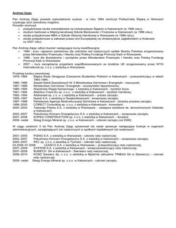 Andrzej Zając Pan Andrzej Zając posiada wykształcenie wyŜsze - w roku 1984 ukończył Politechnikę Śląską w Gliwicach uzyskując tytuł zawodowy magistra. Ponadto ukończył: • podyplomowe studia menedŜerskie na Uniwersytecie Śląskim w Katowicach (w 1995 roku); • studium bankowe w Międzynarodowej Szkole Bankowości i Finansów w Katowicach (w 1996 roku); • studia podyplomowe MBA w Szkole Głównej Handlowej w Warszawie (w 1996 roku); • studia podyplomowe w zakresie prawa Unii Europejskiej na Uniwersytecie Jagiellońskim w Krakowie (w 2007 roku). Pan Andrzej Zając odbył równieŜ następujące kursy kwalifikacyjne: • 1994 - kurs i egzamin państwowy dla członków rad nadzorczych spółek Skarbu Państwa zorganizowany przez Ministerstwo Przemysłu i Handlu oraz Polską Fundację Promocji Kadr w Warszawie; • 1996 - kurs dla likwidatorów i syndyków przez Ministerstwo Przemysłu i Handlu oraz Polską Fundację Promocji Kadr w Warszawie; • 2007 – kurs zarządzania projektami współfinansowanymi ze środków UE zorganizowany przez WYG International sp. z o.o. z siedzibą w Warszawie. Przebieg kariery zawodowej: 1978–1984 Śląska Rada Okręgowa Zrzeszenia Studentów Polskich w Katowicach - przewodniczący w latach 1983-1984; 1985–1986 Zespół Szkół Zawodowych Nr 3 Ministerstwa Górnictwa i Energetyki - nauczyciel; 1987–1988 Ministerstwo Górnictwa i Energetyki - wicedyrektor departamentu; 1989–1990 Wspólnota Węgla Kamiennego z siedzibą w Katowicach - dyrektor biura; 1991–1994 Atlantico-Trans-Ex sp. z o.o. z siedzibą w Katowicach - dyrektor handlowy; 1992–1994 Atlahandel sp. z o. o. z siedzibą w Katowicach – prezes zarządu; 1995–1997 Nystal S.A. z siedzibą w Świętochłowicach - wiceprezes zarządu; 1997–1998 Państwowa Agencja Restrukturyzacji Górnictwa w Katowicach - doradca prezesa zarządu; 1998–2000 CORECT Consulting sp. z o.o. z siedzibą w Katowicach - konsultant; 2000–2002 Telewizja Polska S.A. z siedzibą w Warszawie – zastępca dyrektora ds. ekonomicznych Oddziału w Katowicach; 2002–2007 Południowy Koncern Energetyczny S.A. z siedzibą w Katowicach – wiceprezes zarządu; 2007–2008 KOPEX CONSTRUCTION sp. z o.o. z siedzibą w Katowicach – doradca; 2008- nadal Steag Energo Mineral sp. z o.o. w Katowicach - członek zarządu (od 2009) W ciągu ostatnich 5 lat Pan Andrzej Zając sprawował lub nadal sprawuje następujące funkcje w organach administracyjnych, zarządzających lub nadzorczych w spółkach kapitałowych lub osobowych: 2001–2005 PGNiG S.A. z siedzibą w Warszawie - członek rady nadzorczej; 2002–2007 Południowy Koncern Energetyczny S.A. z siedzibą w Katowicach – wiceprezes zarządu; 2005–2007 PEC sp. z o.o. z siedzibą w Tychach - członek rady nadzorczej; 03.2008–07.2008 LEASCO S.A. z siedzibą w Warszawie – przewodniczący rady nadzorczej; 2007–2009 SYSTEM S.A. z siedzibą w Katowicach - wiceprzewodniczący rady nadzorczej; 2007–2009 BUMECH SA w Katowicach - Sekretarz rady nadzorczej; 2008–2010 KOSD Siewierz Sp. z o.o. z siedzibą w Będzinie (aktualnie TRIBAG SA w Siewierzu) – członek rady nadzorczej; 2009- nadal Steag Energo Mineral sp. z o.o. w Katowicach - członek zarządu.