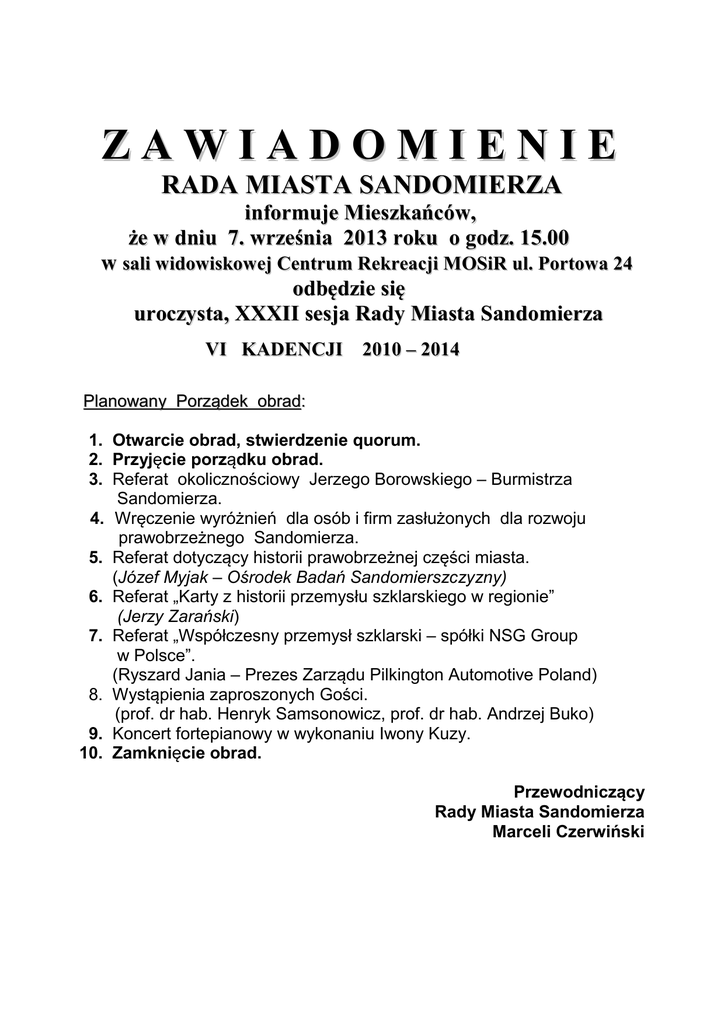 ZAWIADOMIENIE RADA MIASTA SANDOMIERZA informuje Mieszkańców, że w dniu 7. września 2013 roku o godz. 15.00 w sali widowiskowej Centrum Rekreacji MOSiR ul. Portowa 24 odbędzie się uroczysta, XXXII sesja Rady Miasta Sandomierza VI KADENCJI 2010 – 2014 Planowany Porządek obrad: 1. Otwarcie obrad, stwierdzenie quorum. 2. Przyjęcie porządku obrad. 3. Referat okolicznościowy Jerzego Borowskiego – Burmistrza Sandomierza. 4. Wręczenie wyróżnień dla osób i firm zasłużonych dla rozwoju prawobrzeżnego Sandomierza. 5. Referat dotyczący historii prawobrzeżnej części miasta. (Józef Myjak – Ośrodek Badań Sandomierszczyzny) 6. Referat „Karty z historii przemysłu szklarskiego w regionie” (Jerzy Zarański) 7. Referat „Współczesny przemysł szklarski – spółki NSG Group w Polsce”. (Ryszard Jania – Prezes Zarządu Pilkington Automotive Poland) 8. Wystąpienia zaproszonych Gości. (prof. dr hab. Henryk Samsonowicz, prof. dr hab. Andrzej Buko) 9. Koncert fortepianowy w wykonaniu Iwony Kuzy. 10. Zamknięcie obrad. Przewodniczący Rady Miasta Sandomierza Marceli Czerwiński