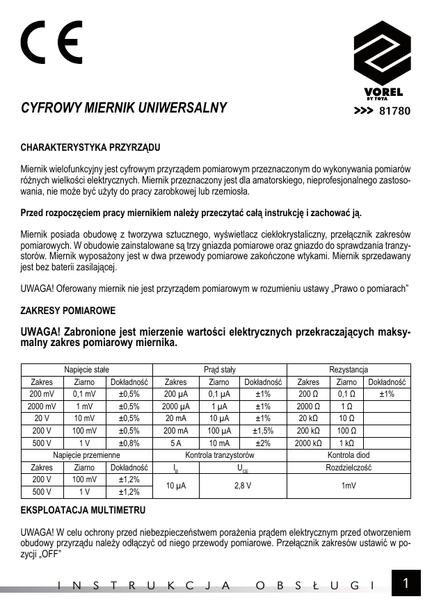 CYFROWY MIERNIK UNIWERSALNY 81780 CHARAKTERYSTYKA PRZYRZĄDU Miernik wielofunkcyjny jest cyfrowym przyrządem pomiarowym przeznaczonym do wykonywania pomiarów różnych wielkości elektrycznych. Miernik przeznaczony jest dla amatorskiego, nieprofesjonalnego zastosowania, nie może być użyty do pracy zarobkowej lub rzemiosła. Przed rozpoczęciem pracy miernikiem należy przeczytać całą instrukcję i zachować ją. Miernik posiada obudowę z tworzywa sztucznego, wyświetlacz ciekłokrystaliczny, przełącznik zakresów pomiarowych. W obudowie zainstalowane są trzy gniazda pomiarowe oraz gniazdo do sprawdzania tranzystorów. Miernik wyposażony jest w dwa przewody pomiarowe zakończone wtykami. Miernik sprzedawany jest bez baterii zasilającej. UWAGA! Oferowany miernik nie jest przyrządem pomiarowym w rozumieniu ustawy „Prawo o pomiarach” ZAKRESY POMIAROWE UWAGA! Zabronione jest mierzenie wartości elektrycznych przekraczających maksymalny zakres pomiarowy miernika. Napięcie stałe Zakres Ziarno Dokładność 200 mV 0,1 mV ±0,5% 2000 mV 1 mV ±0,5% 20 V 10 mV ±0,5% 200 V 100 mV ±0,5% 500 V 1V ±0,8% Napięcie przemienne Zakres Ziarno Dokładność 200 V 100 mV ±1,2% 500 V 1V ±1,2% Prąd stały Zakres Ziarno Dokładność 200 μA 0,1 μA ±1% 2000 μA 1 μA ±1% 20 mA 10 μA ±1% 200 mA 100 μA ±1,5% 5A 10 mA ±2% Kontrola tranzystorów IB UCE 10 μA Zakres 200 Ω 2000 Ω 20 kΩ 200 kΩ 2000 kΩ Rezystancja Ziarno Dokładność 0,1 Ω ±1% 1Ω 10 Ω 100 Ω 1 kΩ Kontrola diod Rozdzielczość 2,8 V 1mV EKSPLOATACJA MULTIMETRU UWAGA! W celu ochrony przed niebezpieczeństwem porażenia prądem elektrycznym przed otworzeniem obudowy przyrządu należy odłączyć od niego przewody pomiarowe. Przełącznik zakresów ustawić w pozycji „OFF” I N S T R U K C J A O B S Ł U G I 1 Wymiana baterii Multimetr wymaga zasilania przez baterię 9V typu 6F22. Zaleca się stosowanie baterii alkalicznych. W celu zamontowania baterii należy otworzyć obudowę przyrządu odkręcając dwa wkręty umieszczone na spodniej stronie miernika. Podłączyć baterię zgodnie z oznakowaniem zacisków, zamknąć obudowę i zakręcić wkręty mocujące. Wymiana bezpiecznika W przyrządzie zastosowano dwa bezpieczniki aparaturowe o szybkiej charakterystyce. Bezpiecznik o parametrach elektrycznych 0,5A/250V jest zamontowany w stykach pozwalających, w razie uszkodzenia, wymienić bezpiecznik na nowy o identycznych parametrach elektrycznych. W tym celu należy otworzyć obudowę miernika, postępując jak w przypadku wymiany baterii i zachowując zasady bezpieczeństwa wymienić bezpiecznik, uprzednio odłączajać baterię zasilającą miernik. Bezpiecznik o parametrach 5A/250V jest na stałe wlutowny w płytkę drukowaną przyrządu. W przypadku uszkodzenia, wymianę należy zlecić wykwalifikowanemu personelowi. WYKONYWANIE POMIARÓW W zależności od aktualnego położenia przełącznika zakresów na wyświetlaczu zostaną wyświetlone trzy cyfry znaczące, oraz napis HV w przypadku pomiarów na najwyższych zakresach napięcia stałego i przemiennego. W przypadku, gdy zachodzi potrzeba wymiany baterii multimetr informuje o tym wyświetlając symbol baterii na wyświetlaczu. W przypadku, gdy na wyświetlaczu przed mierzona wartością pojawi się znak „-” oznacza to, że mierzona wartości ma odwrotną polaryzację w stosunku do podłączenia miernika. UWAGA! Nie wolno dopuścić, aby zakres pomiarowy był mniejszy niż mierzona wartość. Może to doprowadzić do zniszczenia miernika oraz porażenia prądem elektrycznym. Prawidłowe podłączenie przewodów to: Przewód czerwony do gniazda oznaczonego „VΩmA” lub „5A Przewód czarny do gniazda oznaczonego „COM” ” Pomiary napięcia Podłączyć przewody pomiarowe. Przełącznikiem zakresów ustawić w pozycji pomiaru napięcia stałego (V-) lub napięcia zmiennego (V~). Wybrać maksymalny zakres pomiarowy, przewody pomiarowe dołączyć równolegle do obwodu elektrycznego i odczytać wynik pomiaru napięcia. W celu uzyskania dokładniejszych wyników pomiaru można zmienić zakres pomiarowy. Pomiar natężenia prądu stałego W zależności od spodziewanej wartości mierzonego natężenia prądu przewody pomiarowe podłączamy do gniazda „5A ” i „COM” lub do gniazda „VΩmA” i „COM”. Maksymalne natężenie mierzonego prądu w gnieździe „5A ” może wynosić 5 A i długość pomiaru nie może przekraczać 10 sekund, przy czym należy zachować 15 minuto odstępy czasowe, pomiędzy kolejnymi pomiarami. Gniazdo „VΩmA” może być obciążone maksymalnym prądem 200mA. Jest zabronione przekraczanie maksymalnych dla danego gniazda wartości prądów i napięć. Przewody pomiarowe należy włączyć szeregowo do badanego obwodu elektrycznego, wybrać zakres i rodzaj mierzonego prądu przełącznikiem i odczytać wynik pomiaru. Trzeba rozpocząć pomiary od wybrania maksymalnego zakresu pomiarowego. W celu uzyskania dokładniejszych wyników pomiaru można zmienić zakres pomiarowy. 2 I N S T R U K C J A O B S Ł U G I Pomiar rezystancji Podłączyć przewody pomiarowe do gniazd oznaczonych „VΩmA” i „COM” przełącznik zakresów ustawić w pozycji pomiaru rezystancji. Końcówki pomiarowe przyłożyć do zacisków mierzonego elementu i odczytać wynik pomiaru. W celu uzyskania dokładniejszych wyników pomiaru w razie potrzeby zmienić zakres pomiarowy. Jest absolutnie zabroniony pomiar rezystancji elementów, przez które przepływa prąd elektryczny. Test diod Przełącznik zakresów pomiarowych ustawić w położeniu oznaczonym symbolem diody. Przewody pomiarowe przyłączone do miernika jak do pomiaru rezystancji. Końcówki pomiarowe przykładamy do wyprowadzeń diody w kierunku przewodzenia i w kierunku zaporowym. Jeśli dioda jest sprawna, przy diodzie podłączonej w kierunku przepustowym odczytamy spadek napięcia na tej diodzie wyrażony w mV. W przypadku podłączenia w kierunku zaporowym na wyś