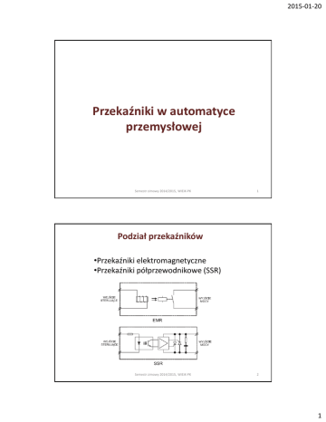 2015-01-20 Przekaźniki w automatyce przemysłowej Semestr zimowy 2014/2015, WIEiK-PK 1 Podział przekaźników •Przekaźniki elektromagnetyczne •Przekaźniki półprzewodnikowe (SSR) Semestr zimowy 2014/2015, WIEiK-PK 2 1 2015-01-20 Przekaźniki elektromagnetyczne Podział przekaźników ze względu na: • napięcie cewki – stałoprądowe DC 5V, 12V 24V, 48V, zmiennoprądowe AC 12V, 24V, 110V, 230V • parametry napięciowo-prądowe obwodu styków dla prądu DC (5A/48Vdc) i AC (do 20A/240V) • układ wyprowadzeń styków • liczbę cewek – bistabilne, monostabilne • sposób montażu – do podstawki , do montażu na płytce drukowanej (PCB) • wielkość – subminiaturowe, miniaturowe, standardowe, samochodowe • budowę mechanizmu cewki – standardowe, kontraktonowe Semestr zimowy 2014/2015, WIEiK-PK 3 Układ wyprowadzeń styków jeden styk (SPST - COM, NO), jeden styk przełączalny (SPDT - COM, NC, NO), podwójny zespół styków DPST, podwójny zespół styków przełączalnych DPDT Semestr zimowy 2014/2015, WIEiK-PK 4 2 2015-01-20 Przekaźnik monostabilny i bistabilny Semestr zimowy 2014/2015, WIEiK-PK 5 Przekaźniki półprzewodnikowe Podział przekaźników półprzewodnikowych ze względu na: • Rodzaj obwodu wyjściowego (prądowego) – tylko DC, tylko AC, DC+AC • parametry napięciowo-prądowe obwodu styków dla prądu DC i AC • układ wyprowadzeń styków – przeważnie jeden styk SPST (COM, NO) • sposób montażu – do montażu na płytce drukowanej (PCB), do montażu na radiatorze, • wielkość – miniaturowe (układ scalony DIP-6, DIP-8, SIP-4), standardowe przykręcane • Rodzaj styku (klucza) wyjściowego – tranzystor bipolarny NPN, PNP, tranzystor Mosfet, tranzystor IGBT, triak, dwa tyrystory Semestr zimowy 2014/2015, WIEiK-PK 6 3 2015-01-20 Miniaturowe przekaźniki półprzewodnikowe Obwód dla prądu obciążenia AC lub DC Obwód dla prądu obciążenia tylko DC Semestr zimowy 2014/2015, WIEiK-PK 7 Przykład przekaźnika półprzewodnikowego z wyjściem na tranzystorach MOSFET Przekaźnik scalony LH1532, firmy Vishay Przekaźnik scalony LH1510, firmy Vishay Semestr zimowy 2014/2015, WIEiK-PK 8 4 2015-01-20 Obwody główne przekaźników półprzewodnikowych mocy Przekaźnik typu AC, załączanie w zerze napięcia zasilania (triak) Przekaźnik typu DC, na tranzystorze bipolarnym Przekaźnik typu AC, załączanie w zerze napięcia zasilania (dwa tyrystory) Przekaźnik typu DC, na tranzystorze MOSFET Semestr zimowy 2014/2015, WIEiK-PK 9 Sposoby załączania przekaźnika SSR (SSR - Solid State Relay) ZS Sygnały sterujące: DC – 3Vdc-32Vdc AC – 24Vac-230Vac Analogowe - 4-20mA lub 0-10V AS 0-10V 4-20mA Semestr zimowy 2014/2015, WIEiK-PK 10 5 2015-01-20 Sposoby załączania przekaźnika SSR Załączanie w maksimum napięcia dla transformatorów Załączanie w dowolniej chwili Semestr zimowy 2014/2015, WIEiK-PK 11 SSR średniej mocy Semestr zimowy 2014/2015, WIEiK-PK 12 6 2015-01-20 SSR średniej mocy Semestr zimowy 2014/2015, WIEiK-PK 13 SSR dużej mocy Semestr zimowy 2014/2015, WIEiK-PK 14 7 2015-01-20 Przekaźniki dużej mocy SSR – jednofazowe i trójfazowe Semestr zimowy 2014/2015, WIEiK-PK 15 Porównanie przekaźników elektromechanicznych i półprzewodnikowych Zalety przekaźników półprzewodnikowych • SSR są szybsze, czas załączenia i wyłączenia około kilka do kilkunastu mikrosekund • Brak elementów ruchomych, większa żywotność • Przy przełączaniu nie wydzielają opar (brak łuku elektrycznego), nie ma drgań zestyków • Mniejsze generowane zakłócenia w trakcie przełączenia • Mogą być używane w środowisku agresywnym, wybuchowym (brak łuku elektrycznego) • Cicha praca – brak elementów ruchomych • Mniejsze wymiary przy podobnych parametrach łączeniowych • Możliwość wykonania w postaci układu scalonego – łatwy montaż • Mniejsza moc potrzebna do załączenia Wady • Mniej odporne na przeciążenia, zwarcia, przepięcia, przetężenia • Generują większe zakłócenia w trakcie przewodzenia (triak, tyrystor) • Większe straty mocy w stanie przewodzenia – wymagają radiatorów • Mniejsza rezystancja izolacji w stanie wyłączenia • Występowanie wstecznego prądu upływu w stanie otwarcia (zakres µA ) • Większy koszt w porównaniu z przekaźnikiem elektromechanicznym • Wymagają dodatkowego napięcia zasilania obwodu bramki • Większy czas odzysku stanu otwarcia (Transient Reverse Recovery time (Trr) z powodu występowania diody w strukturze • Dostępny tylko jeden styk zwierny Semestr zimowy 2014/2015, WIEiK-PK 16 8