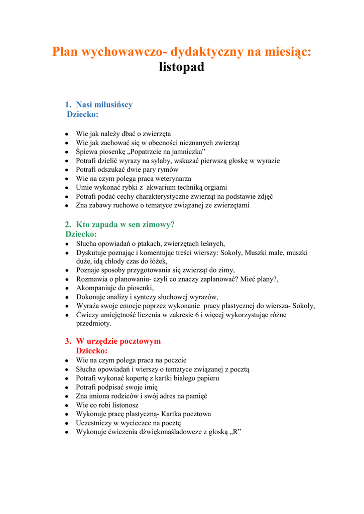 Plan wychowawczo- dydaktyczny na miesiąc: listopad 1. Nasi milusińscy Dziecko: Wie jak należy dbać o zwierzęta Wie jak zachować się w obecności nieznanych zwierząt Śpiewa piosenkę „Popatrzcie na jamniczka” Potrafi dzielić wyrazy na sylaby, wskazać pierwszą głoskę w wyrazie Potrafi odszukać dwie pary rymów Wie na czym polega praca weterynarza Umie wykonać rybki z akwarium techniką orgiami Potrafi podać cechy charakterystyczne zwierząt na podstawie zdjęć Zna zabawy ruchowe o tematyce związanej ze zwierzętami 2. Kto zapada w sen zimowy? Dziecko: Słucha opowiadań o ptakach, zwierzętach leśnych, Dyskutuje poznając i komentując treści wierszy: Sokoły, Muszki małe, muszki duże, idą chłody czas do łóżek, Poznaje sposoby przygotowania się zwierząt do zimy, Rozmawia o planowaniu- czyli co znaczy zaplanować? Mieć plany?, Akompaniuje do piosenki, Dokonuje analizy i syntezy słuchowej wyrazów, Wyraża swoje emocje poprzez wykonanie pracy plastycznej do wiersza- Sokoły, Ćwiczy umiejętność liczenia w zakresie 6 i więcej wykorzystując różne przedmioty. 3. W urzędzie pocztowym Dziecko: Wie na czym polega praca na poczcie Słucha opowiadań i wierszy o tematyce związanej z pocztą Potrafi wykonać kopertę z kartki białego papieru Potrafi podpisać swoje imię Zna imiona rodziców i swój adres na pamięć Wie co robi listonosz Wykonuje pracę plastyczną- Kartka pocztowa Uczestniczy w wycieczce na pocztę Wykonuje ćwiczenia dźwiękonaśladowcze z głoską „R” 4. Kiedy mamy dość jesieni , chcemy świat w różowy zmienić. Dziecko: Rozwiązuje zagadki słuchowe, Tworzy rymy, Rozwija umiejętność czytania globalnego: porównuje wyrazy, dzieli na sylaby, określa głoski na początku wyrazu, Rozwija mowę poprzez słuchanie pięknych , lirycznych wierszy, opowiadań o jesiennych szarościach, różowych okularach, modzie, Utrwala nazwy miesięcy, Bawi się w teatr wykorzystując wiersz – Porozmawiajmy o miesiącach- planujemy role, Tworzy własne fantastyczne kolaże – Świat w różowym kolorze.