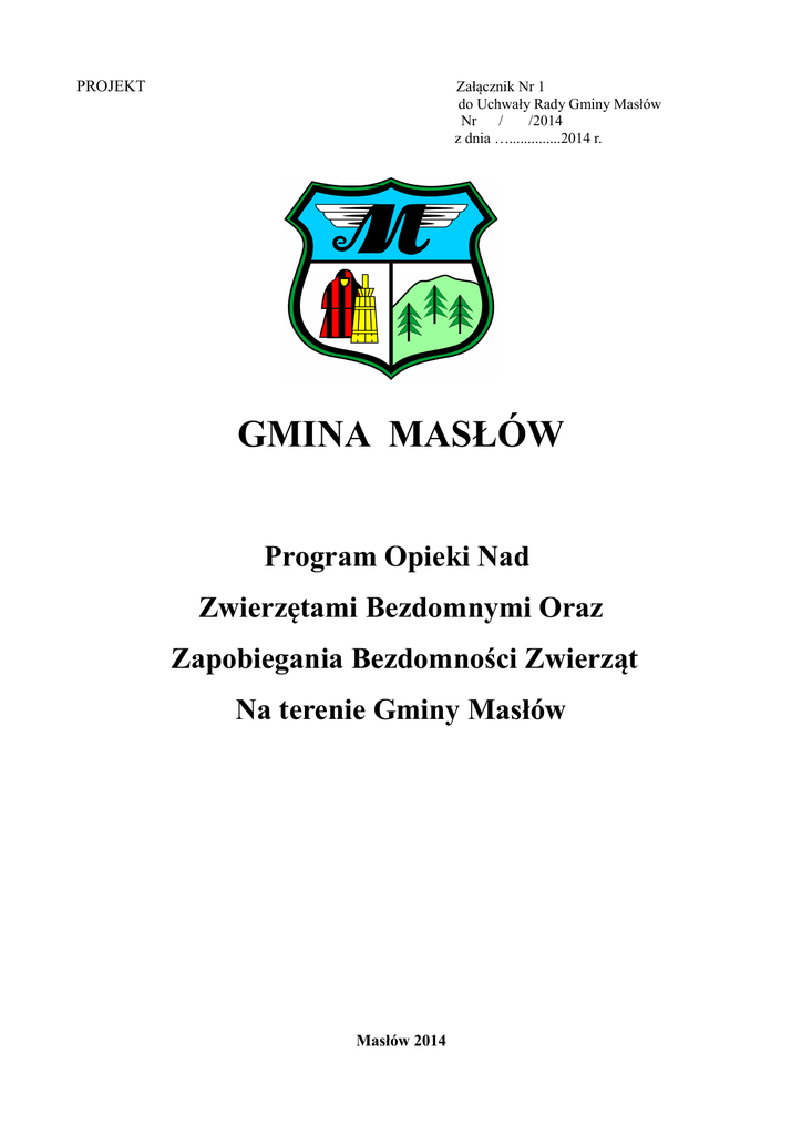 PROJEKT Załącznik Nr 1 do Uchwały Rady Gminy Masłów Nr / /2014 z dnia …..............2014 r. GMINA MASŁÓW Program Opieki Nad Zwierzętami Bezdomnymi Oraz Zapobiegania Bezdomności Zwierząt Na terenie Gminy Masłów Masłów 2014 SPIS TREŚCI 1. Wprowadzenie. 1.1 Podstawa Prawna. 1.2 Cel programu. 1.3 Zakres programu. 2. Formy i sposoby realizacji programu. 2.1 Zapewnienie opieki bezdomnym zwierzętom oraz odławianie bezdomnych zwierząt. 2.2 Zmniejszenie populacji bezdomnych zwierząt. 2.3 Adopcja bezdomnych psów i kotów. 2.4 Edukacja 3. Podsumowanie. 1. Wprowadzenie. Posiadanie psa lub kota wymaga od właściciela podporządkowania się ogólnie przyjętym zasadom współżycia społecznego i obowiązującym przepisom prawa w zakresie ochrony zwierząt. Stosunek człowieka do zwierząt oraz warunki w jakich zwierzęta bytują, a także problem niekontrolowanego rozmnażania się zwierząt bezdomnych jak również domowych w szczególności psów i kotów to problematyka, którą zajmują się organizacje rządowe i pozarządowe na całym świecie. Obowiązkiem ludzi jest ochrona i opieka nad zwierzętami, jako istotami zdolnymi do odczuwania bólu, a co za tym idzie obowiązkiem jest sprawowanie skutecznej kontroli nad liczebnością populacji tych zwierząt. Bezdomność zwierząt jest zjawiskiem społecznym, którego głównymi przyczynami są: 1) porzucanie zwierząt przez właścicieli, 2) niekontrolowane rozmnażanie, 3) ucieczki zwierząt, 4) łatwość pozyskiwania zwierząt, 5) niewystarczająca edukacja i wiedza w zakresie metod zapobiegania bezdomności, ze szczególnym uwzględnieniem sterylizacji i kastracji. W celu realizacji zadań określonych przepisami, właściwe organy administracji rządowej i samorządu terytorialnego współdziałają z samorządem lekarsko - weterynaryjnym, Państwową Inspekcją Weterynaryjną oraz innymi instytucjami i organizacjami społecznymi, których statutowymi celami są działania na rzecz ochrony zwierząt. 1.1 Podstawa prawna. Podstawą prawną opracowania programu są: Ustawa z dnia 8 marca 1990 r. o samorządzie gminnym (tj. Dz. U z 2013 poz. 954 ze zm.) Ustawa z dnia 11 marca 2004 r. o ochronie zdrowia zwierząt oraz zwalczaniu chorób zakaźnych zwierząt (tj Dz. U z 2008 r. Nr 213 poz. 1342 ze zm.) Ustawa z dnia 21 sierpnia 1997 r. o ochronie zwierząt (Dz. U z 2013 r. poz. 856) Ustawa z dnia 13 września 1996 r. o utrzymaniu czystości i porządku w gminach (Dz. U z 2012 r. poz 391) Rozporządzenie Ministra Rolnictwa i Rozwoju Wsi z dnia 13 mają 2005 r. w sprawie znakowania psów, kotów i zwierząt naczelnych (dz. U. 2005 r. Nr 95, poz. 801) Uchwałą Nr XXVIII/205/2012 Rady Gminy w Masłowie z dnia 20 grudnia 2012 r. w sprawie regulaminu utrzymania czystości i porządku na terenie Gminy Masłów. 1.2 Cel programu. Celem programu jest realizacja zadań własnych polegających na zapobieganiu bezdomności zwierząt oraz opieki nad zwierzętami bezdomnymi poprzez: 1) prowadzenie działań służących zapewnieniu odpowiedniej opieki bezdomnym zwierzętom z terenu gminy a w szczególności poszukiwanie nowych właścicieli dla psów. 2) ograniczenie niekontrolowanego przyrostu liczebności bezdomnych psów i kotów, 3) współpracę z organizacjami społecznymi działających na rzecz przeciwdziałania bezdomności zwierząt, 4) współpraca z Inspekcją Weterynaryjną i samorządem lekarsko-weterynaryjnym, a także osobami, które podejmują działania zmierzające do poprawy bytowania zwierząt. 1.3 Zakres programu. Program obejmuje wszelkie działania Gminy , które mają za zadnie realizację założonych celów poprzez: odławianie bezdomnych zwierząt w szczególności chorych lub powodujących zagrożenie z terenu Gminy, zapewnienie opieki bezdomnym zwierzętom, dążenie do zmniejszenia populacji bezdomnych zwierząt, edukację mieszkańców Gminy w zakresie opieki nad zwierzętami, współpracę z organizacjami społecznymi działających na rzecz przeciwdziałania bezdomności zwierząt, współpracę z samorządami i instytucjami administracji publicznej, współprace z organami stojącymi na straży przestrzegania prawa, inne działania służące osiąganiu założonych w programie celów. Na realizację zadań zawartych w Programie Opieki Nad Zwierzętami Bezdomnymi Oraz Zapobiegania Bezdomności Zwierząt Na terenie Gminy Masłów na rok 2014 planuje się kwotę w wysokości 40.000,00 zł.. 2. Formy i sposoby realizacji programu. 2.1 Zapewnienie opieki bezdomnym zwierzętom oraz odławianie bezdomnych zwierząt. Zapewnienie ochrony zwierząt domowych oraz odławianie bezdomnych zwierząt i opieki nad bezdomnymi zwierzętami, na terenie gminy Masłów realizowane będzie w miarę możliwości technicznych i finansowych. Art. 4 pkt 16) Ustawy z dnia 21 sierpnia 1997 r. o ochronie zwierząt (Dz. U. Z 2003 r. Nr 106, poz. 1002 ze zm.) określa, ilekroć mowa o „zwierzętach bezdomnych” - rozumie się przez to zwierzęta domowe lub gospodarskie, które uciekły, zabłąkały się lub zostały porzucone przez człowieka, a nie ma możliwości ustalenia ich właściciela lub innej osoby, pod której opieką trwale dotąd pozostawały. Odławianie bezdomnych zwierząt będzie się odbywało po wcześniejszym zgłoszeniu, które w miarę możliwości zostanie potwierdzone pisemnie przez zgłaszającego. Zgłoszenia będą przyjmowane w: Urzędzie Gminy Masłów w godzinach pracy Urzędu tel. 41 311-00-96, 41 311-00-60 po godzinach pracy tel 535 50 11 22 lub 606 75 85 68. pod nr 112, Komisariat Policji w Kielcach poza godzinami pracy Urzędu Gminy Masłów, w godzinach nocnych i w dni wolne od pracy. Osoba, zgłaszająca bezdomne zwierzę, zobowiązana jest do podania własnych danych osobowych oraz udzielania niezbędnych informacji mogących pomóc w identyfikacji i wyłapaniu psa oraz ewentualnego ustalenia właściciela bądź opiekuna zwierzęcia. Gmina Masłów podpisała umowę z Gabinetem Weterynaryj