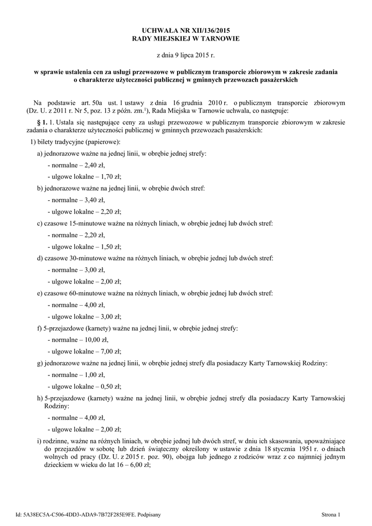 UCHWAŁA NR XII/136/2015 RADY MIEJSKIEJ W TARNOWIE z dnia 9 lipca 2015 r. w sprawie ustalenia cen za usługi przewozowe w publicznym transporcie zbiorowym w zakresie zadania o charakterze użyteczności publicznej w gminnych przewozach pasażerskich Na podstawie art. 50a ust. 1 ustawy z dnia 16 grudnia 2010 r. o publicznym transporcie zbiorowym (Dz. U. z 2011 r. Nr 5, poz. 13 z późn. zm.1), Rada Miejska w Tarnowie uchwala, co następuje: § 1. 1. Ustala się następujące ceny za usługi przewozowe w publicznym transporcie zbiorowym w zakresie zadania o charakterze użyteczności publicznej w gminnych przewozach pasażerskich: 1) bilety tradycyjne (papierowe): a) jednorazowe ważne na jednej linii, w obrębie jednej strefy: - normalne – 2,40 zł, - ulgowe lokalne – 1,70 zł; b) jednorazowe ważne na jednej linii, w obrębie dwóch stref: - normalne – 3,40 zł, - ulgowe lokalne – 2,20 zł; c) czasowe 15-minutowe ważne na różnych liniach, w obrębie jednej lub dwóch stref: - normalne – 2,20 zł, - ulgowe lokalne – 1,50 zł; d) czasowe 30-minutowe ważne na różnych liniach, w obrębie jednej lub dwóch stref: - normalne – 3,00 zł, - ulgowe lokalne – 2,00 zł; e) czasowe 60-minutowe ważne na różnych liniach, w obrębie jednej lub dwóch stref: - normalne – 4,00 zł, - ulgowe lokalne – 3,00 zł; f) 5-przejazdowe (karnety) ważne na jednej linii, w obrębie jednej strefy: - normalne – 10,00 zł, - ulgowe lokalne – 7,00 zł; g) jednorazowe ważne na jednej linii, w obrębie jednej strefy dla posiadaczy Karty Tarnowskiej Rodziny: - normalne – 1,00 zł, - ulgowe lokalne – 0,50 zł; h) 5-przejazdowe (karnety) ważne na jednej linii, w obrębie jednej strefy dla posiadaczy Karty Tarnowskiej Rodziny: - normalne – 4,00 zł, - ulgowe lokalne – 2,00 zł; i) rodzinne, ważne na różnych liniach, w obrębie jednej lub dwóch stref, w dniu ich skasowania, upoważniające do przejazdów w sobotę lub dzień świąteczny określony w ustawie z dnia 18 stycznia 1951 r. o dniach wolnych od pracy (Dz. U. z 2015 r. poz. 90), obojga lub jednego z rodziców wraz z co najmniej jednym dzieckiem w wieku do lat 16 – 6,00 zł; Id: 5A38EC5A-C506-4DD3-ADA9-7B72F285E9FE. Podpisany Strona 1 2) bilety elektroniczne odległościowe dla posiadaczy Tarnowskiej Karty Miejskiej w wersji premium, opłacane na podstawie ilości i lokalizacji przejechanych przystanków, liczonych na podstawie rejestracji wejścia i wyjścia z pojazdu: a) przejazd do trzech przystanków: - normalne – 1,20 zł, - ulgowe lokalne – 1,00 zł; b) przejazd od 4 do 8 przystanków: - normalne – 1,80 zł, - ulgowe lokalne – 1,40 zł; c) przejazd od 9 do 16 przystanków: - normalne – 2,00 zł, - ulgowe lokalne – 1,50 zł; d) przejazd od 17 do 25 przystanków: - normalne – 2,20 zł, - ulgowe lokalne – 1,60 zł; e) przejazd powyżej 25 przystanków: - normalne – 2,40 zł, - ulgowe lokalne – 1,70 zł; f) przesiadkowe – w których należność naliczona jest wtedy, gdy przejazd następnym autobusem rozpocznie się w ciągu 15 minut od zarejestrowania wyjścia w poprzednim autobusie: - normalne – 1,20 zł, - ulgowe lokalne – 1,00 zł; 3) bilety elektroniczne odległościowe dla posiadaczy Tarnowskiej Karty Miejskiej w wersji standard, opłacane na podstawie ilości i lokalizacji przejechanych przystanków, liczonych na podstawie rejestracji wejścia i wyjścia z pojazdu: a) przejazd do trzech przystanków: - normalne – 1,40 zł, - ulgowe lokalne – 1,20 zł; b) przejazd od 4 do 8 przystanków: - normalne – 2,20 zł, - ulgowe lokalne – 1,50 zł; c) przejazd od 9 do 16 przystanków: - normalne – 2,50 zł, - ulgowe lokalne – 1,60 zł; d) przejazd od 17 do 25 przystanków: - normalne – 2,80 zł, - ulgowe lokalne – 1,80 zł; e) przejazd powyżej 25 przystanków: - normalne – 3,20 zł, - ulgowe lokalne – 2,00 zł; Id: 5A38EC5A-C506-4DD3-ADA9-7B72F285E9FE. Podpisany Strona 2 f) przesiadkowe – w których należność naliczona jest wtedy, gdy przejazd następnym autobusem rozpocznie się w ciągu 15 minut od zarejestrowania wyjścia w poprzednim autobusie: - normalne – 1,40 zł, - ulgowe lokalne – 1,20 zł. 2. Ustala się ceny biletów okresowych imiennych i na okaziciela, ważnych w obrębie jednej lub dwóch stref stanowiące załącznik nr 1 do uchwały. § 2. Ustala się wykaz granic stref, od przekroczenia których uzależniona jest wysokość cen za usługi przewozowe, stanowiący załącznik nr 2 do uchwały. § 3. Ustala się wykaz osób posiadających uprawnienia do bezpłatnych i ulgowych przejazdów w komunikacji miejskiej stanowiący załącznik nr 3 do uchwały. § 4. Traci moc uchwała Nr XXVIII/403/2012 Rady Miejskiej w Tarnowie z dnia 29 listopada 2012 r. w sprawie ustalenia cen urzędowych za usługi przewozowe w publicznym transporcie zbiorowym w zakresie zadania o charakterze użyteczności publicznej w gminnych przewozach pasażerskich (Dz. Urz. Woj. Małop. z 2012 r. poz. 7207). § 5. Wykonanie uchwały powierza się Prezydentowi Miasta Tarnowa. § 6. Uchwała podlega ogłoszeniu w Dzienniku Urzędowym Województwa Małopolskiego. § 7. Uchwała wchodzi w życie z dniem 1 września 2015 roku, z wyjątkiem § 1 ust. 1 pkt 2 i 3, które wchodzą w życie z dniem 1 lutego 2016 roku. Przewodniczący Rady Miejskiej w Tarnowie Kazimierz Koprowski 1] Zmiany wymienionej ustawy zostały ogłoszone w Dz. U. z 2011 r. Nr 228, poz. 1368, z 2014 r. poz. 423 i 915 oraz z 2015 r. poz. 390. Id: 5A38EC5A-C506-4DD3-ADA9-7B72F285E9FE. Podpisany Strona 3 Załącznik Nr 1 do Uchwały Nr XII/136/2015 Rady Miejskiej w Tarnowie z dnia 9 lipca 2015 r. CZĘŚĆ I. Ceny biletów okresowych imiennych i na okaziciela, ważnych w obrębie jednej lub dwóch stref Lp. 1. 2-tygodniowe imienne Rodzaj biletu 2. 1-miesięczne imienne 3. 3-miesięczne imienne 4. 5-miesięczne imienne 5. 1-miesięczne na okaziciela na jedną linię na dwie linie na wszystkie linie na jedną linię na dwie li