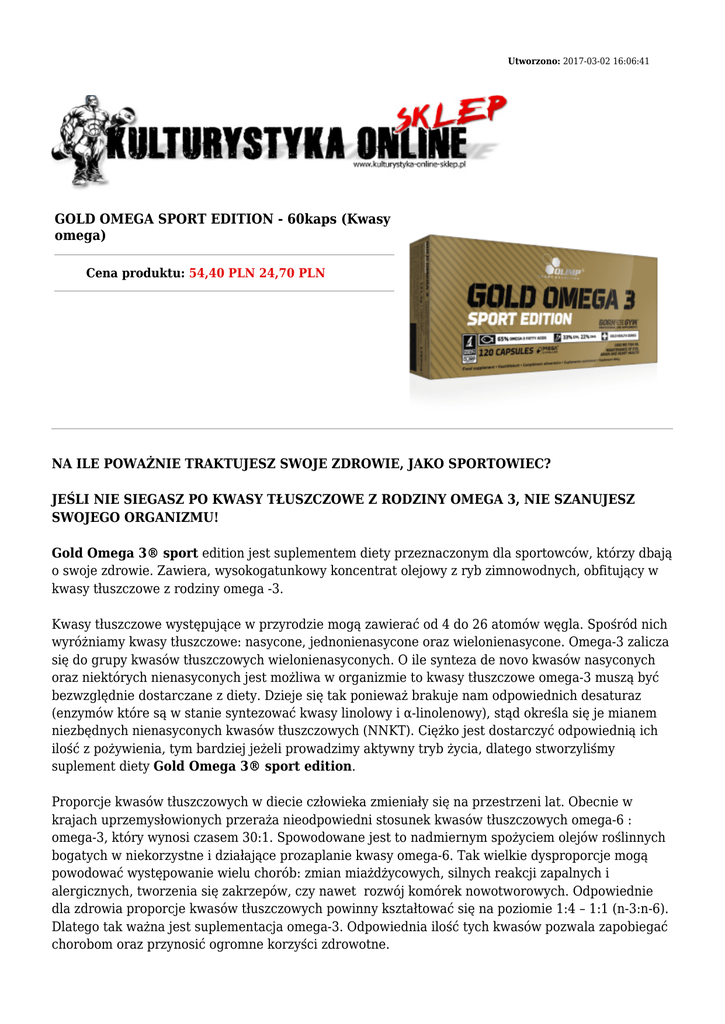 Utworzono: 2017-03-02 16:06:41 GOLD OMEGA SPORT EDITION - 60kaps (Kwasy omega) Cena produktu: 54,40 PLN 24,70 PLN NA ILE POWAŻNIE TRAKTUJESZ SWOJE ZDROWIE, JAKO SPORTOWIEC? JEŚLI NIE SIEGASZ PO KWASY TŁUSZCZOWE Z RODZINY OMEGA 3, NIE SZANUJESZ SWOJEGO ORGANIZMU! Gold Omega 3® sport edition jest suplementem diety przeznaczonym dla sportowców, którzy dbają o swoje zdrowie. Zawiera, wysokogatunkowy koncentrat olejowy z ryb zimnowodnych, obfitujący w kwasy tłuszczowe z rodziny omega -3. Kwasy tłuszczowe występujące w przyrodzie mogą zawierać od 4 do 26 atomów węgla. Spośród nich wyróżniamy kwasy tłuszczowe: nasycone, jednonienasycone oraz wielonienasycone. Omega-3 zalicza się do grupy kwasów tłuszczowych wielonienasyconych. O ile synteza de novo kwasów nasyconych oraz niektórych nienasyconych jest możliwa w organizmie to kwasy tłuszczowe omega-3 muszą być bezwzględnie dostarczane z diety. Dzieje się tak ponieważ brakuje nam odpowiednich desaturaz (enzymów które są w stanie syntezować kwasy linolowy i α-linolenowy), stąd określa się je mianem niezbędnych nienasyconych kwasów tłuszczowych (NNKT). Ciężko jest dostarczyć odpowiednią ich ilość z pożywienia, tym bardziej jeżeli prowadzimy aktywny tryb życia, dlatego stworzyliśmy suplement diety Gold Omega 3® sport edition. Proporcje kwasów tłuszczowych w diecie człowieka zmieniały się na przestrzeni lat. Obecnie w krajach uprzemysłowionych przeraża nieodpowiedni stosunek kwasów tłuszczowych omega-6 : omega-3, który wynosi czasem 30:1. Spowodowane jest to nadmiernym spożyciem olejów roślinnych bogatych w niekorzystne i działające prozaplanie kwasy omega-6. Tak wielkie dysproporcje mogą powodować występowanie wielu chorób: zmian miażdżycowych, silnych reakcji zapalnych i alergicznych, tworzenia się zakrzepów, czy nawet rozwój komórek nowotworowych. Odpowiednie dla zdrowia proporcje kwasów tłuszczowych powinny kształtować się na poziomie 1:4 – 1:1 (n-3:n-6). Dlatego tak ważna jest suplementacja omega-3. Odpowiednia ilość tych kwasów pozwala zapobiegać chorobom oraz przynosić ogromne korzyści zdrowotne. Dwa najważniejsze i najaktywniejsze kwasy występujące w suplemencie Gold Omega 3® sport edition to kwas eikozapenaenowy (EPA) i dokozaheksaenowy (DHA). Wyniki wielu badań dowodzą, że przyjmowanie nawet małych dawek kwasów omega-3 wykazuje korzystny wpływ na pracę układu sercowo-naczyniowego. Dodatkowo ich podaż w diecie wpływa na obniżenie poziomu trójglicerydów oraz podwyższenie stężenia lipoprotein o wysokiej gęstości, czyli „dobrego cholesterolu” (HDL), a także zmniejszenie się krzepliwości krwi. Dzięki nim wzrasta przepuszczalność i płynność błon komórkowych. SZEROKIE SPEKTRUM DZIAŁANIA Gold Omega 3® sport edition: W jaki sposób kwasy omega-3 wpływają na poziom cholesterolu i choroby sercowo-naczyniowe? Rezultaty wielu badań dowodzą, że przyjmowanie nawet małych dawek kwasów omega-3 wykazuje korzystny wpływ na pracę układu sercowo-naczyniowego. Dodatkowa ich podaż w diecie wpływa na obniżenie poziomu trójglicerydów oraz podwyższenie korzystnego cholesterolu HDL i zmniejszenie krzepliwości krwi, co wpływa ochronnie na pracę serca i układu krążenia. Na jakiej zasadzie kwasy omega-3 zapobiegają stanom zapalnym, zakrzepicy i miażdżycy? Kwasy omega-3 zwiększają poziom inhibitora agregacji płytek, czyli prostaglandyn-3 (PGE3). Dodatkowo EPA i DHA zwiększają stężenie tkankowego aktywatora plazminogenu, który jest bardzo trombolityczną substancją, powodującą rozpuszczenie się skrzepu., W dużych dawkach mogą mieć zastosowanie w leczeniu choroby zatorowo-zakrzepowej. Suplementacja kwasami tłuszczowymi omega-3 hamuje także syntezę prozapalnych cytokin m.in. TNF-α czy IL-1. Gold Omega 3® sport edition to idealny wybór przy kontuzjach i problemach ze stawami. Na jakiej zasadzie kwasy omega-3 wspomagają funkcjonowanie układu nerwowego? Kwasy tłuszczowe z rodziny omega-3 odpowiadają za prawidłowe funkcjonowanie neuronów. Są ważnym składnikiem wysokoaktywnej tkanki nerwowej, zwłaszcza kory mózgowej i siatkówki. DHA gwarantuje prawidłową pracę białek odpowiedzialnych za przekazywanie i odbieranie impulsów nerwowych. Duża ilość DHA w błonie neuronów zwiększa w niej ilość fosfadyloseryny, zapewniając lepszą przeżywalność komórek nerwowych oraz odporność na działanie szkodliwych czynników. Zwiększenie ich spożycia skutecznie wpływa na poprawę nastroju, a także odgrywa ważną rolę w rozwoju układu nerwowego. Czy kwasy omega-3 mogą wspomagać redukcję tkanki tłuszczowej? Kwasy tłuszczowe omega-3 to jeden z kluczowych składników diety wspomagającej odchudzanie. U osób systematycznie spożywających zalecaną dawkę kwasów omega-3 stwierdza się ubytek masy tłuszczowej ciała i zmniejszenie wskaźnika BMI. Kwasy omega-3 wywierają hamujący wpływ na tworzenie tkanki tłuszczowej, a także aktywnie mobilizują jej rozpad. Na jakiej zasadzie kwasy omega-3 ochraniają wątrobę? Ostatnie doniesienia potwierdzają skuteczność kwasów tłuszczowych omega-3 w hamowaniu wzrostu guzów nowotworowych wątroby, zwiększaniu skuteczności chemioterapii i ochronie przed jej toksycznym działaniem. Bezsprzecznie, więc suplementacja Gold Omega 3® sport edition będzie polecana osobom, które stosowały niedozwolony doping, powodujący zachwianie wewnętrznej równowagi organizmu. Optymalna dawka i pora stosowania: 1 kapsułka dziennie, najlepiej do posiłku zawierającego tłuszcz. Nie należy przekraczać zalecanej dziennej porcji do spożycia w ciągu dnia. Suplement diety nie może być stosowany jako substytut zróżnicowanej diety. Gold Omega 3® sport edition najlepiej stosować z suplementami prozdrowotnymi marki Olimp Laboratories. Przy ciężkich treningach warto zadbać również o uzupełnienie witamin i minerałów w odpowiednio dobranych 