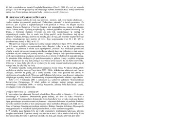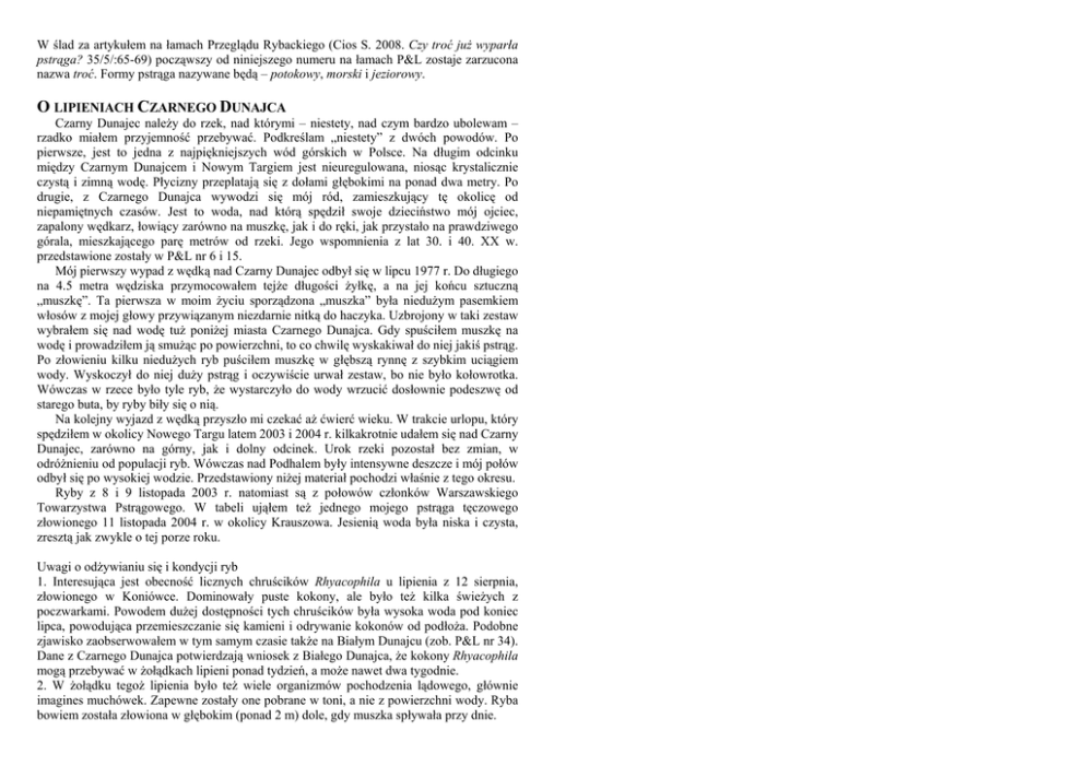 W ślad za artykułem na łamach Przeglądu Rybackiego (Cios S. 2008. Czy troć już wyparła pstrąga? 35/5/:65-69) począwszy od niniejszego numeru na łamach P&L zostaje zarzucona nazwa troć. Formy pstrąga nazywane będą – potokowy, morski i jeziorowy. O LIPIENIACH CZARNEGO DUNAJCA Czarny Dunajec należy do rzek, nad którymi – niestety, nad czym bardzo ubolewam – rzadko miałem przyjemność przebywać. Podkreślam „niestety” z dwóch powodów. Po pierwsze, jest to jedna z najpiękniejszych wód górskich w Polsce. Na długim odcinku między Czarnym Dunajcem i Nowym Targiem jest nieuregulowana, niosąc krystalicznie czystą i zimną wodę. Płycizny przeplatają się z dołami głębokimi na ponad dwa metry. Po drugie, z Czarnego Dunajca wywodzi się mój ród, zamieszkujący tę okolicę od niepamiętnych czasów. Jest to woda, nad którą spędził swoje dzieciństwo mój ojciec, zapalony wędkarz, łowiący zarówno na muszkę, jak i do ręki, jak przystało na prawdziwego górala, mieszkającego parę metrów od rzeki. Jego wspomnienia z lat 30. i 40. XX w. przedstawione zostały w P&L nr 6 i 15. Mój pierwszy wypad z wędką nad Czarny Dunajec odbył się w lipcu 1977 r. Do długiego na 4.5 metra wędziska przymocowałem tejże długości żyłkę, a na jej końcu sztuczną „muszkę”. Ta pierwsza w moim życiu sporządzona „muszka” była niedużym pasemkiem włosów z mojej głowy przywiązanym niezdarnie nitką do haczyka. Uzbrojony w taki zestaw wybrałem się nad wodę tuż poniżej miasta Czarnego Dunajca. Gdy spuściłem muszkę na wodę i prowadziłem ją smużąc po powierzchni, to co chwilę wyskakiwał do niej jakiś pstrąg. Po złowieniu kilku niedużych ryb puściłem muszkę w głębszą rynnę z szybkim uciągiem wody. Wyskoczył do niej duży pstrąg i oczywiście urwał zestaw, bo nie było kołowrotka. Wówczas w rzece było tyle ryb, że wystarczyło do wody wrzucić dosłownie podeszwę od starego buta, by ryby biły się o nią. Na kolejny wyjazd z wędką przyszło mi czekać aż ćwierć wieku. W trakcie urlopu, który spędziłem w okolicy Nowego Targu latem 2003 i 2004 r. kilkakrotnie udałem się nad Czarny Dunajec, zarówno na górny, jak i dolny odcinek. Urok rzeki pozostał bez zmian, w odróżnieniu od populacji ryb. Wówczas nad Podhalem były intensywne deszcze i mój połów odbył się po wysokiej wodzie. Przedstawiony niżej materiał pochodzi właśnie z tego okresu. Ryby z 8 i 9 listopada 2003 r. natomiast są z połowów członków Warszawskiego Towarzystwa Pstrągowego. W tabeli ująłem też jednego mojego pstrąga tęczowego złowionego 11 listopada 2004 r. w okolicy Krauszowa. Jesienią woda była niska i czysta, zresztą jak zwykle o tej porze roku. Uwagi o odżywianiu się i kondycji ryb 1. Interesująca jest obecność licznych chruścików Rhyacophila u lipienia z 12 sierpnia, złowionego w Koniówce. Dominowały puste kokony, ale było też kilka świeżych z poczwarkami. Powodem dużej dostępności tych chruścików była wysoka woda pod koniec lipca, powodująca przemieszczanie się kamieni i odrywanie kokonów od podłoża. Podobne zjawisko zaobserwowałem w tym samym czasie także na Białym Dunajcu (zob. P&L nr 34). Dane z Czarnego Dunajca potwierdzają wniosek z Białego Dunajca, że kokony Rhyacophila mogą przebywać w żołądkach lipieni ponad tydzień, a może nawet dwa tygodnie. 2. W żołądku tegoż lipienia było też wiele organizmów pochodzenia lądowego, głównie imagines muchówek. Zapewne zostały one pobrane w toni, a nie z powierzchni wody. Ryba bowiem została złowiona w głębokim (ponad 2 m) dole, gdy muszka spływała przy dnie. -2Tabela 1. Zawartość żołądków 9 lipieni i jednego pstrąga tęczowego (11.XI) złowionych w Czarnym Dunajcu (skróty: l – larwa, k – kokon, p – poczwarka, im – imago, w – wylinki, x niepoliczone). 2003 2003 2003 2004 2004 2004 2004 12.VIII 8.XI 9.XI 24.VII 27.VII 11.VIII 11.XI Liczba ryb: 1 1 1 1 3 2 1 Chruściki Rhyacophila l 2 2 2 Rhyacophila k + p 21 1 R. nubila1) l 1 Psychomyia pusilla l 1 Hydropsyche l 36 1 Polycentropus flavomaculatus l 3 Hydroptila l 1 n. det. l 1 1 Jętki Baetis l 131 9 3 60 6 1 Oligoneuriella rhenana l 25 91 26 Oligoneuriella rhenana w 6 Heptageniidae l 11 58 10 6 Heptageniidae w x 2 Seratella ignita l 3 11 30 8 S. ignita im 1 Leptophlebiidae l 1 Muchówki Chironomidae (ochotki) l 6 1 1 3 1 Chironomidae p 6 6 1 Chironomidae im 14 1 Simuliidae (meszki) l 20 4 1 Atherix ibis l 1 n. det. l 1 2 Widelnice Leuctra l 15 Perlodidae l 5 4 2 Perlodes microcephala2) l P. microcephala w 2 Dinocras megacephala2) l 6 1 2 n. det. l 1 Sialis l 1 Hydracarina (wodopójka) 2 1 Ancylus fluviatilis (przytulik) 3 Bezkręgowce lądowe Heteroptera (pluskwiaki) 1 Hymenoptera (błonkówki) 3 Formicidae (mrówki) 1 1 1 Homoptera (pluskwiaki) 4 -3Aphidae (mszyce) Diptera im (muchówki) Diptera p Aranei (pająki) Razem Liczba ofiar na 1 lipienia 1) 2) 2 21 2 2 241 241 88 88 78 78 51 51 204 68 49 25 12 12 Det. E. Buczyńska Det. dr M. Kłonowska-Olejnik 3. W żołądku lipienia złowionego 8 listopada tuż powyżej Nowego Targu było stosunkowo dużo wylinek, zwłaszcza jętek z rodziny Heptageniidae. Rzadko się zdarza, by dzikie ryby pobierały wylinki w większej ilości, bo nie mają one wartości energetycznej. Duża ilość fragmentów roślin i drewna, igieł świerków, itp. w żołądkach niektórych lipieni wskazuje, że w pewnych okresach jest mniejsza dostępność pokarmu i lipienie pobierają niemal wszystko, co spływa z wodą. 4. Zwraca uwagę duża liczba larw jętki Oligoneuriella rhenana w żołądkach ryb złowionych powyżej Ludźmierza. Żołądki tych ryb wyglądem przypominały kiełbasę, z uwagi na dużą ilość pokarmu. U jednej ryby z 3 lipca było aż 41 larw tej jętki. 5. Zwraca uwagę obecność dużych widelnic – Perlodes microcephala i Dinocras megacephala, o długości ciała nawet ponad 2 cm. Były to najwi