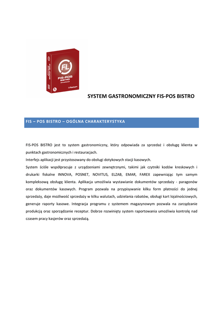 SYSTEM GASTRONOMICZNY FIS-POS BISTRO FIS – POS BISTRO – OGÓLNA CHARAKTERYSTYKA FIS-POS BISTRO jest to system gastronomiczny, który odpowiada za sprzedaż i obsługę klienta w punktach gastronomicznych i restauracjach. Interfejs aplikacji jest przystosowany do obsługi dotykowych stacji kasowych. System ściśle współpracuje z urządzeniami zewnętrznymi, takimi jak czytniki kodów kreskowych i drukarki fiskalne INNOVA, POSNET, NOVITUS, ELZAB, EMAR, FAREX zapewniając tym samym kompleksową obsługę klienta. Aplikacja umożliwia wystawianie dokumentów sprzedaży - paragonów oraz dokumentów kasowych. Program pozwala na przypisywanie kilku form płatności do jednej sprzedaży, daje możliwość sprzedaży w kilku walutach, udzielania rabatów, obsługi kart lojalnościowych, generuje raporty kasowe. Integracja programu z systemem magazynowym pozwala na zarządzanie produkcją oraz sporządzanie receptur. Dobrze rozwinięty system raportowania umożliwia kontrolę nad czasem pracy kasjerów oraz sprzedażą. FIS-POS BISTRO - OGÓLNE FUNKCJONALNOŚCI • • • • • • • Zarządzanie użytkownikami Zarządzanie towarami i cenami Zarządzanie Drukarkami Bonowymi Prosta obsługa, szybka sprzedaż produktów gotowych Interfejs użytkownika w pełni dostosowany do ekranów dotykowych Integracja z urządzeniami fiskalnymi w trybie - protokół POSNET THERMAL INNOVA, POSNET, NOVITUS, ELZAB, EMAR, FAREX Nieograniczona baza produktów, grup towarowych i użytkowników • • • • • • • • • • • • • Klawisze Funkcyjne (F1-F12) Możliwość konfiguracji polityki rabatowej Możliwość obsługi systemu przez kilku kasjerów, kelnerów równocześnie Możliwość zarządzania czasem pracy kelnerów, barmanów i managerów Możliwość tworzenia otwartych rachunków Możliwość wydruku zamówień na drukarkach bonowych Możliwość wydruku rachunków wstępnych na drukarkach bonowych Możliwość zmiany rozmiaru czcionki wyświetlanej listy towarów na paragonie Możliwość dostosowania interfejsu graficznego do potrzeb użytkownika – liczba produktów w pionie i poziomie Automatyczna aktualizacja systemu (wymagany Internet) przy uruchomieniu systemu Możliwość wyszukiwania produktu po nazwie, kodzie krótkim, id, kodzie EAN Drukowanie paragonów w trybie OFF-LINE (Tryb nie ciągły) Konfiguracja stolików (schemat + przypisywanie rachunków do stolików) SPRZEDAŻ - FUNKCJONALNOŚCI • • • • • • • • • • • Ewidencja sprzedaży w formie paragonów Operacje Storno i Anulowanie paragonów Wiele form płatności (jednoczesnych) Zarządzanie przecenami produktów w formie drugiej ceny na dany produkt Zarządzanie rachunkami wstępnymi : przypisanie rachunku wstępnego do wybranego stolika (numer stolika) drukowanie rachunku wstępnego na drukarce systemowej drukowanie rachunku wstępnego na drukarce innova EJ d) w przypadku braku obsługi rachunku wstępnego przez urządzenie fiskalne - automatyczne przełączanie wydruku na domyślną drukarkę systemową e) podział rachunku przedwstępnego na kilka rachunków w obrębie jednego stolika f) automatyczne nadanie numeracji dziesiętnej dla stolika przy podziale rachunku Podgląd historii sprzedaży – lista paragonów sprzedażowych i anulowanych + storna Operacja ZWROT do paragonu przy użyciu dokumentu KW Dokumenty Kasowe (KP i KW) Możliwość definiowania własnych komentarzy do dokumentów KP i KW Blokada sprzedaży towarów (szt.) w formie dziesiętnej Operacja ZWROT do paragonu przy użyciu dokumentu KW • Możliwość ustawienia trybu sprzedażowego „zawsze pytaj o cenę” produktu ZAMÓWIENIA - FUNKCJONALNOŚCI • • • • • Zarządzanie zamówieniami w formie rachunków wstępnych Możliwość przypisania produktów i dodatków do danej drukarki bonowej Własne nazewnictwo drukarek bonowych w systemie Drukowanie komentarza do danego zamówienia na drukarce bonowej Możliwość wydrukowania dodatkowych pozycji do zamówienia wcześniej wydrukowanego RABATOWANIE – ZALETY I FUNKCJONALNOŚCI • • • • • • Zarządzanie kartami rabatowymi w systemie Duża konfigurowalność rabatowania Ewidencja stałych rabatów Blokada pozycji przed rabatowaniem Możliwość rabatowania wybranej pozycji Rabat ogólny nadawany wstecz oraz w przód RAPORTY – ZALETY I FUNKCJONALNOŚCI • • • • Raport Dobowy Fiskalny (Fiskalna) Raport Okresowy Fiskalny (Fiskalna) Raport Zmianowy drukowany na drukarce fiskalnej za okres - dla wszystkich użytkowników Raport Stanu Kasy (systemowy) • [CZAS PRACY] Raport godzin pracy (systemowy) - Odnotowane każde logowanie kasjera do systemu, łączny czas pracy, ilość i długość przerw, możliwość kontroli on-line. • • • • • • • [SPRZEDAŻ] Zestawienie – lista paragonów na dzień Zestawienie sprzedaży towarów za okres Zestawienie wartości sprzedaży wg miesięcy Zestawienie wartości sprzedaży wg grup towarowych Zestawienie wartości sprzedaży wg dni Zestawienie wartości sprzedaży wg form płatności Zestawienie wartości sprzedaży kasjera w okresie wg dni • • • • • • • • • Zestawienie wartości sprzedaży dziennej wg stawek VAT Zestawienie wartości sprzedaży wg godzin Zestawienie wydań i przyjęć opakowań Zestawienie obrotu opakowaniami Zestawienie towarów rabatowanych Zestawienie – Rejestr sprzedaży VAT Zestawienie rabatów i wartości sprzedaży udzielonych przez kasjera Zestawienie sprzedaży towarów wg grup towarowych Zestawienie towarów niesprzedanych w okresie