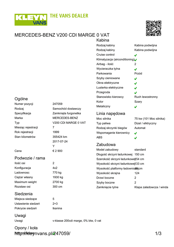 MERCEDES-BENZ V200 CDI MARGE 0 VAT Kabina Rodzaj kabiny Kabina podwójna Rodzaj kabiny Kabina podwójna Cruise control Klimatyzacja (airconditioning) Airbag - ilość 2 Wycieraczka tylna Parkowania Przód Szyby cieniowane Okna elektryczne Lusterka elektryczne Przegroda Ogólne Stanowisko kierowcy Ruch lewostronny Kolor Szary Numer pozycji 247059 Rodzaj Samochód dostawczy Specyfikacja Zamknięta furgonetka Linia napędowa Marka MERCEDES-BENZ Moc silnika 75 kw (101 Moc silnika) Typ V200 CDI MARGE 0 VAT Typ paliwa Dizel / elktryczny Miesiąc rejestracji 7 Rodzaj skrzynki biegów Automat Rok rejestracji 1999 Wspomaganie kierownicy Stan kilometrów 355424 km ABS 2017-07-24 Cena Metaliczny Y Zabudowa € 2 900 Model zabudowy standard Długość skrzyni ładunkowej 150 cm Podwozie / rama Szerokość skrzyni ładunkowej154 cm Ilość osi 2 Wysokość skrzyni ładunkowej133 cm Konfiguracja 4x2 Wysokość platformy ładowniczej 48 cm Ladownosc 770 kg Wysokość skrajna 124 Ciężar własny 1930 kg Drzwi boczne 2 Maximum weight 2700 kg Szyby boczne 2 Rozstaw osi 300 cm Zamknięcie tylne Klapa załadowcza / winda Siedzenia Miejsca siedzące 5 Ustawienie siedzeń 2+3 Pokrycie siedzeń tkanina Uwagi Uwagi v-klasse 200cdi marge, 0% btw, 0 vat Opony / koła http://kleynvans.pl/247059/ Koło zapasowe 1/3 MERCEDES-BENZ V200 CDI MARGE 0 VAT Ilość osi 3 mm 3 mm Hamulce tarczowe Rodzaj osi skrętnej Mechaniczne Typ zawieszenia Wymiar opony 195/70R15,0 Oś skrętna Raport inspekcji Kody wyświetlacza Elektryczny Kolumna kierownicу Resory Rama 3 mm 3 mm Hamulce tarczowe Typ zawieszenia Wymiar opony Hamulce Idealny/nowy Silnik - całość Bardzo dobry Układ chłodzenia Rozsądny Stan Układ paliwowy Akceptowalny Układ wydechowy Nie spełnia wymagań 195/70R15,0 Układ smarowania Skrzynka biegów Sprzęgło Napęd Opony http://kleynvans.pl/247059/ 2/3 MERCEDES-BENZ V200 CDI MARGE 0 VAT http://kleynvans.pl/247059/ 3/3