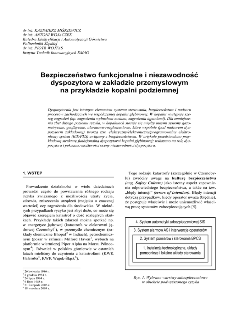 dr inż. KAZIMIERZ MIŚKIEWICZ dr inż. ANTONI WOJACZEK Katedra Elektryfikacji i Automatyzacji Górnictwa Politechniki Śląskiej dr inż. PIOTR WOJTAS Instytut Technik Innowacyjnych EMAG Bezpieczeństwo funkcjonalne i niezawodność dyspozytora w zakładzie przemysłowym na przykładzie kopalni podziemnej Dyspozytornia jest istotnym elementem systemu sterowania, bezpieczeństwa i nadzoru procesów zachodzących we współczesnej kopalni głębinowej. W kopalni występuje szereg zagrożeń (np. zagrożenia wybuchem metanu, zagrożenia tąpaniami). Dla zmniejszenia zbyt dużego poziomu ryzyka, w kopalniach stosuje się między innymi systemy gazometryczne, geofizyczne, alarmowo-rozgłoszeniowe, które wspólnie (pod nadzorem dyspozytorni zakładowej) tworzą tzw. elektryczny/elektroniczny/programowalny elektroniczny system (E/E/PES) związany z bezpieczeństwem. W artykule przedstawiono przykładową strukturę funkcjonalną dyspozytorni kopalni głębinowej; wskazano na rolę dyspozytora i pokazano możliwości oceny niezawodności dyspozytora. 1. WSTĘP Prowadzenie działalności w wielu dziedzinach prowadzi często do powstawania różnego rodzaju ryzyka związanego z możliwością utraty życia, zdrowia, zniszczenia urządzeń (majątku o znacznej wartości) czy zagrożenia dla środowiska. W niektórych przypadkach ryzyko jest zbyt duże, co może się objawić szeregiem katastrof o dość rozległych skutkach. Przykłady takich zdarzeń można spotkać np. w energetyce jądrowej (katastrofa w elektrowni jądrowej Czernobyl 1), w przemyśle chemicznym (zakłady chemiczme Bhopal 2 w Indiach), petrochemicznym (pożar w rafinerii Milford Haven 3, wybuch na platformie wiertniczej Piper Alpha na Morzu Północnym 4). Również w polskim górnictwie w ostatnich latach mieliśmy do czynienia z katastrofami (KWK Halemba 5, KWK Wujek-Śląsk 6). Tego rodzaju katastrofy (szczególnie w Czernobylu) zwróciły uwagę na kulturę bezpieczeństwa (ang. Safety Culture) jako istotny aspekt zapewnienia odpowiedniego bezpieczeństwa, a także na tzw. „błędy intencji” (errors of intention). Błędy intencji dotyczą przypadków, kiedy operator uważa (błędnie), że postępuje właściwie i może uniemożliwić właściwą pracę systemów zabezpieczających [5]. 0F 1F 2F 3F 4F 5F 1 26 kwietnia 1986 r. 2 grudnia 1984 r. 24 lipca 1994 r. 4 6 lipca 1988 r. 5 21 listopada 2006 r. 6 18 września 2009 r. 2 3 Rys. 1. Wybrane warstwy zabezpieczeniowe w obiekcie podwyższonego ryzyka 6 MECHANIZACJA I AUTOMATYZACJA GÓRNICTWA W obiektach podwyższonego ryzyka (np. w przemyśle chemicznym) stosuje się szereg warstw zabezpieczeń pokazanych na rys. 1, [4], takich jak: BPCS 7 – system sterowania i pomiarów wykorzystujący komputerową wizualizację połączoną z archiwizacją danych i raportowaniem, AS 8 – system alarmowy informujący operatora o zagrożeniu awarią za pośrednictwem komunikatów, sygnałów wizualnych oraz dźwiękowych (stosując interfejs maszyna – człowiek HMI – ang. Human Machine Interface); operator w oparciu o otrzymane dane musi dokonać analizy sytuacji i wykonać odpowiednie działania zapobiegające możliwości wystąpienia awarii, SIS 9 – system automatyki zabezpieczeniowej wykonujący założone funkcje bezpieczeństwa w przypadku braku reakcji operatora na sygnały alarmowe. związanego z bezpieczeństwem. Na rysunku 2 i rysunku 3 pokazano schematy blokowe systemów sterowania bez zastosowania i z zastosowaniem systemów E/E/PES. Często systemy E/E/PES tworzą dodatkową petlę oddziałującą na sterowany obiekt, realizując określone funkcje bezpieczeństwa. Do analizy funkcji wyłączeń można zastosować formalne (ilościowe i jakościowe) metody bezpieczeństwa funkcjonalnego. Podejście do takiej analizy, obejmujące cały okres życia systemu z uwzględnieniem projektowania, produkcji i eksploatacji, przedstawiono między innymi w normach [PN-EN 61508 część 1-6]. 6F 7F 8F Rys. 2. Ogólny schemat blokowy typowego systemu sterowania Rys. 3. Ogólny schemat blokowy układu sterowania z zastosowaniem systemu E/E/PES realizującego funkcje bezpieczeństwa Obniżenie zbyt dużego poziomu ryzyka (nieakceptowalnego) można uzyskać między innymi przez zastosowanie tzw. elektrycznego/elektronicznego/ programowalnego elektronicznego systemu (E/E/PES) 7 ang. Basic Process Control System ang. Alarm System 9 ang. Safety Instrumented System 8 2. BEZPIECZEŃSTWO FUNKCJONALNE – PODSTAWOWE POJĘCIA Bezpieczeństwo jest to brak niemożliwego do zaakceptowania ryzyka fizycznego zranienia lub szkody [TR61508-0]. Jeżeli poziom ryzyka jest większy od akceptowalnego, to niezbędne jest zastosowanie odpowiednich systemów (SIS – Safety Instrumented System) elektrycznych, elektronicznych, elektronicznych programowalnych (E/E/PES), które powodują utrzymanie bezpiecznego stanu procesu w odniesieniu do konkretnych niebezpiecznych zdarzeń. Bezpieczeństwo funkcjonalne jest częścią ogólnego bezpieczeństwa i dotyczy prawidłowego działania systemów E/E/PES. Dla każdego zdarzenia zagrażającego określa się funkcję bezpieczeństwa realizowaną przez E/E/PES. Istotnym parametrem systemów E/E/PES jest nienaruszalność bezpieczeństwa rozumiana jako prawdopodobieństwo, że system związany z bezpieczeństwem wykona w sposób zadowalający wymagane funkcje bezpieczeństwa w określonych warunkach i w określonym przedziale czasu. Ilościową miarą nienaruszalności bezpieczeństwa jest poziom nienaruszalności bezpieczeństwa (SIL – Safety Integrity Level). Definicję poziomów SIL podano w tabeli 1 [PN-EN 61508-3]. Tabela 1 Poziomy nienaruszalności bezpieczeństwa Rodzaj pracy Częste przywołanie lub praca ciągła Rzadkie przywołanie SIL Średnie prawdopodobieństwo niewykonania funkcji bezpieczeństwa (PFdavg) Prawdopodobieństwo uszkodzenia niebezpiecznego na godzinę (FFD) 4 3 2 1 10-5 do 10-4 10-4 do 10-3 10-3 do 10-2 10-2 do 10-1 10-9 do 10-8 10-8