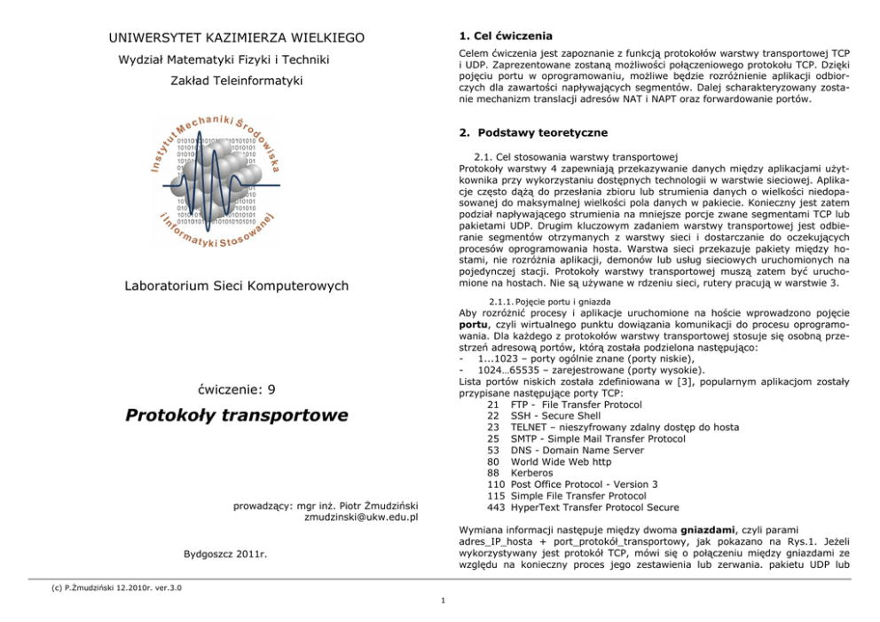 1. Cel ćwiczenia UNIWERSYTET KAZIMIERZA WIELKIEGO Celem ćwiczenia jest zapoznanie z funkcją protokołów warstwy transportowej TCP i UDP. Zaprezentowane zostaną możliwości połączeniowego protokołu TCP. Dzięki pojęciu portu w oprogramowaniu, możliwe będzie rozróżnienie aplikacji odbiorczych dla zawartości napływających segmentów. Dalej scharakteryzowany zostanie mechanizm translacji adresów NAT i NAPT oraz forwardowanie portów. Wydział Matematyki Fizyki i Techniki Zakład Teleinformatyki 2. Podstawy teoretyczne 2.1. Cel stosowania warstwy transportowej Protokoły warstwy 4 zapewniają przekazywanie danych między aplikacjami użytkownika przy wykorzystaniu dostępnych technologii w warstwie sieciowej. Aplikacje często dążą do przesłania zbioru lub strumienia danych o wielkości niedopasowanej do maksymalnej wielkości pola danych w pakiecie. Konieczny jest zatem podział napływającego strumienia na mniejsze porcje zwane segmentami TCP lub pakietami UDP. Drugim kluczowym zadaniem warstwy transportowej jest odbieranie segmentów otrzymanych z warstwy sieci i dostarczanie do oczekujących procesów oprogramowania hosta. Warstwa sieci przekazuje pakiety między hostami, nie rozróżnia aplikacji, demonów lub usług sieciowych uruchomionych na pojedynczej stacji. Protokoły warstwy transportowej muszą zatem być uruchomione na hostach. Nie są używane w rdzeniu sieci, rutery pracują w warstwie 3. Laboratorium Sieci Komputerowych 2.1.1. Pojęcie portu i gniazda Aby rozróżnić procesy i aplikacje uruchomione na hoście wprowadzono pojęcie portu, czyli wirtualnego punktu dowiązania komunikacji do procesu oprogramowania. Dla każdego z protokołów warstwy transportowej stosuje się osobną przestrzeń adresową portów, którą została podzielona następująco: 1...1023 – porty ogólnie znane (porty niskie), 1024…65535 – zarejestrowane (porty wysokie). Lista portów niskich została zdefiniowana w [3], popularnym aplikacjom zostały przypisane następujące porty TCP: 21 FTP - File Transfer Protocol 22 SSH - Secure Shell 23 TELNET – nieszyfrowany zdalny dostęp do hosta 25 SMTP - Simple Mail Transfer Protocol 53 DNS - Domain Name Server 80 World Wide Web http 88 Kerberos 110 Post Office Protocol - Version 3 115 Simple File Transfer Protocol 443 HyperText Transfer Protocol Secure ćwiczenie: 9 Protokoły transportowe prowadzący: mgr inż. Piotr Żmudziński [email protected] Wymiana informacji następuje między dwoma gniazdami, czyli parami adres_IP_hosta + port_protokół_transportowy, jak pokazano na Rys.1. Jeżeli wykorzystywany jest protokół TCP, mówi się o połączeniu między gniazdami ze względu na konieczny proces jego zestawienia lub zerwania. pakietu UDP lub Bydgoszcz 2011r. (c) P.Żmudziński 12.2010r. ver.3.0 1 segmenty TPC enkapsulowane są w pakietach protokołu IP i przesyłane zgodnie z zasadami rutingu tej sieci. Tab. 2 Budowa segmentu TCP słowa warstwa transportowa (TCP / UPD) bity 0 1 warstwa sieciowa ( IP) warstwa fizyczna (Ethernet) system pośredniczący RUTER system końcowy A łącze PRZEŁĄCZNIK 8 12 16 20 24 1 Port źródłowy Port przeznaczenia 2 Długość Suma kontrolna 3… Port źródłowy 20 Przes. Zarezerw. 24 31 Port przeznaczenia Numer potwierdzenia 7… Flagi Okno Suma kontrolna Wskaźnik pilności Opcje Uzupełnienie DANE Znaczenie pola port źródłowy / port przeznaczenia [16b] jest takie jak poprzednio. Pole numer kolejny [32b] oznacza kolejny numer bajtu wiadomości przed fragmentacją będącego pierwszym bajtem w polu dane. Jeżeli flaga SYN=1 to numer pole przenosi inicjujący numer kolejny ISN (Initial Sequence Number). Pole potwierdzenie numeru [32b] jeśli flaga ACK=1 zawiera wartość następnego numeru, który nadawca spodziewa się otrzymać. Jest on jednocześnie potwierdzeniem poprawnego odebrania bajtów o numerach kolejno mniejszych od zawartego w tym polu. Przesunięcie [4b] liczba 32-bitowych słów w nagłówku TCP, pole konieczne ze względu na zmienną długość nagłówka. Pole zarezerwowane [6b] do wykorzystania w przyszłości, obecnie powinno mieć wartość 0. Flagi [6b] służą do przesyłania dodatkowych informacji o połączeniu: − URG — oznaczenia pola pilnego wskaźnika, − ACK — oznaczenia pola potwierdzenia, − PSH — funkcja przepychania (wymuszanie wysłania segmentu), − RST — zresetuj połączenie (natychmiastowe zakończenie), − SYN — ustawiona podczas nawiązywania połączenia oznacza, że w polu Numer kolejny, umieszczony jest ISN; używana do synchronizacji numerów kolejnych podczas nawiązywania połączenia, − FIN — koniec połączenia. Okno [16b] – to liczba bajtów, które nadawca zgodzi się przyjąć. Pole to służy do sterowania przepływem danych. Okno o wartości zero informuje nadawcę, że powinien wstrzymać transmisję, dopóki nie otrzyma segmentu z inną. Opcje [0-44b] przenoszenie dodatkowych informacji, wielokrotność 8b. Uzupełnienia uzupełnia w razie potrzeby pole Opcje do wielokrotności 32b. wartością w tym polu. bity 4 16 3 6 Tab. 1 Budowa pakietu UDP 0 12 Numer kolejny 5 2.2. Protokół UDP (User Datagram Protocol) Protokół pakietów użytkownika świadczy usługę bezpołączeniowego dostarczania pakietów tzn. nie ustanawia w żaden sposób połączenia i nie sprawdza gotowości odległego hosta do odebrania przesyłanych danych oraz poprawności ich dostarczenia. Host wysyła porcję danych i nie sprawdza w żaden sposób, czy dotarły do celu. Dzięki takiemu uproszczeniu funkcji zmniejszona została ilość przesyłanych informacji kontrolnych, co zwiększa efektywność tego protokołu. Protokół wykorzystywany w usługach strumieniowych pracujących w czasie rzeczywistym (VoIP, VoD) oraz przez aplikacje rozsiewcze np. emisja programów radiowych czy wideo. 8 2 4 system końcowy B Rys. 1 Komunikacja między systemami końcowymi słowa 4 31 DANE Nagłówek UDP jest niewielki. Pola adresów [16b] oznaczaj