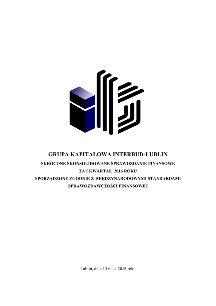 GRUPA KAPITAŁOWA INTERBUD-LUBLIN SKRÓCONE SKONSOLIDOWANE SPRAWOZDANIE FINANSOWE ZA I KWARTAŁ 2016 ROKU SPORZĄDZONE ZGODNIE Z MIĘDZYNARODOWYMI STANDARDAMI SPRAWOZDAWCZOŚCI FINANSOWEJ Lublin, dnia 15 maja 2016 roku Skrócone skonsolidowane sprawozdanie finansowe Grupy Kapitałowej INTERBUD-LUBLIN za I kwartał 2016 roku Spis treści I. SKRÓCONE SKONSOLIDOWANE SPRAWOZDANIE FINANSOWE .................................................. 4 1. SKONSOLIDOWANE SPRAWOZDANIE Z CAŁKOWITYCH DOCHODÓW ................................ 4 2. SKONSOLIDOWANE SPRAWOZDANE Z SYTUACJI FINANSOWEJ ............................................ 5 3. SKONSOLIDOWANE SPRAWOZDANE Z PRZEPŁYWÓW PIENIĘŻNYCH ................................. 6 4. SKONSOLIDOWANE SPRAWOZDANIE ZE ZMIAN W KAPITALE WŁASNYM ......................... 7 II. DODATKOWE INFORMACJE UZUPEŁNIAJĄCE.................................................................................. 8 1. Skład Grupy ............................................................................................................................................. 8 2. Podstawa sporządzenia kwartalnego skróconego skonsolidowanego sprawozdania ......................... 8 3. Istotne zasady (polityka) rachunkowości ............................................................................................... 9 4. Obszary szacunku .................................................................................................................................... 9 5. Sezonowość działalności. ....................................................................................................................... 10 6. Informacje dotyczące segmentów działalności. ................................................................................... 10 7. Środki pieniężne i ich ekwiwalenty. ..................................................................................................... 11 8. Dywidendy wypłacone i zaproponowane do wpłaty ........................................................................... 11 9. Podatek dochodowy ............................................................................................................................... 11 10. Rzeczowe aktywa trwałe. ...................................................................................................................... 12 11. Odpisy aktualizujące wartość firmy .................................................................................................... 12 12. Należności ............................................................................................................................................... 13 13. Zapasy..................................................................................................................................................... 13 14. Oprocentowane kredyty bankowe........................................................................................................ 13 15. Zobowiązania z tytułu dostaw i usług oraz pozostałe zobowiązania. ................................................ 18 16. Działalność zaniechana.......................................................................................................................... 18 17. Połączenia jednostek gospodarczych i nabycia udziałów mniejszości .............................................. 18 18. Cele i zasady zarządzania ryzykiem finansowym ............................................................................... 18 19. Zarządzanie kapitałem .......................................................................................................................... 18 20. Zobowiązania warunkowe .................................................................................................................... 19 21. Zobowiązania inwestycyjne. ................................................................................................................. 22 22. Instrumenty finansowe. ......................................................................................................................... 22 23. Pochodne instrumenty finansowe. ........................................................................................................ 23 24. Struktura właścicielska i transakcje z kadrą zarządzającą. .............................................................. 23 25.1. Struktura właścicielska. ........................................................................................................................ 23 25. 2. Koszty wynagrodzeń wyższej kadry kierowniczej jednostki dominującej...................................... 23 25. Zysk na jedną akcję ............................................................................................................................... 23 26. Zdarzenia następujące po dniu bilansowym. ...................................................................................... 24 III. SKRÓCONE JEDNOSTKOWE SPRAWOZDANIE FINANSOWE ......................................................25 1. SKRÓCONE JEDNOSTKOWE SPRAWOZDANIE Z CAŁKOWITYCH DOCHODÓW .......... 25 2. SKRÓCONE JEDNOSTKOWE SPRAWOZDANIE Z SYTUACJI FINANSOWEJ .................... 26 3. SKRÓCONE JEDNOSTKOWE SPRAWOZDANIE Z PRZEPŁYWÓW PIENIĘŻNYCH ......... 27 4. SKRÓCONE JEDNOSTKOWE SPRAWOZDANIE ZE ZMIAN W KAPITALE WŁASNYM .. 28 IV. DODATKOWE NOTY OBJAŚNIAJĄCE. .................................................................................................29 1. Informacje ogólne................................................................................................................................... 29 2. Podstawa sporządzenia śródrocznego skróconego jednostkowego sprawozdania finansowego. ....... 29 3. Istotne zasady (polityki) rachunkowości ............................................................................................... 29 1. Szacunki i kontynuacja działalności ............