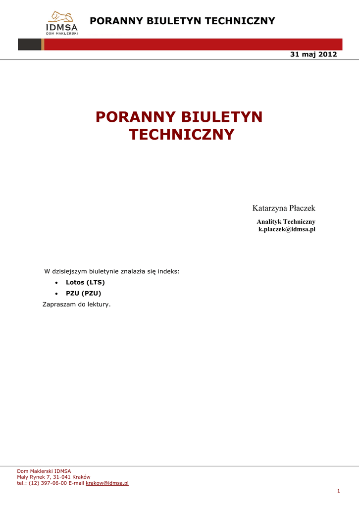 PORANNY BIULETYN TECHNICZNY 31 maj 2012 PORANNY BIULETYN TECHNICZNY Katarzyna Płaczek Analityk Techniczny [email protected] W dzisiejszym biuletynie znalazła się indeks: Lotos (LTS) PZU (PZU) Zapraszam do lektury. Dom Maklerski IDMSA Mały Rynek 7, 31-041 Kraków tel.: (12) 397-06-00 E-mail [email protected] 1 PORANNY BIULETYN TECHNICZNY 31 maj 2012 Lotos (LTS) Wczorajasz świeca wygląda jak wstęp do dalszych spadków. Złamanie wsparcia na poziomie 23,70 to mocny sygnał sprzedaży z potencjałem spadku wynikającym z flagi do 18,00 zł. Ostatnie dołki byłby na poziomie 21,30 i tam byki mogą mieć jeszcze swoje, przysłowiowe 5 minut, ale wygląda na to, że podaż chce wziąć papier w swoje ręce. Stop loss - 23,70. Dom Maklerski IDMSA Mały Rynek 7, 31-041 Kraków tel.: (12) 397-06-00 E-mail [email protected] 2 PORANNY BIULETYN TECHNICZNY 31 maj 2012 PZU (PZU) Właściwie należałoby uznać, że PZU już się wybiło dołem z prostokąta, a potwierdzeniem sygnału sprzedaży będzie złamanie wsparcia na poziomie 293,90 zł. Wówczas będzie to ostatni dzwonek przed odjazdem na 239,80 zł. Stop loss - 239,80. Dom Maklerski IDMSA Mały Rynek 7, 31-041 Kraków tel.: (12) 397-06-00 E-mail [email protected] 3 PORANNY BIULETYN TECHNICZNY 31 maj 2012 Dom Maklerski IDMSA 31-041 Kraków, Mały Rynek 7 tel.: (12) 397-06-00; fax: (12) 397-06-01 [email protected]; [email protected] Niniejsza publikacja została przygotowana przez Dom Maklerski IDMSA. wyłącznie w celach informacyjnych i nie stanowi rekomendacji w rozumieniu przepisów Rozporządzenia Ministra Finansów z dnia 19 października 2005 r. w sprawie informacji stanowiących rekomendacje dotyczące instrumentów finansowych, ich emitentów lub wystawców. Wyłączną odpowiedzialność za decyzje inwestycyjne, podjęte lub zaniechane na podstawie raportu lub z wykorzystaniem wniosków w nim zawartych, ponosi inwestor. Właścicielem majątkowych praw autorskich do raportu jest Dom Maklerski IDMSA. Powielanie bądź publikowanie niniejszej publikacji lub jej części bez pisemnej zgody Domu Maklerskiego IDMSA jest zabronione. Dom Maklerski IDMSA Mały Rynek 7, 31-041 Kraków tel.: (12) 397-06-00 E-mail [email protected] 4