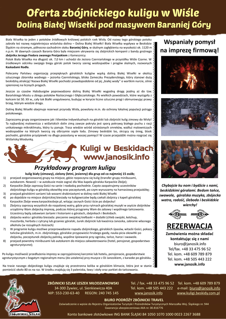 Oferta zbójnickiego kuligu w Wiśle Doliną Białej Wisełki pod masywem Baraniej Góry Biała Wisełka to jeden z potoków źródłowych królowej polskich rzek Wisły. Od nazwy tego górskiego potoku zabrała też nazwę najpiekniejsza wislańska dolina – Dolina Białej Wisełki! Biała Wisełka wypływa w Beskidzie Śląskim na stromym, północno-zachodnim stoku Baraniej Góry, w skalnym zagłębieniu na wysokości ok. 1120 m n.p.m. W dawnych czasach Barania Góra była miejscem ukrywania się zbójnickich kompanii z bandy groźnego zbójnika Jerzego Fiedora zwanego Proćpokiem z Kamesznicy. Potok Biała Wisełka ma długość ok. 7,0 km i uchodzi do Jeziora Czerniańskiego w przysiółku Wiśle Czarne. W środkowym odcinku swojego biegu górski potok tworzy szereg wodospadów i progów skalnych, nazwanych Kaskadami Rodła. Wspaniały pomysł na imprezę firmową! Polecamy Państwu organizację przepięknych góralskich kuligów wąską doliną Białej Wisełki w okolicy sztucznego zbiornika wodnego – jeziorka Czernińskiego, blisko Zameczku Prezydenckiego, który stanowi dużą beskidzką atrakcję! Nazwa Białej Wisełki pochodzi prawdopodobnie od jej „białej wody” o wartkim nurcie, silnie spienionej na licznych progach. Jeszcze za czasów Habsburgów poprowadzono doliną Białej Wisełki wygodną drogę jezdną aż do tzw. Barańskiego Mostu u zbiegu potoków Roztocznego i Głębczańskiego. Po wielkich powodziach, które wystąpiły z końcem lat 50. XX w., cały tok Białki uregulowano, budując w korycie liczne sztuczne progi i obmurowując prawy brzeg, którym wiedzie droga. Dolinę Białej Wisełki obejmuje rezerwat przyrody Wisła, powołany m.in. do ochrony lokalnej populacji pstrąga potokowego. Zapraszamy grupy zorganizowane jak i klientów indywidualnych na góralski lub zbójnicki kulig zimowy do Wisły! Ta najbardziej malownicza z wiślańskich dolin zimą zawsze pokryta jest sporą pokrywą białego puchu z racji unikatowego mikroklimatu, który tu panuje. Trasa wiedzie wśród ośnieżonych smreków, wzdłuż malowniczych wodospadów na których tworzą się olbrzymie sople lodu. Zimowy beskidzki las, skrzący się śnieg, blask pochodni, góralskie przyśpiewki na długo pozostaną w waszej pamięci! W czasie przejażdżki można rozgrzać się Wiślańską Miodunką. Przykładowy program kuligu kulig biały (zimowy), zielony (letni, jesienny) dla grup od co najmniej 15 osób; 1) 2) 3) 4) 5) 6) 7) 8) przejazd zorganizowanej grupy na miejsce, gdzie rozpoczyna się kulig (transfer grupy minibusami, autokarem. Nowość – w autobusie może zagrać dla Was kapela góralska Karpackie Zbóje); Karpackie Zbóje zaproszą Gości na sanie i rozdadzą pochodnie. Często zaopatrujemy uczestników zbójnickiego kuligu w góralską okowitkę oraz poczęstunek, po czym wyruszamy na harnasiową przejażdżkę; przejazd góralskimi saniami lub wozami drabiniastymi w dolinę rzeki Białej Wisełki po dojeździe na miejsce zbójnickiej biesiady na kuligowiczów będą czekali zbójnicy z kapeli góralskiej Karpackie Zbóje www.karpackiezboje.pl, witając zacnych Gości iście po zbójecku! Zbójnicy zaproszą wszystkich do rozpalonej watry, gdzie przy rytmach góralskiej muzyki w asyście zbójników urządzimy Wam zbójecką imprezę, podczas której przygramy Wam do zabawy i wspólnego tańcowania. Uczestnicy będą zabawiani żartami i historiami o góralach, zbójnikach i Beskidach. zbójecka watra i góralska biesiada: pieczenie swojskiej kiełbaski + dodatki (chleb swojski, ketchup, musztarda, herbata z cytryną lub grzaniec góralski, żurek zbójnicki lub kwaśnica Janosika, zabranie własnego alkoholu (w rozsądnych ilościach) W programie kuligu możliwe przeprowadzenie napadu zbójnickiego, góralskich śpasów, witacki Gości, pokazy tańców góralskich, m.in. zbójnickiego, góralskie przypowieści hrubego gazdy, nauka picia okowitki po zbójecku, poczęstunek zbójecką palinką, wspólne śpiewanie przy ognisku, tańce, harce i swawole. przejazd powrotny minibusami lub autokarem do miejsca zakwaterowania (hotel, pensjonat, gospodarstwo agroturystyczne); Chybojcie ku nom i bydźcie s nami, beskidzkimi góralami. Bedom tańce, swawole, góralska muzyka, zbójecka watra, radość, śleboda i beskidzkie wierchy! Po kuligu możliwość przedłużenia imprezy w zaprzyjaźnionej karczmie lub hotelu, pensjonacie, gospodarstwie agroturystycznym z bogatym regionalnym menu (do ustalenia) przy muzyce z DJ Janosikiem, z karaoke po góralsku. Na trasie naszego zbójeckiego kuligu znajduje się przestronna koliba w góralskim klimacie, która jest w stanie pomieścić około 80 os na raz. W środku znajdują się 3 paleniska, ławy i stoły oraz parkiet do tańcowania. ZBÓJNICKI SZLAK LESZEK MŁODZIANOWSKI 34-300 Żywiec, ul. Sienkiewicza 40A NIP: 553-230-63-40 REGON: 240 745 145 REZERWACJA Zamówienia można składać kontaktując się z nami [email protected] Tel/fax. +48 33 475 96 52 Tel. kom. +48 609 789 879 Tel. kom. +48 505 443 222 www.janosik.info Tel. / fax. +48 33 475 96 52 Tel. kom. +48 609 789 879 Tel. kom. +48 505 443 222 e-mail: [email protected] www.janosik.info www.kuligi.beskidy.com.pl BIURO PODRÓŻY ZBÓJNICKI TRAVEL Zaświadczenie o wpisie do Rejestru Organizatorów Turystyki I Pośredników Turystycznych Marszałka Woj. Śląskiego nr. 944 Gwarancja ubezpieczeniowa AXA nr. 00.816776 Konto bankowe złotówkowe ING BANK ŚLĄSKI 84 1050 1070 1000 0023 2267 3688 Oferta zbójnickiego kuligu w Wisle w Wiśle Doliną Białej Wisełki pod masywem Baraniej Góry Trasa: Wisła Czarne - dolina Białej Wisełki. Start trasy w dolinie przy parkingu OSP Wisła Czarne. Tutaj znajduje się parking dla busów i autokarów. Trasa wiedzie malowniczą doliną wzdłuż potoku Biała Wisełka. Pod koniec trasy sanie dojeżdżają do góralskiej koliby (góralski stylowy szałas). Czas trwania kuligu w 2 strony (40 min). Czas biesiady w góralskiej kolibie (60 - 80 min). 