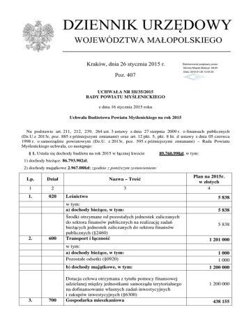 DZIENNIK URZĘDOWY WOJEWÓDZTWA MAŁOPOLSKIEGO Kraków, dnia 26 stycznia 2015 r. Elektronicznie podpisany przez: Monika Majsak-Białczyk; MUW Data: 2015-01-26 13:55:30 Poz. 407 UCHWAŁA NR III/35/2015 RADY POWIATU MYŚLENICKIEGO z dnia 16 stycznia 2015 roku Uchwała Budżetowa Powiatu Myślenickiego na rok 2015 Na podstawie art. 211, 212, 239, 264 ust. 3 ustawy z dnia 27 sierpnia 2009 r. o finansach publicznych (Dz.U.z 2013r, poz. 885 z późniejszymi zmianami) oraz art. 12 pkt. 5, pkt. 8 lit. d ustawy z dnia 05 czerwca 1998 r. o samorządzie powiatowym (Dz.U. z 2013r, poz. 595 z późniejszymi zmianami) – Rada Powiatu Myślenickiego uchwala, co następuje: § 1. Ustala się dochody budżetu na rok 2015 w łącznej kwocie 89.760.990zł, w tym: 1) dochody bieżące: 86.793.902zł; 2) dochody majątkowe 2.967.088zł; zgodnie z poniższym zestawieniem: Lp. Dział Nazwa – Treść 1 2 3 1. 020 2. 600 Leśnictwo 5 838 w tym: a) dochody bieżące, w tym: 5 838 Środki otrzymane od pozostałych jednostek zaliczanych do sektora finansów publicznych na realizację zadań bieżących jednostek zaliczanych do sektora finansów publicznych (§2460) Transport i łączność w tym: a) dochody bieżące, w tym: Pozostałe odsetki (§0920) b) dochody majątkowe, w tym: 3. 700 Plan na 2015r. w złotych 4 Dotacja celowa otrzymana z tytułu pomocy finansowej udzielanej między jednostkami samorządu terytorialnego na dofinansowanie własnych zadań inwestycyjnych i zakupów inwestycyjnych (§6300) Gospodarka mieszkaniowa 5 838 1 201 000 1 000 1 000 1 200 000 1 200 000 438 155 Dziennik Urzędowy Województwa Małopolskiego –2– w tym: a) dochody bieżące, w tym: Dochody z najmu i dzierżawy składników majątkowych Skarbu Państwa, jednostek samorządu terytorialnego lub innych jednostek zaliczanych do sektora finansów publicznych oraz innych umów o podobnym charakterze (§0750) Wpływy z usług (§0830) Dotacje celowe otrzymane z budżetu państwa na zadania bieżące z zakresu administracji rządowej oraz inne zadania zlecone ustawami realizowane przez powiat (§2110) 4. 710 Dochody jednostek samorządu terytorialnego związane z realizacją zadań z zakresu administracji rządowej oraz innych zadań zleconych ustawami (§2360) Działalność usługowa Poz. 407 438 155 42 030 104 125 73 000 219 000 680 750 w tym: 5. 750 a) dochody bieżące, w tym: 680 750 Dotacje celowe otrzymane z budżetu państwa na zadania bieżące z zakresu administracji rządowej oraz inne zadania zlecone ustawami realizowane przez powiat (§2110) 680 600 Dochody jednostek samorządu terytorialnego związane z realizacją zadań z zakresu administracji rządowej oraz innych zadań zleconych ustawami (§2360) Administracja publiczna 150 463 320 w tym: a) dochody bieżące, w tym: 463 320 Pozostałe odsetki (§0920) 260 000 Wpływy z różnych dochodów (§0970) Dotacje celowe otrzymane z budżetu państwa na zadania bieżące z zakresu administracji rządowej oraz inne zadania zlecone ustawami realizowane przez powiat (§2110) 6. 752 Obrona Narodowa 1 000 202 320 1 500 w tym: a) dochody bieżące, w tym: Dotacje celowe otrzymane z budżetu państwa na zadania bieżące z zakresu administracji rządowej oraz inne zadania zlecone ustawami realizowane przez powiat (§2110) 1 500 1 500 Dziennik Urzędowy Województwa Małopolskiego 7. 754 –3– Bezpieczeństwo Publiczne i Ochrona Przeciwpożarowa w tym: a) dochody bieżące, w tym: Pozostałe odsetki (§0920) Dotacje celowe otrzymane z budżetu państwa na zadania bieżące z zakresu administracji rządowej oraz inne zadania zlecone ustawami realizowane przez powiat (§2110) Dochody jednostek samorządu terytorialnego związane z realizacją zadań z zakresu administracji rządowej oraz innych zadań zleconych ustawami (§2360) b) dochody majątkowe, w tym: 8. 756 Dotacje otrzymane z państwowych funduszy celowych na finansowanie lub dofinansowanie kosztów realizacji inwestycji i zakupów inwestycyjnych jednostek sektora finansów publicznych (§6260) Dochody od osób prawnych, od osób fizycznych i od innych jednostek nie posiadających osobowości prawnej oraz wydatki związane z ich poborem w tym: 4 752 025 2 000 4 750 000 25 1 767 088 1 767 088 21 638 835 21 638 835 Podatek dochodowy od osób fizycznych (§0010) 17 452 710 Wpływy z opłaty komunikacyjnej (§0420) Wpływy z opłat za koncesje i licencje (§0590) 758 6 519 113 a) dochody bieżące, w tym: Wpływy z podatku dochodowego od osób prawnych (§0020) 9. Poz. 407 330 225 2 600 000 40 000 Wpływy z różnych opłat (§0690) 315 900 Wpływy z usług (§0830) 900 000 Różne rozliczenia 43 844 999 w tym: a) dochody bieżące, w tym: 43 844 999 subwencje ogólne z budżetu państwa 43 844 999 w tym: część oświatowa subwencji ogólnej (§2920) część równoważąca subwencji ogólnej (§2920) 37 416 703 1 418 936 Dziennik Urzędowy Województwa Małopolskiego –4– część wyrównawcza subwencji ogólnej (§2920) 10. 801 Poz. 407 5 009 360 kwota podstawowa części wyrównawczej subwencji ogólnej 5 009 360 Oświata i wychowanie 1 823 065 w tym: a) dochody bieżące, w tym: Wpływy z różnych opłat (§0690) Dochody z najmu i dzierżawy składników majątkowych Skarbu Państwa, jednostek samorządu terytorialnego lub innych jednostek zaliczanych do sektora finansów publicznych oraz innych umów o podobnym charakterze (§0750) Wpływy z usług (§0830) Pozostałe odsetki (§0920) Otrzymane spadki, zapisy i darowizny w postaci pieniężnej (§0960) 11. 851 1 823 065 2 980 350 955 1 337 619 15 420 5 000 Wpływy z różnych dochodów (§0970) 75 841 Środki na dofinansowanie własnych zadań bieżących gmin (związków gmin), powiatów (związków powiatów), samorządów województw, pozyskane z innych źródeł (§2707) 29 963 w tym z tytułu dotacji i środków na finansowanie wydatków na realizację zadań finansowanych z udziałem środków pochodzących z budżetu Unii Europejskiej oraz niepodlegaj
