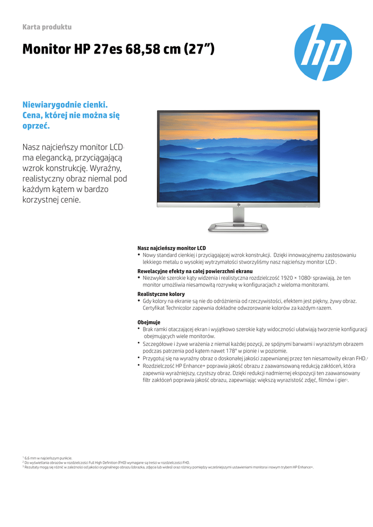 Karta produktu Monitor HP 27es 68,58 cm (27″) Niewiarygodnie cienki. Cena, której nie można się oprzeć. Nasz najcieńszy monitor LCD ma elegancką, przyciągającą wzrok konstrukcję. Wyraźny, realistyczny obraz niemal pod każdym kątem w bardzo korzystnej cenie. 1 Nasz najcieńszy monitor LCD ● Nowy standard cienkiej i przyciągającej wzrok konstrukcji. Dzięki innowacyjnemu zastosowaniu lekkiego metalu o wysokiej wytrzymałości stworzyliśmy nasz najcieńszy monitor LCD1. Rewelacyjne efekty na całej powierzchni ekranu ● Niezwykle szerokie kąty widzenia i realistyczna rozdzielczość 1920 × 10802 sprawiają, że ten monitor umożliwia niesamowitą rozrywkę w konfiguracjach z wieloma monitorami. Realistyczne kolory ● Gdy kolory na ekranie są nie do odróżnienia od rzeczywistości, efektem jest piękny, żywy obraz. Certyfikat Technicolor zapewnia dokładne odwzorowanie kolorów za każdym razem. Obejmuje ● Brak ramki otaczającej ekran i wyjątkowo szerokie kąty widoczności ułatwiają tworzenie konfiguracji obejmujących wiele monitorów. ● Szczegółowe i żywe wrażenia z niemal każdej pozycji, ze spójnymi barwami i wyrazistym obrazem podczas patrzenia pod kątem nawet 178° w pionie i w poziomie. ● Przygotuj się na wyraźny obraz o doskonałej jakości zapewnianej przez ten niesamowity ekran FHD.2 ● Rozdzielczość HP Enhance+ poprawia jakość obrazu z zaawansowaną redukcją zakłóceń, która zapewnia wyraźniejszy, czystszy obraz. Dzięki redukcji nadmiernej ekspozycji ten zaawansowany filtr zakłóceń poprawia jakość obrazu, zapewniając większą wyrazistość zdjęć, filmów i gier3. 1 2 3 6,6 mm w najcieńszym punkcie. Do wyświetlania obrazów w rozdzielczości Full High Definition (FHD) wymagane są treści w rozdzielczości FHD. Rezultaty mogą się różnić w zależności od jakości oryginalnego obrazu (obrazka, zdjęcia lub wideo) oraz różnicy pomiędzy wcześniejszymi ustawieniami monitora i nowym trybem HP Enhance+. Karta produktu Monitor HP 27es 68,58 cm (27″) Wielkość wyświetlacza 68,58 cm (27") Współczynnik kształtu 16:9 Typ wyświetlacza IPS z podświetleniem LED Wielkość piksela 0,311 mm Czas odświeżania 7 ms (od szarości do szarości) Jasność 250 cd/m² Współczynnik kontrastu 1000:1 statyczny; 10M:1 dynamiczny Kąt podglądu 178° w poziomie; 178° w pionie Wejściowy sygnał wideo 1 port VGA; 2 porty HDMI (z obsługą HDCP) Rozdzielczość 1920x1080 przy 60 Hz Wyświetlanie częstotliwości (poziomo) Maks. 80 kHz Wyświetlanie częstotliwości (pionowo) Maks. 60 Hz Funkcje wyświetlacza Panel Low Haze; Przełączanie w płaszczyźnie (IPS); Wybór języka; Podświetlenie LED; Menu ekranowe; Plug and Play; Konfiguracja przez użytkownika Zabezpieczenia fizyczne Urządzenie przystosowane do obsługi blokady zabezpieczającej (blokada jest sprzedawana oddzielnie) Zakres przechyłu wyświetlacza Nachylenie: od -5 do +25° Parametry środowiskowe Podświetlenie LED niezawierające rtęci; Panel wyświetlacza niezawierający arsenu Zasilacz i wymagania zasilania Napięcie wejściowe: 100–240 V pr. zm. przy 50–60 Hz; Pobór mocy: maks. 29 W, w typowych warunkach 24 W; Tryb gotowości: < 0,3 W Sprawność energetyczna Klasa sprawności energetycznej: A+; Przekątna widocznego ekranu: 68,58 cm (27"); Pobór mocy włączonego urządzenia: 23 W; Roczne zużycie energii: 34 kWh; Oczekiwanie: 0,2 W; Zużycie energii (urządzenie wyłączone): 0,14 W; Rozdzielczość ekranu: 1920x1080 przy 60 Hz Opcje kontroli ekranu przez użytkownika Menu/OK; Informacje/„–”; Wejście/„+”; Auto/QV/Exit; Zasilanie Wymiary (sz. x gł. x wys.) 62,09 × 19,45 × 45,56 cm (z podstawą); 62,09 × 3,56 × 37,16 cm (bez podstawy) Waga 3,79 kg (z podstawką); 3,39 kg (bez podstawki) Zakres tempretatur pracy Od 5 do 35°C Zakres wilgotności podczas pracy Od 20 do 80% Zakres temperatur w czasie pracy Od -20 do 60°C Zakres wilgotności po wyłączeniu Ok. 5–95% Certyfikaty i normy CB; CE; TUV-BAUART; ISO9241; CSA; CSA-NRTL; FCC; ICES; S-Mark; VCCI; CCC; CEL, Chiny; BSMI; KCC; KC; E-standby; EUP Lot 6 i Lot 5; GEMS; MEPS; UKRAINIA; HRN N N0.201; EAC; IEC60950:1999; IS 1121; SASO; SABS IEC 60950-1; NOM; PSB; ISC; C-Tick Kolor produktu Naturalne srebro (z przodu i podstawka) i czerń (z tyłu) Gwarancja Dwuletnia gwarancja z transportem od i do klienta (obowiązują pewne ograniczenia i wyjątki) Zawartość opakowania Przewód zasilający pr. zm 1,9 m, zasilacz 1,0 m, płyta CD (zawiera instrukcję, gwarancję, sterowniki), QSP (skrócony arkusz instalacyjny), karta telefoniczna, przewód HDMI 1,8 m (w wybranych SKU/regionach) Mocowanie VESA Nie Informacje o zamawianiu T3M86AS#A2N: 889899718964; T3M86AS#ABB: 889899718919; T3M86AS#ABT: 889899718933; T3M86AS#ABU: 889899718926; T3M86AS#ABV: 889899718957; T3M86AS#ACQ: 889899718940; © Copyright 2016 HP Development Company, L.P. Informacje zawarte w niniejszym dokumencie mogą ulec zmianie bez powiadomienia. Jedyne gwarancje, jakich firma HP udziela na produkty i usługi, są określone w oświadczeniach gwarancyjnych dostarczanych wraz z tymi produktami i usługami. Żadnych informacji przedstawionych w niniejszym dokumencie nie należy interpretować jako dodatkowych gwarancji. Firma HP nie ponosi odpowiedzialności za błędy techniczne, redakcyjne ani za informacje pominięte w niniejszym dokumencie. Wszystkie inne znaki towarowe należą do ich odpowiednich właścicieli. Listopad 2016