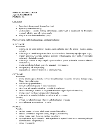 PROGRAM NAUCZANIA JĘZYK NIEMIECKI POZIOM A2 Cele kursu: • • • • Rozwijanie kompetencji komunikacyjnej; Systematyzowanie wiedzy; Doskonalenie i dalszy rozwój sprawności językowych z naciskiem na tworzenie prostych tekstów ustnych i pisemnych; Motywowanie do samodzielnej pracy. Przewidywane efekty kształcenia po ukończeniu kursu: SŁUCHANIE Rozumiem: • informacje na temat rodziny, miejsca zamieszkania, zawodu, czasu i miejsca pracy, podróży; • informacje w krótkich zapowiedziach, opowiadaniach, dane dotyczące jakiegoś kraju; • sygnały czasowe, wywiady na temat uczelni i wykształcenia, opisy osób, wypowiedzi o planach i doświadczeniach; • informacje zawarte w usłyszanych opowiadaniach, proste polecenia, temat w tekstach wiadomości; • proste instrukcje obsługi różnych urządzeń i przyrządów; • ton uprzejmy lub nieuprzejmy; • argumenty za i przeciw i umiem je uporządkować. CZYTANIE Rozumiem: • proste informacje na tematy osobiste i najbliższego otoczenia, na temat danego kraju, filmu, lub wydarzenia; • treść krótkiej opowiadania; • porządek chronologiczny w opowiadaniach; • określone informacje w tekście i potrafię je porównać; • istotne informacje zawarte w diagramach i odnoszącym się do nich tekście; • proste porady i wskazówki zawarte w tekstach; • informacje w instrukcji obsługi urządzenia lub przyrządu. Potrafię: • wybrać z wielu informacji właściwą dla konkretnej sytuacji; • uporządkować argumenty za i przeciw. PISANIE Potrafię • napisać prosty życiorys, wiadomość, prosty list osobisty; • napisać krótki tekst z opisem osoby, miejsca, przedmiotu; • opisać ważne etapy życiowe, napisać o podróży; • uporządkować myśli i notatki i na ich podstawie napisać krótki tekst na temat jakiegoś doświadczenia czy przeżycia; • opisać wydarzenie; • • • • • zapisać i przekazać ważne informacje z rozmowy telefonicznej; opisać powody podróży, doświadczenia i wrażenia z pobytu w innym kraju; opisać proste funkcje urządzeń i przyrządów; krótko opisać fotografię przedstawiającą jakieś miejsce; odpowiedzieć pisemnie na zaproszenie, wyrażając zgodę lub odmowę; MÓWIENIE Umiem: • mówić o sobie, swojej uczelni, wykształceniu, miejscu zamieszkania, rodzinie; • przedstawiać znajomych i przyjaciół; • opisać swój kraj i typowe zwyczaje; • wyrazić uczucia takie, jak radość, rozczarowanie; • rozmawiać o marzeniach, przyjaźni, planach i doświadczeniach; • formułować uprzejme prośby, wyrażać przypuszczenia, propozycje, porady; • pośredniczyć w prostych rozmowach pomiędzy osobami posługującymi się innymi językami; • wyrazić własne zdanie i uzasadnić je; • przekazać polecenia i informacje z rozmowy telefonicznej; • negocjować terminy; • udzielać informacji na podstawie wiedzy z tekstów; • opisać działanie i funkcję prostych urządzeń i przyrządów. Kształcone sprawności językowe: SŁUCHANIE głównego sensu wypowiedzi zawartego w krótkich, wyraźnych, prostych przekazach, ogłoszeniach, zawierających wyrażenia i najczęściej używane słownictwo dotyczącego życia codziennego (np. informacji o osobie, rodzinie, geografii regionu, zatrudnieniu). CZYTANIE krótkich, prostych tekstów w celu znalezienia ogólnej i szczegółowej, przewidywalnej informacji, w prostych codziennych materiałach, takich jak ogłoszenia, reklama, prospekty, jadłospisy, rozkład jazdy, proste listy prywatne. PISANIE listów nieformalnych i listów formalnych typu wniosek, podanie lub prośba. Sporządzanie opisów miejsc, zdarzeń, osób. MÓWIENIE: porozumiewanie się w sytuacjach codziennych i rutynowych, wymagających prostych bezpośrednich informacji na znane tematy; radzenie sobie w prostych sytuacjach towarzyskich, nawet jeśli nie zrozumie się wszystkiego i nie umie się jeszcze samodzielnie podtrzymać konwersacji. Tematyka kursu: Uczelnia, nauka urzędy i instytucje, podróże i turystyka; Praca i wypoczynek, dom – wyposażenie i funkcjonowanie; Rodzina – relacje i życie rodzinne; Życie towarzyskie i służbowe (nauka, praca); Położenie geograficzne, życie codzienne w różnych kulturach; Zdrowie; Pogoda, klimat; Zachowanie i postawy własne i innych osób; Wydarzenia publiczne i fakty z życia prywatnego; Reakcje, przeżycia, spotkania i życie towarzyskie; Kultura, książki, filmy, sztuka. Wprowadzane funkcje językowe: • • • • • • • • • • • • • • • • Zapraszanie/ przyjmowanie zaproszeń; Formułowanie propozycji, sugestii, próśb w formie ustnej i pisemnej (również w listach formalnych); Formułowanie prośby o powtórzenie; Przeliterowanie, prośba o wyjaśnienie; Porównywanie (cechy fizyczne, relacje ilościowe); Formułowanie uprzejmych pytań o konkretne informacje, opinię innych osób; Wybieranie i analizowanie informacji pod kątem ich przydatności dla własnych celów; Relacjonowanie opinii innych osób; Streszczanie dłuższych relacji; Opisywanie związków pomiędzy czynnościami, wykonywanymi zwyczajowo, w chwili obecnej, w określonym momencie w przeszłości, przed chwilą, powtarzających się, dynamicznych, itp.; Wyrażanie swoich opinii i uczuć; Porównywanie (wrażenia subiektywne, preferencje, upodobania); Zgadzanie się i nie zgadzanie z czyjąś opinią; Formułowanie i uzasadnianie swojej opinii, argumentowanie; Wyrażanie różnego stopnia pewności; Akceptacja, odmowa, perswazja. Materiał leksykalno-gramatyczny: Zdania przyczynowe: Ich konnte nicht kommen, weil/ denn ... . Heute kann ich nicht aufräumen, weil ... ; Zdania pytające zależne: Könnten Sie mir bitte sagen, wie hoch die Sommertemperatur dort ist? Przyimki określające czas i miejsce, ich relacja: seit einem Jahr, am Arbeitsplatz; Zdania czasowe i przyczynowe: Als ich jung war... ; Zdania warunkowe z użyciem trybu przypuszczającego: Wenn ich reich wäre, würde ich mir ein 