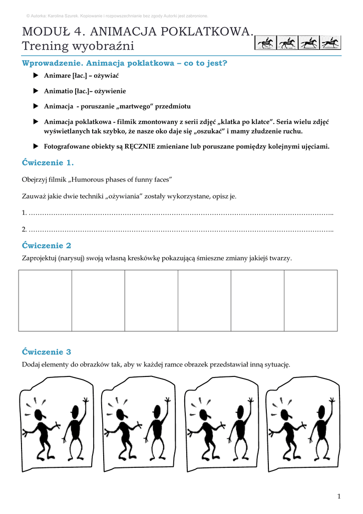 © Autorka: Karolina Szurek. Kopiowanie i rozpowszechnianie bez zgody Autorki jest zabronione. MODUŁ 4. ANIMACJA POKLATKOWA. Trening wyobraźni Wprowadzenie. Animacja poklatkowa – co to jest? Animare [łac.] – ożywiać Animatio [łac.]– ożywienie Animacja - poruszanie „martwego” przedmiotu Animacja poklatkowa - filmik zmontowany z serii zdjęć „klatka po klatce”. Seria wielu zdjęć wyświetlanych tak szybko, że nasze oko daje się „oszukać” i mamy złudzenie ruchu. Fotografowane obiekty są RĘCZNIE zmieniane lub poruszane pomiędzy kolejnymi ujęciami. Ćwiczenie 1. Obejrzyj filmik „Humorous phases of funny faces” Zauważ jakie dwie techniki „ożywiania” zostały wykorzystane, opisz je. 1. ……………………………………………………………………………………………………………………….. 2. ……………………………………………………………………………………………………………………….. Ćwiczenie 2 Zaprojektuj (narysuj) swoją własną kreskówkę pokazującą śmieszne zmiany jakiejś twarzy. Ćwiczenie 3 Dodaj elementy do obrazków tak, aby w każdej ramce obrazek przedstawiał inną sytuację. 1 Ćwiczenie 4. Przyjrzyj się przedmiotom najczęściej wybieranym przez uczniów do animacji poklatkowej. Wskaż strzałką ich plusy i minusy jako obiektów do animacji. Dodaj jeden przedmiot, jeden „plus” i jeden „minus”. Łatwo się daje ustawić i poruszać Łatwo się przewraca Może gestykulować Nie może gestykulować Jego wygląd zależy tylko od naszej fantazji Może zmieniać miny Trudno zrobić tak, żeby ładnie wyglądał Nie zmienia wyrazu twarzy Nie rozpada się Jest fabrycznie zrobiony Ćwiczenie 5. Obejrzyj film „Piotruś i wilk”. „Piotruś i wilk” – brytyjsko-polski krótkometrażowy film lalkowy z 2006 w reżyserii Suzie Templeton. Film zdobył statuetkę Oscara 2007 za Najlepszy Krótkometrażowy Film Animowany. EKIPA: Reżyseria: Suzie Templeton Scenariusz: M.Maldonado, Suzie Templeton Zdjęcia: Hugh Gordon, Mikołaj Jaroszewicz Scenografia: Marek Skrobecki Animacja: Adam Wyrwas, K. Brzozowski Muzyka: Siergiej Prokofjew, Dyrygent: Mark Stephenson Montaż: Tony Fish, Suzie Templeton Efekty wizualne: Kamil Polak Produkcja: Alan Dewhurst, H. Welchman Kierownictwo produkcji: E. Stankiewicz Koproducent: Zbigniew Żmudzki Charakterystyka jednej postaci z filmu (co najmniej 6 zdań). … … .. … … … .. …… … .. …… … .. …… … .. …… … .. …… … .. …… … .. …… … .. …… … .. …… … .. …… … .. …… … .. …… … .. …… … .. …… … .. …… … .. …… … .. …… … .. …… … .. …… … .. …… … .. …… … .. …… … .. …… … .. …… … .. …… … .. …… … .. …… … .. …… … .. …… … .. …… … .. …… … .. …… … .. …… … .. …… … .. …… … .. …… … .. …… … .. …… … .. …… … .. …… … .. …… … .. …… … .. …… … .. …… … .. …… … .. …… … .. …… … .. …… … .. …… … .. …… … .. …… … .. …… … .. …… … .. …… … .. …… … .. …… … .. …… … .. …… … .. …… … .. …… … .. …… … .. …… … .. …… … .. …… … .. …… … .. …… … .. …… … .. …… … .. …… … .. …… … .. …… … .. …… … .. …… … .. …… … .. …… … .. …… … .. …… … .. …… … ..2 …… … .. …… … .. …… … .. …… … .. …… … .. Animacja poklatkowa. Projekt artystyczny. 1. Wprowadzenie. Podanie zadania do realizacji. W tym projekcie będziecie mieli za zadanie zrobić filmik animacją poklatkową Filmik ma opowiadać jakąś historię. Można użyć muzyki, dźwięków, piosenki Filmik nie może być wulgarny ani niemoralny Im więcej własnego twórczego wkładu tym lepiej Czas: 30 sek. – 3 min. Grupy: od 2 do 6 osób Nie używamy mówionych dialogów. Mogą być napisy. Nie korzystamy z animacji komputerowej Nie filmujemy ludzi i zwierząt. Burza mózgów Projektowanie. 2. Podział zadań. Zapiszcie nazwiska osób odpowiedzialnych za poszczególne zadania. Weźcie pod uwagę swoje umiejętności i talenty (w razie potrzeby jedno zadanie może być przydzielone dwóm osobom. Każdy członek zespołu musi być przypisany do jakiegoś zadania). Reżyser: … … … … … … … … … … … - pilnuje aby film się dobrze oglądało i aby i zgodny z wymaganiami. Scenariusz: … … … … … … … … … ……………………... Scenarzysta wymyśla historię, opowiadanie. Zdjęcia: … … … … … … … … … ………. … Fotograf dba o zrobienie zdjęć, światło, kompozycję, jakość. Scenografia: … … … … … … … … … ………………… ….…Scenograf dba o tło, gadżety, przedmioty. Lalkarz: …………………………… … … …. … ..…………. Lalkarz wykonuje postacie bohaterów filmu. Animacja: … … … … … … … … … ……………..… … Animator „ożywia” postacie: zmienia, porusza. Muzyka i dźwięk: … … … … … … … ………..… … Dźwiękowiec wybiera i montuje muzykę i dźwięki Montaż: … … … … … … … … … …… … Montażysta montuje film w komputerze, przygotowuje plik filmowy. Inne: ………………… …………………………..…… ………… ……………… …… ……… … ……… 4. Planowanie (ciąg dalszy) i wykonanie projektu. Czego potrzebujecie? (sprzęt, programy, miejsca i in.) …… … …… … ……… …… … ……… … …… Opis projektu JAK GO ZROBICIE …… … …… … …… … …… … …… … …… … …… … …… … …… … …… … …… … …… … …… … …… … …… … …… … …… … …… … …