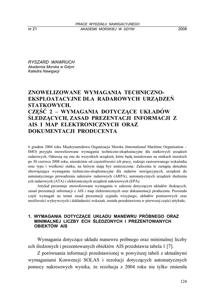 nr 21 PRACE WYDZIAŁU NAWIGACYJNEGO AKADEMII MORSKIEJ W GDYNI 2008 RYSZARD WAWRUCH Akademia Morska w Gdyni Katedra Nawigacji ZNOWELIZOWANE WYMAGANIA TECHNICZNOEKSPLOATACYJNE DLA RADAROWYCH URZĄDZEŃ STATKOWYCH. CZĘŚĆ 2 – WYMAGANIA DOTYCZĄCE UKŁADÓW ŚLEDZĄCYCH, ZASAD PREZENTACJI INFORMACJI Z AIS I MAP ELEKTRONICZNYCH ORAZ DOKUMENTACJI PRODUCENTA 6 grudnia 2004 roku Międzynarodowa Organizacja Morska (International Maritime Organisation – IMO) przyjęła znowelizowane wymagania techniczno-eksploatacyjne dla statkowych urządzeń radarowych. Odnoszą się one do wszystkich urządzeń, które będą instalowane na statkach morskich po 30 czerwca 2008 roku, niezależnie od częstotliwości ich pracy, rodzaju zastosowanego wskaźnika oraz typu i wielkości statku, na którym mają być umieszczone. Zalecenia te zastąpią aktualnie obowiązujące wymagania techniczno-eksploatacyjne dla radarów nawigacyjnych, urządzeń do automatycznego prowadzenia nakresów radarowych (ARPA), automatycznych urządzeń śledzenia ech radarowych (ATA) i elektronicznych urządzeń nakresowych (EPA). Artykuł prezentuje znowelizowane wymagania w zakresie dotyczącym układów śledzących, zasad prezentacji informacji z AIS i map elektronicznych oraz dokumentacji producenta. Pozostała część wymagań na temat zasad prezentacji sygnału wizyjnego, układów pomiarowych oraz możliwości wykrywczych i dokładności wskazań, została przedstawiona w pierwszej części artykułu. 1. WYMAGANIA DOTYCZĄCE UKŁADU MANEWRU PRÓBNEGO ORAZ MINIMALNEJ LICZBY ECH ŚLEDZONYCH I PREZENTOWANYCH OBIEKTÓW AIS Wymagania dotyczące układu manewru próbnego oraz minimalnej liczby ech śledzonych i prezentowanych obiektów AIS przedstawia tabela 1 [7]. Z porównania informacji przedstawionej w powyższej tabeli z aktualnymi wymaganiami Konwencji SOLAS i rezolucji dotyczących automatycznych pomocy nakresowych wynika, że rezolucja z 2004 roku nie tylko zmieniła 124 rodzaje wymaganych pomocy nakresowych, ale również, częściowo, ich minimalne parametry techniczno-eksploatacyjne [2,3,6]. W szczególności, w przypadku urządzeń instalowanych na statkach morskich po 30 czerwca 2008 roku: 1. Każde urządzenie radarowe powinno zapewniać możliwość prezentacji odpowiedniej liczby uaktywnionych i nie uaktywnionych obiektów AIS. 2. Elektroniczne urządzenie nakresowe − EPA (Electronic Plotting Aid) zostaje uznane za niewystarczającą pomoc nakresową. 3. Urządzenia radarowe umieszczane na wszystkich statkach o pojemności brutto mniejszej niż 10000 powinny realizować funkcje przypisane obecnie automatycznym urządzeniom śledzenia ech radarowych − ATA (Automatic Tracking Aid) i umożliwiać automatyczne śledzenie, odpowiednio, co najmniej 20 lub 30 ech radarowych (aktualnie tylko 10 ech). 4. Urządzenia radarowe umieszczane na wszystkich statkach o pojemności brutto 10000 lub większej powinny realizować zadanie przypisane obecnie urządzeniom do automatycznego prowadzenia nakresów radarowych − ARPA (Automatic Radar Plotting Aid) i umożliwiać automatyczną akwizycję i śledzenie co najmniej 40 ech radarowych (obecnie ARPA powinna umożliwiać tylko ręczną akwizycję i śledzenie co najmniej 20 ech). Tabela 1 Wymagania dla urządzeń radarowych w zależności od typu i wielkości statku [7]. (A − statki o pojemności brutto mniejszej niż 500, B − statki o pojemności brutto 500 i większej lecz mniejszej niż 10000 oraz HSC o pojemności brutto mniejszej niż 10000, C − wszystkie statki i HSC o pojemności brutto 10000 i większej, HSC jednostka szybka (High Speed Craft)) Wymagania Automatyczna akwizycja ech radarowych Minimalna liczba ech radarowych akwizowanych do śledzenia Minimalna liczba uaktywnionych obiektów AIS Minimalna liczba nie uaktywnionych obiektów AIS Funkcja manewru próbnego Typ i wielkość statku 1 B C Nie dotyczy 20 Nie dotyczy 30 Tak 40 20 100 Nie dotyczy 30 150 Nie dotyczy 40 200 Tak 2. AKWIZYCJA I ŚLEDZENIE ECH Akwizycja oznacza proces zainicjowania automatycznego śledzenia ech radarowych. Może być ręczna lub automatyczna. Automatyczne śledzenie (TT – Target Tracking) powinno bazować na pomiarach pozycji względnych ech radarowych i parametrach ruchu statku własnego. Inne, dostępne źródła 125 informacji mogą być wykorzystywane celem wspierania procesu automatycznego śledzenia. Należy zapewnić możliwość definiowania przez użytkownika obszaru automatycznej akwizycji. Automatyczne śledzenie ech powinno być dostępne co najmniej na zakresach obserwacji 3, 6 i 12 Nm. Urządzenie powinno automatycznie informować o osiągnięciu dopuszczalnej liczby ech śledzonych [1,5,7]. Podobnie jak w przypadku ARPA i ATA, śledzone powinny być echa wyraźnie widoczne w czasie co najmniej pięciu z dziesięciu kolejnych obrotów anteny, lub w okresie równoważnym temu czasowi [1,2,5]. Dla statków płynących z prędkościami rzeczywistymi do 30 węzłów, układ śledzący powinien określać, z wartościami błędów nie większymi niż podano tabeli 2 (z prawdopodobieństwem 95%) [1,5,7]: − tendencję ruchu względnego echa w czasie jednej minuty ustalonego procesu śledzenia, − parametry ruchu echa w czasie trzech minut ustalonego procesu śledzenia. Proces śledzenia jest ustalony, jeżeli statek własny i obiekt śledzony nie manewrują, a dokładności [7]: − pomiarów radarowych mieszczą się w granicach +/-2o i +/-50m lub +/-1% zakresu obserwacji (decyduje wartość większa błędu), − informacji o parametrach ruchu statku własnego są nie niższe niż zalecane przez IMO w stosownych rezolucjach. Tabela 2 Dokładności układów śledzących urządzeń radarowych instalowanych na statkach po 30 czerwca 2008 roku (dla prawdopodobieństwa 95%) [7] 1 Czas trwania ustalonego procesu śledzenia Kurs względny Minuty stopnie 1 11 3 3 Prędkość względna Odległość największego zbliżenia Czas osiągnięcia odległości największego zb