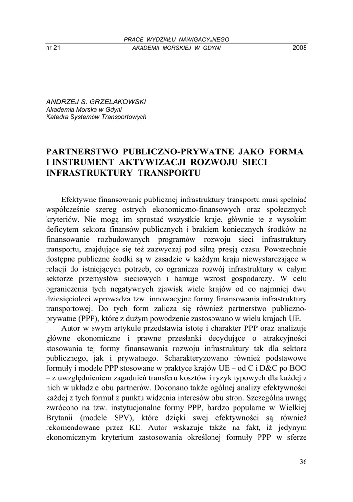nr 21 PRACE WYDZIAŁU NAWIGACYJNEGO AKADEMII MORSKIEJ W GDYNI 2008 ANDRZEJ S. GRZELAKOWSKI Akademia Morska w Gdyni Katedra Systemów Transportowych PARTNERSTWO PUBLICZNO-PRYWATNE JAKO FORMA I INSTRUMENT AKTYWIZACJI ROZWOJU SIECI INFRASTRUKTURY TRANSPORTU Efektywne finansowanie publicznej infrastruktury transportu musi spełniać współcześnie szereg ostrych ekonomiczno-finansowych oraz społecznych kryteriów. Nie mogą im sprostać wszystkie kraje, głównie te z wysokim deficytem sektora finansów publicznych i brakiem koniecznych środków na finansowanie rozbudowanych programów rozwoju sieci infrastruktury transportu, znajdujące się też zazwyczaj pod silną presją czasu. Powszechnie dostępne publiczne środki są w zasadzie w każdym kraju niewystarczające w relacji do istniejących potrzeb, co ogranicza rozwój infrastruktury w całym sektorze przemysłów sieciowych i hamuje wzrost gospodarczy. W celu ograniczenia tych negatywnych zjawisk wiele krajów od co najmniej dwu dziesięcioleci wprowadza tzw. innowacyjne formy finansowania infrastruktury transportowej. Do tych form zalicza się również partnerstwo publicznoprywatne (PPP), które z dużym powodzenie zastosowano w wielu krajach UE. Autor w swym artykule przedstawia istotę i charakter PPP oraz analizuje główne ekonomiczne i prawne przesłanki decydujące o atrakcyjności stosowania tej formy finansowania rozwoju infrastruktury tak dla sektora publicznego, jak i prywatnego. Scharakteryzowano również podstawowe formuły i modele PPP stosowane w praktyce krajów UE – od C i D&C po BOO – z uwzględnieniem zagadnień transferu kosztów i ryzyk typowych dla każdej z nich w układzie obu partnerów. Dokonano także ogólnej analizy efektywności każdej z tych formuł z punktu widzenia interesów obu stron. Szczególna uwagę zwrócono na tzw. instytucjonalne formy PPP, bardzo popularne w Wielkiej Brytanii (modele SPV), które dzięki swej efektywności są również rekomendowane przez KE. Autor wskazuje także na fakt, iż jedynym ekonomicznym kryterium zastosowania określonej formuły PPP w sferze 36 finansowania infrastruktury transportu jest maksymalizacja wartości zaangażowanego kapitału (wartość pieniądza − VfM). Artykuł ten stanowi I część rozważań Autora na ten temat. Druga część zostanie poświęcona zagadnieniom analizy efektywności stosowania różnych modeli PPP w krajach UE oraz rekomendacjom dla Polski. 1. EKONOMICZNE I PRAWNE PRZESŁANKI ROZWOJU PPP W SFERZE ROZWOJU INFRASTRUKTURY TRANSPORTU Podstawowe czynniki i uwarunkowania tak ekonomiczne, jak i pozaekonomiczne, jakie legły u podstaw wdrażania i rozwoju różnych form współpracy sektora publicznego i prywatnego w sferze finansowania infrastruktury technicznej były we wszystkich krajach praktycznie takie same. Mają one bowiem właściwie walor uniwersalny. Nie znaczy to jednakże, że były lub mogą być wykorzystane przez poszczególne kraje w tym samym czasie, w analogicznej formie i podobnym zakresie. Możliwość zastosowania tych rozwiązań oraz ich skuteczność i efektywność zależy bowiem od spełnienia pewnych wymogów. Do grupy tych wymogów, oprócz istnienia stabilnej makroekonomicznej struktury gospodarki ze zrównoważonym systemem finansów publicznych, powstania efektywnego, dobrze rozwiniętego rynku finansowego i sektora prywatnego oraz rozwoju sprawnie funkcjonujących mechanizmów regulacji i struktur instytucjonalno-prawnych, zalicza się również: • wprowadzenie jasnych procedur rozstrzygania sporów (tryb arbitrażowy) oraz skutecznego prawa upadłościowego i naprawczego, • ustalenie spójnych i przejrzystych reguł współfinansowania przez rząd (czynnik publiczny) przedsięwzięć inwestycyjnych w sferze infrastruktury transportowej – w formie subwencji, dotacji, gwarancji i poręczeń kredytowych, itp. w ramach ciążącego na nim obowiązku świadczenia usług publicznych (public service obligation), • stworzenie odpowiedniego klimatu sprzyjającego rozwojowi prywatnego sektora i ułatwiającego mu angażowanie się w przedsięwzięcia będące tradycyjną domeną sektora publicznego, co wiąże się z potrzebą dokonania deregulacji i liberalizacji rynków, • wytypowanie odpowiedniej liczby projektów infrastrukturalnych, które przy zapewnionym wsparciu publicznym spełniają także kryteria mikroekonomicznej efektywności, czyli tzw. bankable projects, gwarantując zwrot wyłożonego kapitału w danym okresie (cost recovery principle) 1. 1 Por. M. F. Carter, Public Private Partnership in Infrastructure Financing. World Bank. Washington D.C. Interim Report. 2003, s. 8 i D. Newbery, The Case for a Public Road Authority.”Journal of Transport Economics and Policy” 28 (3) 1994, s. 235-237. 37 Konieczność spełnienia tych wymogów, a przynajmniej większości z nich, celem osiągnięcia tzw. masy krytycznej, czyli swego rodzaju momentum, niezbędnej do osiągnięcia potencjalnej zdolności do realizacji projektów transportowych w ramach PPP sprawiła, że w układzie gospodarki światowej rozwój pierwszych form partnerstwa publiczno-prywatnego w tej dziedzinie rozpoczął się dopiero na początku lat 80-tych, a większego tempa nabrał po 1988 r. 2 Infrastruktura transportu nie należała jednakże w tym okresie do grupy najbardziej atrakcyjnych obszarów zainteresowania inwestorów prywatnych, a ponadto występowały znaczne regionalne różnice w sposobie podejścia do samej koncepcji wdrażania PPP 3. W praktyce istnieją bowiem liczne powody, które sprawiają, że infrastruktura transportowa, a przynajmniej pewne jej rodzaje, jest mniej podatna na finansowanie przez sektor prywatny, niż inne subsystemy infrastruktury technicznej, np. telekomunikacja, czy energia. Do najważniejszych z nich można zaliczyć: • praktyczne trudności z wyłączeniem użytkowników, którzy nie chcą płacić za korzystanie z danego składnika infrastruktury – dotyczy to zazwyczaj