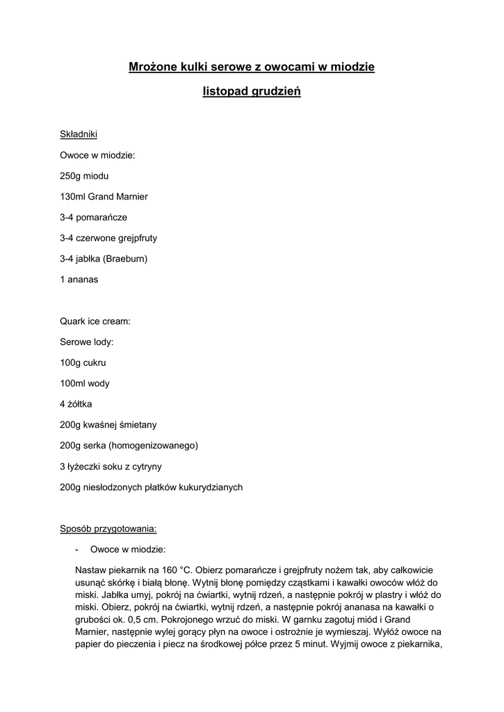 Mrożone kulki serowe z owocami w miodzie listopad grudzień Składniki Owoce w miodzie: 250g miodu 130ml Grand Marnier 3-4 pomarańcze 3-4 czerwone grejpfruty 3-4 jabłka (Braeburn) 1 ananas Quark ice cream: Serowe lody: 100g cukru 100ml wody 4 żółtka 200g kwaśnej śmietany 200g serka (homogenizowanego) 3 łyżeczki soku z cytryny 200g niesłodzonych płatków kukurydzianych Sposób przygotowania: - Owoce w miodzie: Nastaw piekarnik na 160 °C. Obierz pomarańcze i grejpfruty nożem tak, aby całkowicie usunąć skórkę i białą błonę. Wytnij błonę pomiędzy cząstkami i kawałki owoców włóż do miski. Jabłka umyj, pokrój na ćwiartki, wytnij rdzeń, a następnie pokrój w plastry i włóż do miski. Obierz, pokrój na ćwiartki, wytnij rdzeń, a następnie pokrój ananasa na kawałki o grubości ok. 0,5 cm. Pokrojonego wrzuć do miski. W garnku zagotuj miód i Grand Marnier, następnie wylej gorący płyn na owoce i ostrożnie je wymieszaj. Wyłóż owoce na papier do pieczenia i piecz na środkowej półce przez 5 minut. Wyjmij owoce z piekarnika, a następnie delikatnie przełóż wszystko do płaskiego pojemnika i marynuj w lodówce przez co najmniej 12 godzin. - Lody serowe: Zagotuj w garnku 100ml wody z cukrem. Gotuj przez 2 minuty, a następnie zostaw do ostygnięcia. Trzepaczką ubijaj żółtka z ciepłym syropem cukrowym na parze przez 3 minuty, aż masa będzie kremowa i gęsta. Następnie przenieś do zimnej kąpieli i dalej ubijaj masę aż będzie zimna. Dodaj śmietanę, serek oraz sok z cytryny i mieszaj dopóki masa będzie gładka. Przenieś masę do urządzenia do robienia lodów i zamroź na ok. 30 minut. Przenieś lody do schłodzonej miski i zamroź na kolejne 50-60 minut. Wsyp płatki kukurydziane do torebki, delikatnie je pokrusz i przesyp do płaskiego pojemnika. Przy pomocy łyżki do lodów utwórz kulki i obtocz w pokruszonych płatkach. Włóż lodowe kulki z powrotem do zamrażalnika, aż będą gotowe do podania. Wyłóż owoce na talerze, skrop sosem, a na wierzchu ułóż po jednej mrożonej kulce.