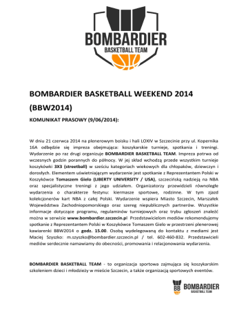 BOMBARDIER BASKETBALL WEEKEND 2014 (BBW2014) KOMUNIKAT PRASOWY (9/06/2014): W dniu 21 czerwca 2014 na plenerowym boisku i hali LOXIV w Szczecinie przy ul. Kopernika 16A odbędzie się impreza obejmująca: koszykarskie turnieje, spotkania i treningi. Wydarzenie po raz drugi organizuje BOMBARDIER BASKETBALL TEAM. Impreza potrwa od wczesnych godzin porannych do północy. W jej skład wchodzą przede wszystkim turnieje koszykówki 3X3 (streetball) w sześciu kategoriach wiekowych dla chłopaków, dziewczyn i dorosłych. Elementem uświetniającym wydarzenie jest spotkanie z Reprezentantem Polski w Koszykówce Tomaszem Gielo (LIBERTY UNIVERSITY / USA), szczecińską nadzieją na NBA oraz specjalistyczne treningi z jego udziałem. Organizatorzy przewidzieli równoległe wydarzenia o charakterze festynu: kiermasze sportowe, rodzinne. W tym zjazd kolekcjonerów kart NBA z całej Polski. Wydarzenie wspiera Miasto Szczecin, Marszałek Województwa Zachodniopomorskiego oraz szereg niepublicznych partnerów. Wszystkie informacje dotyczące programu, regulaminów turniejowych oraz trybu zgłoszeń znaleźć można w serwisie www.bombardier.szczecin.pl Przedstawicielom mediów rekomendujemy spotkanie z Reprezentantem Polski w Koszykówce Tomaszem Gielo w przestrzeni plenerowej kawiarenki BBW2014 o godz. 15.00. Osobą wydelegowaną do kontaktu z mediami jest Maciej Szyszko: [email protected] / tel. 602-460-832. Przedstawicieli mediów serdecznie namawiamy do obecności, promowania i relacjonowania wydarzenia. BOMBARDIER BASKETBALL TEAM - to organizacja sportowa zajmująca się koszykarskim szkoleniem dzieci i młodzieży w mieście Szczecin, a także organizacją sportowych eventów. PROGRAM BOMBARDIER BASKETBALL WEEKEND 2014 (BBW2014)* SOBOTA 21 CZERWCA 2014 ORLIK i HALA LOXIV w Szczecinie (ul. Kopernika 16A) godz.9.00 – OTWARCIE BBW2014, START TURNIEJU 3X3 KATEGORIA U14 MEN; godz.11.00 – START TURNIEJU 3X3 KATEGORIA U16 WOMEN i MEN; godz.14.00 – START TURNIEJU 3X3 KATEGORIA U18 MEN; godz.15.00 – SPOTKANIE z TOMASZEM GIELO (NCAA) w PLENEROWEJ KAWIARENCE BBW2014, spotkanie o charakterze otwartym dla dziennikarzy i sympatyków; godz.16.00 – START TURNIEJU 3X3 KATEGORIA OPEN WOMEN i MEN; godz.17.00 – TRENING POKAZOWY TOMASZA GIELO DLA DZIECI AKADEMII BASKETU (HALA); godz.19.00 – OTWARTY TRENING WYSZKOLENIA INDYWDUALNEGO TOMASZA GIELO; godz.23.00-24.00 PRZEWIDYWANE ZAKOŃCZENIE BBW2014. *Podane w programie BBW2014 godziny mają charakter orientacyjny. ATRAKCJE DODATKOWE: konkursy sportowe, kiermasze dla dzieci i dorosłych, spotkanie kolekcjonerów kart NBA.