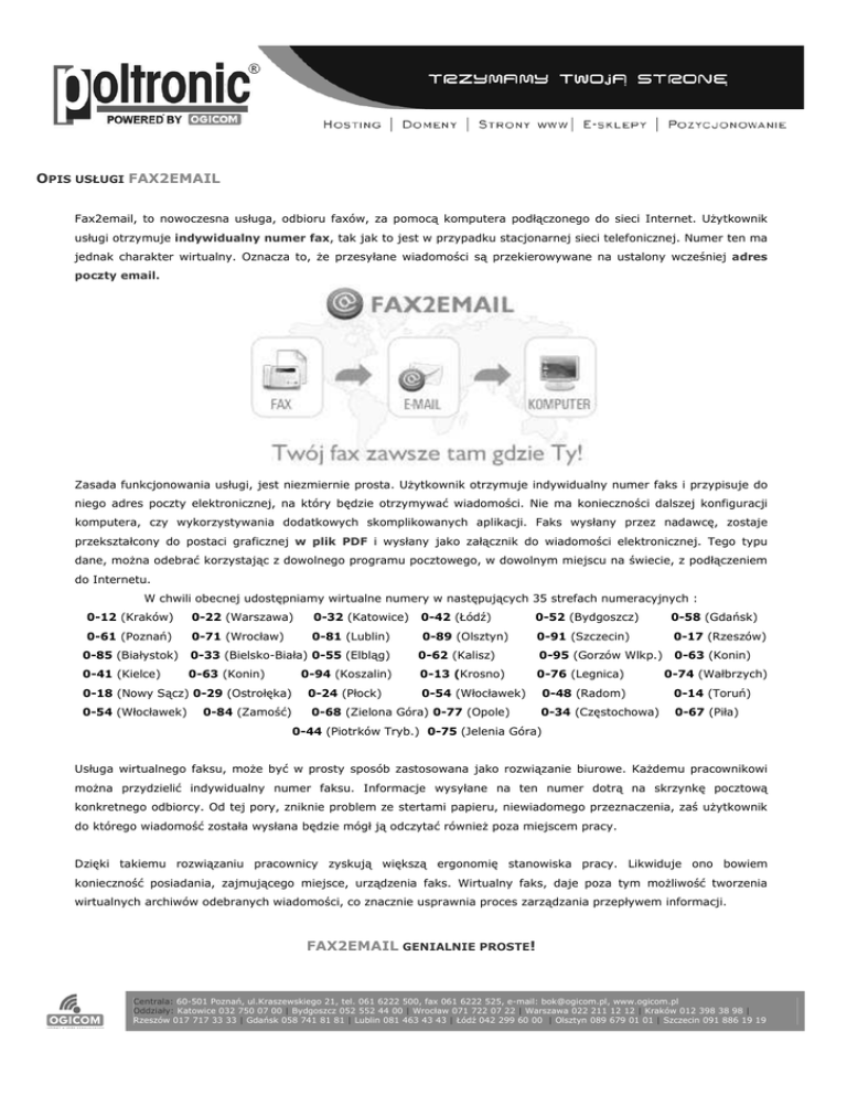 OPIS USŁUGI FAX2EMAIL Fax2email, to nowoczesna usługa, odbioru faxów, za pomocą komputera podłączonego do sieci Internet. UŜytkownik usługi otrzymuje indywidualny numer fax, tak jak to jest w przypadku stacjonarnej sieci telefonicznej. Numer ten ma jednak charakter wirtualny. Oznacza to, Ŝe przesyłane wiadomości są przekierowywane na ustalony wcześniej adres poczty email. Zasada funkcjonowania usługi, jest niezmiernie prosta. UŜytkownik otrzymuje indywidualny numer faks i przypisuje do niego adres poczty elektronicznej, na który będzie otrzymywać wiadomości. Nie ma konieczności dalszej konfiguracji komputera, czy wykorzystywania dodatkowych skomplikowanych aplikacji. Faks wysłany przez nadawcę, zostaje przekształcony do postaci graficznej w plik PDF i wysłany jako załącznik do wiadomości elektronicznej. Tego typu dane, moŜna odebrać korzystając z dowolnego programu pocztowego, w dowolnym miejscu na świecie, z podłączeniem do Internetu. W chwili obecnej udostępniamy wirtualne numery w następujących 35 strefach numeracyjnych : 0-12 (Kraków) 0-61 (Poznań) 0-22 (Warszawa) 0-32 (Katowice) 0-71 (Wrocław) 0-81 (Lublin) 0-42 (Łódź) 0-52 (Bydgoszcz) 0-58 (Gdańsk) 0-89 (Olsztyn) 0-91 (Szczecin) 0-17 (Rzeszów) 0-85 (Białystok) 0-33 (Bielsko-Biała) 0-55 (Elbląg) 0-62 (Kalisz) 0-95 (Gorzów Wlkp.) 0-63 (Konin) 0-41 (Kielce) 0-63 (Konin) 0-13 (Krosno) 0-76 (Legnica) 0-74 (Wałbrzych) 0-48 (Radom) 0-14 (Toruń) 0-34 (Częstochowa) 0-67 (Piła) 0-18 (Nowy Sącz) 0-29 (Ostrołęka) 0-54 (Włocławek) 0-84 (Zamość) 0-94 (Koszalin) 0-24 (Płock) 0-54 (Włocławek) 0-68 (Zielona Góra) 0-77 (Opole) 0-44 (Piotrków Tryb.) 0-75 (Jelenia Góra) Usługa wirtualnego faksu, moŜe być w prosty sposób zastosowana jako rozwiązanie biurowe. KaŜdemu pracownikowi moŜna przydzielić indywidualny numer faksu. Informacje wysyłane na ten numer dotrą na skrzynkę pocztową konkretnego odbiorcy. Od tej pory, zniknie problem ze stertami papieru, niewiadomego przeznaczenia, zaś uŜytkownik do którego wiadomość została wysłana będzie mógł ją odczytać równieŜ poza miejscem pracy. Dzięki takiemu rozwiązaniu pracownicy zyskują większą ergonomię stanowiska pracy. Likwiduje ono bowiem konieczność posiadania, zajmującego miejsce, urządzenia faks. Wirtualny faks, daje poza tym moŜliwość tworzenia wirtualnych archiwów odebranych wiadomości, co znacznie usprawnia proces zarządzania przepływem informacji. FAX2EMAIL GENIALNIE PROSTE! Centrala: 60-501 Poznań, ul.Kraszewskiego 21, tel. 061 6222 500, fax 061 6222 525, e-mail: [email protected], www.ogicom.pl Oddziały: Katowice 032 750 07 00 | Bydgoszcz 052 552 44 00 | Wrocław 071 722 07 22 | Warszawa 022 211 12 12 | Kraków 012 398 38 98 | Rzeszów 017 717 33 33 | Gdańsk 058 741 81 81 | Lublin 081 463 43 43 | Łódź 042 299 60 00 | Olsztyn 089 679 01 01 | Szczecin 091 886 19 19 ATUTY USŁUGI FAX2EMAIL FAX2EMAIL FAX2EMAIL to prosta i funkcjonalna usługa, a przez to absolutnie rewelacyjna, która podbiła juŜ cały świat, a dziś wkracza do Polski! Nie wymaga posiadania urządzenia faxowego ani linii telefonicznej, działa 24h na dobę! FAX2EMAIL to oszczędność na kosztach związanych z eksploatacją standardowego urządzenia fax oraz eliminacja niedogodności związanych z jego konserwacją. Brak konieczności nabywania drogiego, dodatkowego sprzętu. FAX2EMAIL to moŜliwość odbierania wiadomości faksowych poprzez skrzynkę poczty email, w dowolnym miejscu na świecie. FAX2EMAIL to wygoda, sam decydujesz co zrobisz z otrzymanym faxem, moŜesz przesłać go dalej emailem, wydrukować, lub po prostu przeczytać i usnąć ze OSZCZĘDNOŚĆ MOBILNOŚĆ WYGODA ARCHIWIZACJA NOWY NUMER BEZPIECZEŃSTWO PEWNOŚĆ PRESTIś NOWOCZESNOŚĆ skrzynki. FAX2EMAIL – to doskonała forma archiwizacji przychodzącej korespondencji. JuŜ nigdy nie zgubisz Ŝadnego faxu, a kaŜdy który otrzymasz łatwo odnajdziesz! FAX2EMAIL to moŜliwość wyboru specjalnego numeru faxowego w 12 strefach numeracyjnych, w cenie usługi! FAX2EMAIL to bezpieczeństwo i pewność, Ŝe wysłana do Ciebie wiadomość faxem nie trafi przez przypadek w niepowołane ręce. FAX2EMAIL to prestiŜ i nowoczesność, bądź liderem, pokaz innym jak innowacyjna jest Twoja firma, bądź zawsze przed konkurencją! FAX2EMAIL GENIALNIE PROSTE! FAX2EMAIL to brak konieczności ponoszenia jakichkolwiek dodatkowych Tylko teraz 199 PLN netto nakładów związanych z wdroŜeniem usługi, jedyny koszt jaki ponosisz to roczna opłata za usługę w wysokości 199 PLN netto. Za Dodatkowo w grudniu, specjalny „ świąteczna rabat”, aŜ FAX2EMAIL GENIALNIE PROSTE! 149 PLN netto! 50 PLN netto taniej! WYBIERZ SWÓJ NOWY NUMER FAX I PRZETESTUJ USŁUGĘ BEZ ZOBOWIĄZAŃ PRZEZ 7 DNI! Centrala: 60-501 Poznań, ul.Kraszewskiego 21, tel. 061 6222 500, fax 061 6222 525, e-mail: [email protected], www.ogicom.pl Oddziały: Katowice 032 750 07 00 | Bydgoszcz 052 552 44 00 | Wrocław 071 722 07 22 | Warszawa 022 211 12 12 | Kraków 012 398 38 98 | Rzeszów 017 717 33 33 | Gdańsk 058 741 81 81 | Lublin 081 463 43 43 | Łódź 042 299 60 00 | Olsztyn 089 679 01 01 | Szczecin 091 886 19 19 NAJCZĘŚCIEJ ZADAWANE PYTANIA DOTYCZACE FAX2EMAIL Czy za otrzymywane faxy muszę dodatkowo płacić? Nie, uŜytkownik moŜe otrzymać nieograniczoną ilość faxów w ramach miesięcznego (lub rocznego) abonamentu. Jakie urządzenia są potrzebne do obsługi FAX2EMAIL. Jakie są wymagania sprzętowe? Aby móc korzystać z usługi FAX2EMAIL naleŜy mieć dowolny komputer z dostępem do Internetu. W jaki sposób mogę obejrzeć odebrany fax? Wystarczy dwukrotnie kliknąć lewym przyciskiem myszy na pliku. Do przeglądania faxów niezbędny jest program obsługujący format PDF, np. darmowy Adobe Acrobat Reader, do pobrania z www.adobe.com Czy usługę moŜna przedłuŜyć, bez zmiany dotychczas uŜywanego numeru? Tak. PrzedłuŜając usługę utrzymujecie Państwo ten sam numer telefon