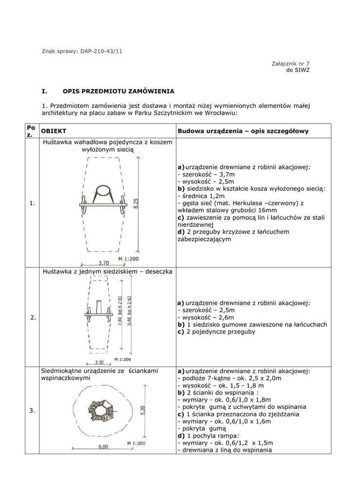 Znak sprawy: DAP-210-43/11 Załącznik nr 7 do SIWZ I. OPIS PRZEDMIOTU ZAMÓWIENIA 1. Przedmiotem zamówienia jest dostawa i montaż niżej wymienionych elementów małej architektury na placu zabaw w Parku Szczytnickim we Wrocławiu: Po OBIEKT Budowa urządzenia – opis szczegółowy z. Huśtawka wahadłowa pojedyncza z koszem wyłożonym siecią a) urządzenie drewniane z robinii akacjowej: - szerokość – 3,7m - wysokość – 2,5m b) siedzisko w kształcie kosza wyłożonego siecią: - średnica 1,2m - gęsta sieć (mat. Herkulesa –czerwony) z wkładem stalowy grubości 16mm c) zawieszenie za pomocą lin i łańcuchów ze stali nierdzewnej d) 2 przeguby krzyżowe z łańcuchem zabezpieczającym 1. Huśtawka z jednym siedziskiem – deseczka a) urządzenie drewniane z robinii akacjowej: - szerokość – 2,5m - wysokość – 2,6m b) 1 siedzisko gumowe zawieszone na łańcuchach c) 2 pojedyncze przeguby 2. Siedmiokątne urządzenie ze ściankami wspinaczkowymi 3. a) urządzenie drewniane z robinii akacjowej: - podłoże 7-kątne - ok. 2,5 x 2,0m - wysokość – ok. 1,5 - 1,8 m b) 2 ścianki do wspinania : - wymiary - ok. 0,6/1,0 x 1,8m - pokryte gumą z uchwytami do wspinania c) 1 ścianka przeznaczona do zjeżdżania - wymiary - ok. 0,6/1,0 x 1,6m - pokryta gumą d) 1 pochyla rampa: - wymiary - ok. 0,6/1,2 x 1,5m - drewniana z liną do wspinania Zestaw zabawowy – Kombinacja 4. 5. Samochód w kształcie betoniarki e) 1 ścianka boczna: - wymiary - ok. 0,6/1,1 x 1,8m - z otworem wejściowym f) 2 ścianki sieciowe do wspinania: - wymiary - ok. 06/1,0 x1,2m - wielkość otworów 30/25cm g) 1 powierzchnia do siedzenia 7-kątna: - wymiary - ok. 1,0 x 1,2m - z otworem wejściowym a) urządzenie drewniane z robinii akacjowej: b) 1 wieża sześciokątna : - wymiary –fi. ok. 2,0 m, wys. 0,6 / 0,9 m c) 1 drabinka - wymiary – szer. 1,0 m, wys. 0,9 - z poręczami d) 1 zestaw sportowy w formie luku - wymiary – dł. 3 x 1,0 m, wys. ok. 2,0m e) drążek: - wymiary – szer.1,0 m, wys. 1,4 m f) sieć do wspinania: - wymiary – 0,81 x 1,25m - fi. liny 16 mm - lina w wkładem stalowym g) 1 ścianka boczna - wymiary – dł. 1,0 m, wys.0,8 m h) 1 mostek ruchomy: - wymiary – dł. 2,5 m, szer.0,8m - dwustronne poręcze - poszycie z desek robinii – 4,7 x 4,0 cm i) 1 zakończenie konstrukcji - wymiary – szer. 1,2 m, wys.0,4m j) 1 winda piaskowa ruchoma k) 1 zasypywarka do pisku - wymiary – dł. 0,5m, fi. ok. 20 cm l) 1 mostek linowy - wymiary – dł. 2,0 m, szer. 0,8m - dwustronne poręcze - poszycie z desek robinii – 4,7x4,0cm - sieć boczna - materiał Herkules fi. 16mm z wkładem stalowym, wielkość otworów 30/2530cm m) 1 wieża sześciokątna z daszkiem sześciospadowym: - wymiary – śre. ok. 2,0m, wys. podestu1,5m - 1 wbudowany hamak – dł. 3,7m - 2 ścianki boczne – dł.1,0m, wys. 0,8m - 1 schody – szer. 0,8, wys. 1,5m - 1 zjeżdżalnia – ze stali nierdzewnej – gr. 2,0 mm, szer.0,5m, wys. 1,5m - 1 sieć pochyła – szer. 0,75m, dł. 2,25m, wielkość otworów25/25cm a) urządzenie drewniane z robinii akacjowej: - długość – ok. 5,8 m - szerokość – ok. 2,5 m - wysokość (łączna) – ok. 3,0 m b) 1 kabina kierowcy - wymiary – ok. 1,8 x 2,2m, wys. podestu 0,6m - wyłożona gumą zabezpieczającą przed upadkiem - ścianki boczne częściowo ze stali szlachetnej z otworami - 1 drabinka sznurkowa – dł. ok. 1,5m - 1 deska rozdzielcza - 1 kierownica c) 1 bęben do mieszania - wymiary – fi. ok. 2,5m, dł. ok. 3,65 m - ścianki boczne z sieci do wspinania – wielkość otworów 10/10 cm i 25/25 cm i mata gumowa - 1 podest – ok. 1,6/2,5 x 1,2, wys. podestu 1,8m - 3 mostki gumowe – dł. ok. 2,3/2,0/1,5 m, szer.1,0m, wys.0,6 – 1,9 m - 2 poręcze linowe – dł.1,7m d) 6 opon z płyt drewnopodobnych – fi. 1,0-1,2 m Uwaga : do pozycji 1, 2, 4 i 5 z tabeli dołączono odpowiedni szkic sytuacyjny w załączniku nr 7. Wykonawca zastosuje elementy małej architektury opisane jako przykładowe lub inne o takich samych parametrach. Zasady zastosowania parametrach: innych elementów małej architektury o takich samych 1) Zamawiający dopuszcza zastosowanie innych elementów małej architektury o takich samych parametrach, 2) w przypadku zastosowania przez wykonawcę innych elementów małej architektury o takich samych parametrach zamiar ten musi zostać zgłoszony w ofercie przetargowej, do której należy dołączyć pełne, niezbędne informacje, które umożliwią komisji przetargowej ocenę, czy parametry zaproponowanych elementów są takie same. Dla zamiennych urządzeń zabawowych i zamiennej nawierzchni ochronnej syntetycznej należy dołączyć certyfikat na znak bezpieczeństwa B. Zastosowane urządzenia zabawowe muszą posiadać certyfikat na znak bezpieczeństwa B. Po zakończeniu zadania Wykonawca przedstawi oświadczenie producenta o identyczności elementów małej architektury zamontowanych na terenie przedmiotowego placu zabaw z tymi, na które uzyskano certyfikat. Minimalna gwarancja na elementy małej architektury wynosi 36 miesięcy. Wykonawca przedstawi oświadczenie o przeniesieniu praw gwarancyjnych na wszystkie elementy na Zamawiającego w przypadku gwarancji wybiegających poza termin gwarancji dla całego zadania.