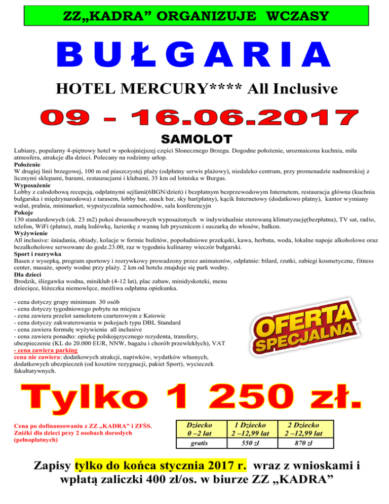 ZZ„KADRA” ORGANIZUJE WCZASY BUŁGARIA HOTEL MERCURY**** All Inclusive SAMOLOT Lubiany, popularny 4-piętrowy hotel w spokojniejszej części Słonecznego Brzegu. Dogodne położenie, urozmaicona kuchnia, miła atmosfera, atrakcje dla dzieci. Polecany na rodzinny urlop. Położenie W drugiej linii brzegowej, 100 m od piaszczystej plaży (odpłatny serwis plażowy), niedaleko centrum, przy promenadzie nadmorskiej z licznymi sklepami, barami, restauracjami i klubami, 35 km od lotniska w Burgas. Wyposażenie Lobby z całodobową recepcją, odpłatnymi sejfami(6BGN/dzień) i bezpłatnym bezprzewodowym Internetem, restauracja główna (kuchnia bułgarska i międzynarodowa) z tarasem, lobby bar, snack bar, sky bar(płatny), kącik Internetowy (dodatkowo płatny), kantor wymiany walut, pralnia, minimarket, wypożyczalnia samochodów, sala konferencyjn Pokoje 130 standardowych (ok. 23 m2) pokoi dwuosobowych wyposażonych w indywidualnie sterowaną klimatyzację(bezpłatna), TV sat, radio, telefon, WiFi (płatne), małą lodówkę, łazienkę z wanną lub prysznicem i suszarką do włosów, balkon. Wyżywienie All inclusive: śniadania, obiady, kolacje w formie bufetów, popołudniowe przekąski, kawa, herbata, woda, lokalne napoje alkoholowe oraz bezalkoholowe serwowane do godz.23.00, raz w tygodniu kulinarny wieczór bułgarski. Sport i rozrywka Basen z wysepką, program sportowy i rozrywkowy prowadzony przez animatorów, odpłatnie: bilard, rzutki, zabiegi kosmetyczne, fitness center, masaże, sporty wodne przy plaży. 2 km od hotelu znajduje się park wodny. Dla dzieci Brodzik, ślizgawka wodna, miniklub (4-12 lat), plac zabaw, minidyskoteki, menu dziecięce, łóżeczka niemowlęce, możliwa odpłatna opiekunka. - cena dotyczy grupy minimum 30 osób - cena dotyczy tygodniowego pobytu na miejscu - cena zawiera przelot samolotem czarterowym z Katowic - cena dotyczy zakwaterowania w pokojach typu DBL Standard - cena zawiera formułę wyżywienia all inclusive - cena zawiera ponadto: opiekę polskojęzycznego rezydenta, transfery, ubezpieczenie (KL do 20.000 EUR, NNW, bagażu i chorób przewlekłych), VAT - cena zawiera parking cena nie zawiera: dodatkowych atrakcji, napiwków, wydatków własnych, dodatkowych ubezpieczeń (od kosztów rezygnacji, pakiet Sport), wycieczek fakultatywnych. Cena po dofinansowaniu z ZZ „KADRA” i ZFŚS. Zniżki dla dzieci przy 2 osobach dorosłych (pełnopłatnych) Dziecko 0 –2 lat 1 Dziecko 2 –12,99 lat 2 Dziecko 2 –12,99 lat gratis 550 zł 870 zł Zapisy tylko do końca stycznia 2017 r. wraz z wnioskami i wpłatą zaliczki 400 zł/os. w biurze ZZ „KADRA”
