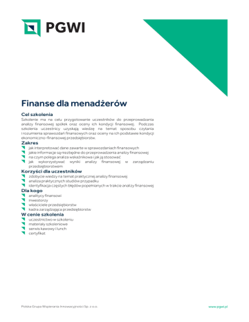 Finanse dla menadżerów Cel szkolenia Szkolenie ma na celu przygotowanie uczestników do przeprowadzania analizy finansowej spółek oraz oceny ich kondycji finansowej. Podczas szkolenia uczestnicy uzyskają wiedzę na temat sposobu czytania i rozumienia sprawozdań finansowych oraz oceny na ich podstawie kondycji ekonomiczno-finansowej przedsiębiorstw. Zakres jak interpretować dane zawarte w sprawozdaniach finansowych jakie informacje są niezbędne do przeprowadzenia analizy finansowej na czym polega analiza wskaźnikowa i jak ją stosować jak wykorzystywać wyniki analizy finansowej w zarządzaniu przedsiębiorstwem Korzyści dla uczestników zdobycie wiedzy na temat praktycznej analizy finansowej analiza praktycznych studiów przypadku identyfikacja częstych błędów popełnianych w trakcie analizy finansowej Dla kogo analitycy finansowi inwestorzy właściciele przedsiębiorstw kadra zarządzająca przedsiębiorstw W cenie szkolenia uczestnictwo w szkoleniu materiały szkoleniowe serwis kawowy i lunch certyfikat Polska Grupa Wspierania Innowacyjności Sp. z o.o. www.pgwi.pl Program Moduł I 9:00 – 10:30 Analiza finansowa – wprowadzenie zasady rachunkowości rodzaje sprawozdań finansowych i obowiązki sprawozdawcze zastosowania analizy finansowej Analiza bilansu i rachunku zysków i strat treść i konstrukcja bilansu analiza struktury i dynamiki bilansu treść i konstrukcja rachunku zysków i strat (wariant porównawczy i kalkulacyjny) analiza struktury i dynamiki rachunku zysków i strat związki pomiędzy sprawozdaniami studium przypadku 10:30 – 10:45 Przerwa kawowa Moduł II 10:45 – 12:15 Analiza sprawozdania z przepływów środków pieniężnych (cash flow) i zestawienia zmian w kapitale własnym znaczenie i zawartość sprawozdania z przepływów środków pieniężnych znaczenie i zawartość zestawienia zmian w kapitale własnym całościowe studium przypadku – praktyczne rozumienie sprawozdań finansowych 12:15 – 12:45 Przerwa na lunch Moduł III 12:45 – 14:15 Analiza wskaźnikowa zakres i zasady analizy wskaźnikowej sprawozdań finansowych; wskaźniki struktury wskaźniki płynności wskaźniki zadłużenia wskaźniki rentowności wskaźniki sprawności zarządzania Piramida Du Ponta Próg rentowności przydatność analizy wskaźnikowej częste błędy w analizie wskaźnikowej źródła danych 14:15 – 14:30 Przerwa kawowa Moduł IV 14:30 – 16:00 Praktyczne zastosowanie analizy finansowej zapotrzebowanie na kapitał obrotowy identyfikacja niebezpieczeństwa bankructwa zastosowanie analizy finansowej w nadzorze właścicielskim elementy „kreatywnej księgowości” zdolność do finansowania działalności dźwignia finansowa przykłady praktyczne Podsumowanie cechy poprawnej analizy finansowej Polska Grupa Wspierania Innowacyjności Sp. z o.o. www.pgwi.pl Prowadzący Dr Marcin Lewandowski jest absolwentem kierunku Handel Międzynarodowy na Akademii Ekonomicznej w Poznaniu. Od 1994 roku związany czynnie z doradztwem gospodarczym. W latach 2000-2001 menedżer w BRE Corporate Finance (wcześniej Business Management & Finance SA), gdzie realizował projekty z zakresu prywatyzacji, poszukiwania kapitału, wycen wartości, restrukturyzacji kapitałowej oraz analiz przed inwestycyjnych. W okresie 1994-2000 pracował w firmie F5 Konsulting w Poznaniu (wcześniej W. Frąckowiak i Partnerzy - Wielkopolska Grupa Konsultingowa), przechodząc kolejne szczeble od asystenta do starszego konsultanta. Uczestniczył w projektach związanych z opracowywaniem strategii rozwojowej spółek, analizami strategicznymi i prywatyzacją, dezinwestycjami i sprzedażą spółek, analiza przedsięwzięć inwestycyjnych, analizami typu due diligence i wycenami wartości dla celów przejęć (firmy w sektorze budowlanym) oraz restrukturyzacją grup kapitałowych. Dr Marcin Lewandowski od 1994 do 2001 roku był wykładowca Katedry Inwestycji i Rynków Kapitałowych Akademii Ekonomicznej w Poznaniu. Tytuł doktora nauk ekonomicznych uzyskał w 1997 roku za pracę: Fuzje i przejęcia, jako metody wzrostu przedsiębiorstw. Odbył staże naukowe w Belgii oraz Stanach Zjednoczonych (Georgia State University). Jest współautorem książek na temat fuzji i przejęć przedsiębiorstw, w tym "Fuzje i przejęcia w Polsce na tle tendencji światowych " (WIG-Press, Warszawa 2001) oraz kilkudziesięciu artykułów specjalistycznych na temat fuzji i przejęć przedsiębiorstw, rynków kapitałowych, zarządzania wartością oraz nadzoru właścicielskiego . Polska Grupa Wspierania Innowacyjności Sp. z o.o. www.pgwi.pl Formularz zgłoszeniowy Warunki Uczestnictwa: Temat szkolenia 1. Wypełnienie i odesłanie formularza zgłoszeniowego pocztą elektroniczną na adres e-mail: [email protected] nie później niż 7 dni przed rozpoczęciem szkolenia. 2. Otrzymanie potwierdzenia ( e-mail) udziału w szkoleniu od Polskiej Grupy Wspierania Innowacyjności Sp. z o.o. na około 4 dni przed rozpoczęciem szkolenia. 3. Po otrzymaniu potwierdzenia udziału w szkoleniu, opłatę należy wnieść na konto Polskiej Grupy Wspierania Innowacyjności Sp. z o.o. MBank: 21 1140 2004 0000 3602 7568 9890. 4.Polska Grupa Wspierania Innowacyjności Sp. z o.o. zastrzega sobie prawo do odwołania szkolenia z przyczyn niezależnych. 5 .Rezygnacja z udziału w szkoleniu powinna nastąpić w formie pisemnej (email) na 7 dni przed rozpoczęciem szkolenia. Rezygnacja w późniejszym terminie wiąże się z koniecznością partycypacji w 100% kosztów szkolenia. Nieobecność na szkoleniu nie zwalnia z dokonania opłaty. Termin i miejsce Koszt szkolenia Dane uczestnika Imię i nazwisko Firma/Instytucja Stanowisko Telefon Email Dane osoby do kontaktu Imię i nazwisko Wyrażam zgodę na przetwarzanie moich danych osobowych przez Polską Grupę Wspierania Innowacyjności Sp. z o.o. w zakresie niezbędnym do obsługi szkolenia oraz prowadzonej przez nią działalności gospodarczej zgodnie z ustawą z dn. 29.08. 1997r. o Oc
