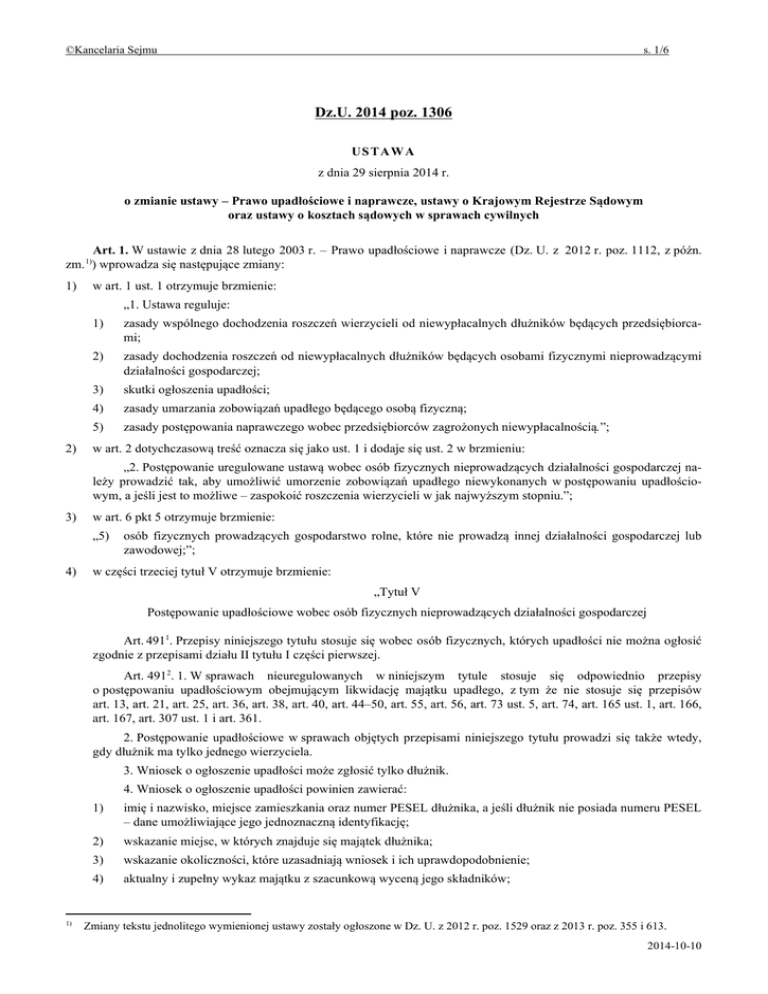 ©Kancelaria Sejmu s. 1/6 Dz.U. 2014 poz. 1306 US T AW A z dnia 29 sierpnia 2014 r. o zmianie ustawy – Prawo upadłościowe i naprawcze, ustawy o Krajowym Rejestrze Sądowym oraz ustawy o kosztach sądowych w sprawach cywilnych Art. 1. W ustawie z dnia 28 lutego 2003 r. – Prawo upadłościowe i naprawcze (Dz. U. z 2012 r. poz. 1112, z późn. zm. 1)) wprowadza się następujące zmiany: 1) w art. 1 ust. 1 otrzymuje brzmienie: „1. Ustawa reguluje: 2) 1) zasady wspólnego dochodzenia roszczeń wierzycieli od niewypłacalnych dłużników będących przedsiębiorcami; 2) zasady dochodzenia roszczeń od niewypłacalnych dłużników będących osobami fizycznymi nieprowadzącymi działalności gospodarczej; 3) skutki ogłoszenia upadłości; 4) zasady umarzania zobowiązań upadłego będącego osobą fizyczną; 5) zasady postępowania naprawczego wobec przedsiębiorców zagrożonych niewypłacalnością.”; w art. 2 dotychczasową treść oznacza się jako ust. 1 i dodaje się ust. 2 w brzmieniu: „2. Postępowanie uregulowane ustawą wobec osób fizycznych nieprowadzących działalności gospodarczej należy prowadzić tak, aby umożliwić umorzenie zobowiązań upadłego niewykonanych w postępowaniu upadłościowym, a jeśli jest to możliwe – zaspokoić roszczenia wierzycieli w jak najwyższym stopniu.”; 3) w art. 6 pkt 5 otrzymuje brzmienie: „5) 4) osób fizycznych prowadzących gospodarstwo rolne, które nie prowadzą innej działalności gospodarczej lub zawodowej;”; w części trzeciej tytuł V otrzymuje brzmienie: „Tytuł V Postępowanie upadłościowe wobec osób fizycznych nieprowadzących działalności gospodarczej Art. 4911. Przepisy niniejszego tytułu stosuje się wobec osób fizycznych, których upadłości nie można ogłosić zgodnie z przepisami działu II tytułu I części pierwszej. Art. 4912. 1. W sprawach nieuregulowanych w niniejszym tytule stosuje się odpowiednio przepisy o postępowaniu upadłościowym obejmującym likwidację majątku upadłego, z tym że nie stosuje się przepisów art. 13, art. 21, art. 25, art. 36, art. 38, art. 40, art. 44–50, art. 55, art. 56, art. 73 ust. 5, art. 74, art. 165 ust. 1, art. 166, art. 167, art. 307 ust. 1 i art. 361. 2. Postępowanie upadłościowe w sprawach objętych przepisami niniejszego tytułu prowadzi się także wtedy, gdy dłużnik ma tylko jednego wierzyciela. 3. Wniosek o ogłoszenie upadłości może zgłosić tylko dłużnik. 4. Wniosek o ogłoszenie upadłości powinien zawierać: 1) 1) imię i nazwisko, miejsce zamieszkania oraz numer PESEL dłużnika, a jeśli dłużnik nie posiada numeru PESEL – dane umożliwiające jego jednoznaczną identyfikację; 2) wskazanie miejsc, w których znajduje się majątek dłużnika; 3) wskazanie okoliczności, które uzasadniają wniosek i ich uprawdopodobnienie; 4) aktualny i zupełny wykaz majątku z szacunkową wyceną jego składników; Zmiany tekstu jednolitego wymienionej ustawy zostały ogłoszone w Dz. U. z 2012 r. poz. 1529 oraz z 2013 r. poz. 355 i 613. 2014-10-10 ©Kancelaria Sejmu s. 2/6 5) spis wierzycieli z podaniem ich adresów i wysokości wierzytelności każdego z nich oraz terminów zapłaty; 6) spis wierzytelności spornych z zaznaczeniem zakresu w jakim dłużnik kwestionuje istnienie wierzytelności; wskazanie wierzytelności w spisie wierzytelności spornych nie stanowi jej uznania; 7) listę zabezpieczeń ustanowionych na majątku dłużnika wraz z datami ich ustanowienia, w szczególności hipotek, zastawów i zastawów rejestrowych; 8) oświadczenie dłużnika, że nie zachodzą okoliczności wskazane w art. 4914 ust. 2 i 3. Art. 4913. Sprawy o ogłoszenie upadłości objęte przepisami niniejszego tytułu rozpoznaje sąd upadłościowy w składzie jednego sędziego zawodowego. Art. 4914. 1. Sąd oddala wniosek o ogłoszenie upadłości, jeżeli dłużnik doprowadził do swojej niewypłacalności lub istotnie zwiększył jej stopień umyślnie lub wskutek rażącego niedbalstwa. 2. Sąd oddala wniosek o ogłoszenie upadłości, jeżeli w okresie dziesięciu lat przed dniem zgłoszenia wniosku: 1) w stosunku do dłużnika prowadzono postępowanie upadłościowe według przepisów tytułu niniejszego, jeżeli postępowanie to zostało umorzone z innych przyczyn niż na wniosek dłużnika, 2) ustalony dla dłużnika plan spłaty wierzycieli uchylono na podstawie przepisu art. 49120, 3) dłużnik, mając taki obowiązek, wbrew przepisom ustawy nie zgłosił w terminie wniosku o ogłoszenie upadłości, 4) czynność prawna dłużnika została prawomocnie uznana za dokonaną z pokrzywdzeniem wierzycieli – chyba że przeprowadzenie postępowania jest uzasadnione względami słuszności lub względami humanitarnymi. 3. Sąd oddala wniosek o ogłoszenie upadłości, jeżeli w okresie dziesięciu lat przed dniem zgłoszenia wniosku w stosunku do dłużnika prowadzono postępowanie upadłościowe, w którym umorzono całość lub część jego zobowiązań, chyba że do niewypłacalności dłużnika lub zwiększenia jej stopnia doszło pomimo dochowania przez dłużnika należytej staranności lub przeprowadzenie postępowania jest uzasadnione względami słuszności lub względami humanitarnymi. 4. Sąd oddala wniosek o ogłoszenie upadłości, jeżeli dane podane przez dłużnika we wniosku są niezgodne z prawdą lub niezupełne, chyba że niezgodność lub niezupełność nie są istotne lub przeprowadzenie postępowania jest uzasadnione względami słuszności lub względami humanitarnymi. Art. 4915. Uwzględniając wniosek o ogłoszenie upadłości, sąd wydaje postanowienie o ogłoszeniu upadłości, w którym: 1) wymienia imię i nazwisko, miejsce zamieszkania oraz numer PESEL upadłego dłużnika (upadłego), a jeżeli upadły nie posiada numeru PESEL – dane umożliwiające jego jednoznaczną identyfikację; 2) określa, że upadły jest osobą nieprowadzącą działalności gospodarczej; 3) wskazuje, że postępowanie obejm