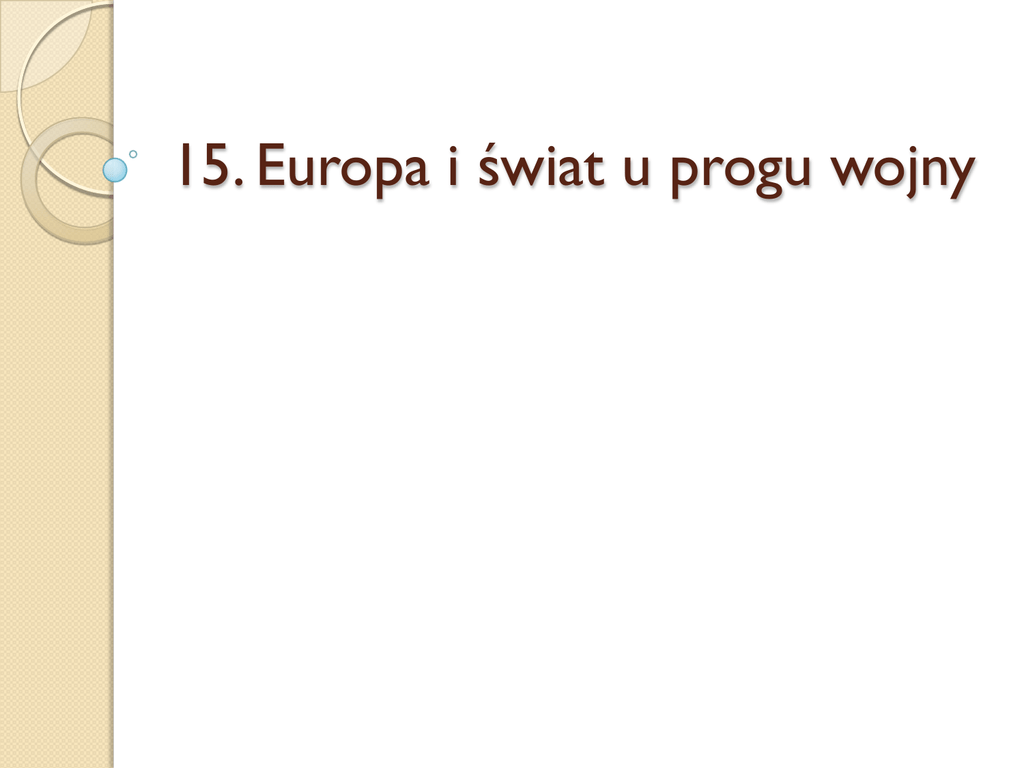 15. Europa i świat u progu wojny 1. Idee rozbrojeniowe i pakty międzynarodowe w okresie międzywojennym 1919r. - Liga Narodów 1921-1922 – konferencja waszyngtońska 1929r. - pakt Brianda-Kelloga (dotyczący wyrzeczenia się prowadzenia wojen) 1932r. konferencja rozbrojeniowa w Genewie (nieudana; sprzeciw Włoch i Niemiec) 1933r. propozycja powstania „paktu czterech” (Wielka Brytania, Francja, Włochy, Niemcy) 1934. idea „paktu wschodniego” (ZSRR, Polska, Francja, Niemcy, Belgia, Czechosłowacja, Litwa, Łotwa, Estonia) 2. Kruszenie się systemu wersalskiego ◦ ◦ ◦ ◦ układ w Rapallo 1922 układ w Locarno (traktaty reńskie) 1925 traktat o przyjaźni radziecko-niemiecki 1926 wejście Niemiec do Ligi Narodów 1926 3. Ekspansja Japonii Rozwój Japonii od XIX w. (rewolucja Meiji) Kryzys ekonomiczny – do władzy dostali się militaryści Hasło „Azja dla Azjatów” – miało powstać Imperium Wspólnego Dobrobytu Wielkiej Azji Wschodniej (pod przewodnictwem Japonii) ◦ ◦ ◦ ◦ Hasło zniesienia demokracji Autarkia (samowystarczalność ekonomiczna) nacjonalizacja państwa „wyzwolenie 700 milionów braci” w Indiach, Filipinach i innych koloniach europejskich 1931r. Atak na Mandżurię; utworzenie cesarstwa Mandżukuo 1933r wystąpienie w Ligi Narodów 1937r. incydent na moście Marco Polo Szybkie zdobycie Pekinu, Szanghaju, Katonu 1938r. Chińczycy przeszli do walk partyzanckich Japońskie zbrodnie w Chinach 1937/1938 Japończycy przez 6 tygodni mordowali cywilów m.in zasypywania mieszkańców żywcem, zawody w ścinaniu głów samurajskim mieczem, ćwiczenia w pchnięciu bagnetem Śmierć ok. 300 tysięcy ludzi Podobne morderstwa miały miejsce w 1937r. w Szanghaju (200 tyś. ofiar) 4. Agresja włoska na Abisynię (19351936) 1934 tajne porozumienie Włoch z Francją i Wielką Brytanią Po ataku sankcje Ligi Narodów na Włochy (nie objęły węgla i ropy naftowej) 1936 utworzenie Drugiego Imperium Rzymskiego 5. Wojna domowa w Hiszpanii (1936-1939) Luty 1936 wybory parlamentarne; zwycięstwo lewicowego Frontu Ludowego (republikanie, socjaliści, komuniści) Wprowadzenie reform przeciwko armii i duchowieństwu Kryzys w państwie Lipiec 1936 bunt w garnizonach wojskowych; stłumiono Garnizon w Maroku kontrolowany przez gen. Franco Początek wojny domowej ZSRR, Francja, Wielka Brytania, Niemcy i Włochy tworzą Komitet Nieinterwencji; Mimo tego pomoc Niemców i Włochów generałowi Franco, a ZSRR Frontowi Ludowemu Niemcy wysłali m.in. Legion Condor Ok. 30-40 tysięcy ochotników o poglądach lewicowych Styczeń 1939 Franco zajął Barcelonę, a 28 marca wszedł do Madrytu W wojnie zginęło ok. 1 mln ludzi 6. Droga Hitlera ku wojnie 1933r. - Przejęcie władzy przez Hitlera październik 1933r. - Wystąpienie Niemiec z Ligi Narodów 1 marca 1935r. plebiscyt w zagłębiu Saary – przyłączenie Zagłębia do Niemiec 16 marca 1935r. – wprowadzenie obowiązku służby wojskowej; jawne pogwałcenie ustaleń wersalskich appeasement (ang. Ugłaskiwanie) b) remilitaryzacja Nadrenii c) Anschluss Austrii (12.03.1938) d) kryzys sudecki i układ monachijski (29/30.09.1938) a) e) Aneksja i podział Czechosłowacji Na mocy układu monachijskiego Czechosłowacja straciła 1/5 terytorium i ¼ ludności, 40% potencjału przemysłowego 14 marca lider Słowaków ksiądz Tiso ogłosił niepodległość 15 marca 1939r. Rzesza zajmuje resztę Czechosłowacji i ogłasza stworzeniu Protektoratu Czech i Moraw Węgry zabierają cz. Ruś Zakarpacką f) Zajęcie Kłajpedy (23 marca 1939)