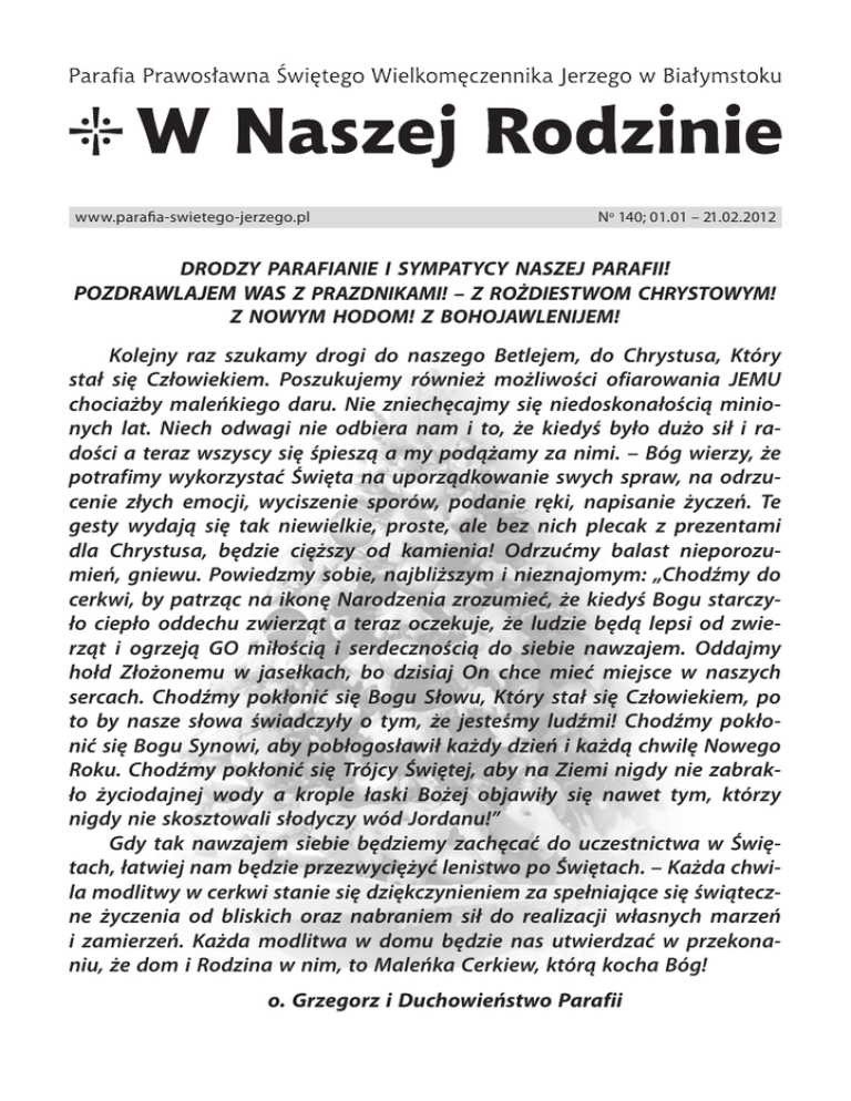 www.parafia-swietego-jerzego.pl No 140; 01.01 – 21.02.2012 DRODZY PARAFIANIE I SYMPATYCY NASZEJ PARAFII! POZDRAWLAJEM WAS Z PRAZDNIKAMI! – Z ROŻDIESTWOM CHRYSTOWYM! Z NOWYM HODOM! Z BOHOJAWLENIJEM! Kolejny raz szukamy drogi do naszego Betlejem, do Chrystusa, Który stał się Człowiekiem. Poszukujemy również możliwości ofiarowania JEMU W NASZEJ PARAFII chociażby maleńkiego daru. Nie zniechęcajmy się niedoskonałością minio nych lat. Niech odwagi nie odbiera nam i to, że kiedyś było dużo sił i ra dości a teraz wszyscy się śpieszą a my podążamy za nimi. – Bóg wierzy, że potrafimy wykorzystać Święta na uporządkowanie swych spraw, na odrzu cenie złych emocji, wyciszenie sporów, podanie ręki, napisanie życzeń. Te gesty wydają się tak niewielkie, proste, ale bez nich plecak z prezentami dla Chrystusa, będzie cięższy od kamienia! Odrzućmy balast nieporozu mień, gniewu. Powiedzmy sobie, najbliższym i nieznajomym: „Chodźmy do cerkwi, by patrząc na ikonę Narodzenia zrozumieć, że kiedyś Bogu starczy ło ciepło oddechu zwierząt a teraz oczekuje, że ludzie01.01. będą– 21.02.2012 lepsi od zwie NABOŻEŃSTWA W NASZEJ CERKWI rząt i ogrzeją GO miłością i serdecznością do siebie nawzajem. Oddajmy hołd Złożonemu w jasełkach, bo dzisiaj On chce mieć miejsce w naszych sercach. Chodźmy pokłonić się Bogu Słowu, Który stał się Człowiekiem, po to by nasze słowa świadczyły o tym, że jesteśmy ludźmi! Chodźmy pokło nić się Bogu Synowi, aby pobłogosławił każdy dzień i każdą chwilę Nowego Roku. Chodźmy pokłonić się Trójcy Świętej, aby na Ziemi nigdy nie zabrak ło życiodajnej wody a krople łaski Bożej objawiły się nawet tym, którzy nigdy nie skosztowali słodyczy wód Jordanu!” Parafia św. wlkm Jerzego na Nowym zachęcać Mieście GdyPrawosławna tak nawzajem siebie będziemy do uczestnictwa w Świę 15-338 Białystok, ul.Pułaskiego 36 tach, łatwiej nam będzie przezwyciężyć lenistwo po Świętach. – Każda chwi laKancelaria: modlitwy w cerkwi stanie się dziękczynieniem za spełniające się świątecz #JBZTUPLVM,SVD[BtD[ZOOBDPE[JFOOJFXHPE[00 - 1800tUFM netLPOUBLUIUFMtFNBJMLBODFMBSJB!QBSBöBTXJFUFHPKFS[FHPQM życzenia od bliskich oraz nabraniem sił do realizacji własnych marzeń i tLPOUP zamierzeń. Każda modlitwa w domu będzie nas utwierdzać w przekona niu, że dom i Rodzina w nim, to Maleńka Cerkiew, którą kocha Bóg! Duchowieństwo: tQSPCPT[D[LTNJUSBU(S[FHPS[.JTJKVLtLTQSPU8BMFSJBO"OUPTJVLUFM o. Grzegorz i Duchowieństwo Parafii tLTQSPU8BEZTBX.BTBKPUFMtLTQSPUPE5PNBT[$ZSLVOUFM POSŁUGI POŚWIĘCENIA DOMÓW W NASZEJ PARAFII DOKONUJĄ Proboszcz ks. Grzegorz Misijuk (tel.85 746 50 20) 20.01.Pt 1200 – 2000 kol. Lewickie, Hryniewicze, Olmonty i blok przy ul. Wiadukt 21.01.So 900 – 1600 Kleosin domki (oprócz ul: Kruczkowskiego i Wańkowicza i Zambrowskiej) 23.01.Pn 1200 – 2000 Horodniany, Koplany, Księżyno, Ignatki (tylko ulica Zalesie), Kleosin domki ulic: Kruczkowskiego, Wańkowicza i Zambrowska 24.01.Wt 1500 – 2000 Ignatki ul. Jodłowa, Przejezdna i Leśna. 26.01.Cz 1500 – 2000 ul. Starosielce, Ścianka, Cementowa, Łodzińskiego i Przyrodnicza 27.01.Pt 1500 – 2000 ul. Transportowa. 28.01.So 900 – 1600 Kawaleryjska, Pszczela, Zapiecek, Plater, Nowa, Horodniańska, Harcerska, Poludniowa 30.01.Pn 1400 2000 Gołębia, Kredytowa, Ułańska, Strzelecka, Wspólna, Pracownicza w dniu: 31.01.Wt zgłoszenia dodatkowe i w uzgodnionych godzinach. o. Walerian Antosiuk (85 744 91 92) i o. Tomasz Cyrkun (85 744 96 70) 20.01.Pt 1500 – 2000 Kleosin ul. Kruczkowskiego 19, 19A, 21, 23, 25 21.01.So 1500 – 1600 i 1900 – 2000 Kleosin ul. Tarasiuka 3 i ul. Krucza 6, 6A 22.01.N 1300 – 1600 i 1800 – 2000 ul. Kisiela 5A, 5B, 5C, 15, 17 oraz ul. Zachodnia 2, 2A, 2B, 2C, 2D 23.01.Pn 1300 – 2000 Kleosin ul. Wyszyńskiego: 2, 3, 4, 5, 6, 6A,7, 8, 8A,10 24.01.Wt 1500 – 2000 ul. Zachodnia 1, 3, 5, 5A, 5B, 7, 9, 11, 13, 13B, 15, 15A 25.01.Śr 1500 – 2000 ul. Pułaskiego 5B, 8, 11, 16A, 17, 26, 31, 43, 45 26.01.Cz 1500 – 2000 ul. Pułaskiego 47/1, 47/2, 57 27.01.Pt 1500 – 2000 ul. Pułaskiego 65, 67, 69, 87 28.01.So 1500 – 2000 ul. Pułaskiego 89, 91, 93, 95, 97 29.01.N 1500 – 2000 ul. Dubois 2, 6, 10, 16, 18 30.01.Pn 1500 – 2000 ul. Dubois 3, 5, 5A, 7 31.01.Wt 1500 – 2000 ul. Dubois 9, 11, 20, 22 01.02.Śr 1500 – 2000 ul. Dubois 15, 23 02.02.Cz 1500 – 1630 i 1800 – 2000 ul. Dubois 19, 21 i ul. Pułaskiego 51, 48/8, 72, 80, 84, 104 03.02.Pt 1500 – 2000 ul. Dubois 17, 25, 27 04.02.So 13oo – 16oo i 19oo – 20oo ul. Zachodnia10, 14, 14A, 16, 18, 18B 05.02.N 13oo – 16oo i 18oo – 20oo ul. Zachodnia 20, 20A, 22, 24, 24A, 26, 28, 32 06.02.Pn 15oo – 20oo ul. Zachodnia 28A, 30A, 32A, 36 o. Władysław Masajło (+783344309) i o. Tomasz Cyrkun (85 744 96 70) 20.01.Pt 1530 – 2000 ul. Rzymowskiego 49a, 49b, 51a, 53, i 43 21.01.So 1000 – 2000 ul. Rzymowskiego 23, 21, 19, 40, 38 22.01.Nd 1300 – 2000 ul. Rzymowskiego 36, 34, 32, 30, 22 23.01.Pn 1530 – 2000 ul. Rzymowskiego 18, 16, 14, 12 24.01.Wt 1530 – 1630 ul. Żeromskiego 3B, 5, 5a/1, 5c 1830 – 2000 ul. Żeromskiego 4, ul. Krucza 5/1, 5/2 25.01.Śr 1530 – 1630 i 18.00 – 2000 ul. Rzymowskiego 10, 8, 4 26.01.Cz 1530 – 1640 ul. Kręta 3, 35, 66, 72 1800 – 2000 Oś. Śródlesie 27.01.Pt 1530 – 2000 ul. Kręta 6, 8, 8/1, 10, 12, 14 28.01.So 1000 – 2000 ul. Kręta 16, 18, 56a b c d e f 29.01.N 1000 – 2000 ul. Pułaskiego 99, 101, 103, 30.01.Pn 1300 – 2000 ul. Pułaskiego 109, 109A, 109B, 109C, 113 www.parafia-swietego-jerzego.pl No 139; 20.11 – 31.12.2011 31.01.Wt 1530 – 2000 ul. Pułaskiego 115, 117, 119, 123 01.02.Śr 1530 – 2000 ul. Pułaskiego 59, 61, 63 02.02.Cz 1530 – 2000 Kleosin ul. Kraszewskiego 1, 2, 2a, 2b, 2c 03.02.Pt 1530 – 2000 Kleosin ul. Kraszewskiego 2d, 4, 6, 8, 10 o www.parafia-swietego-jerzego.pl N 140; 01.01 – 21.02.2012 04.02.Sb 1000 – 2000 Kleosin ul. Kraszewskie