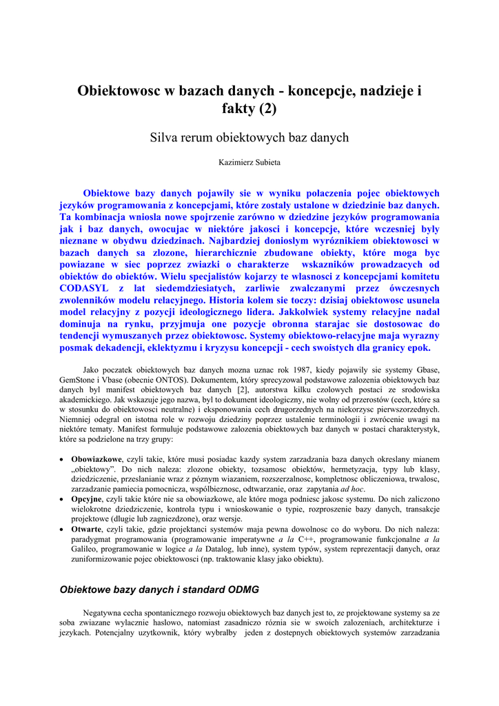 Obiektowosc w bazach danych - koncepcje, nadzieje i fakty (2) Silva rerum obiektowych baz danych Kazimierz Subieta Obiektowe bazy danych pojawily sie w wyniku polaczenia pojec obiektowych jezyków programowania z koncepcjami, które zostaly ustalone w dziedzinie baz danych. Ta kombinacja wniosla nowe spojrzenie zarówno w dziedzine jezyków programowania jak i baz danych, owocujac w niektóre jakosci i koncepcje, które wczesniej byly nieznane w obydwu dziedzinach. Najbardziej donioslym wyróznikiem obiektowosci w bazach danych sa zlozone, hierarchicznie zbudowane obiekty, które moga byc powiazane w siec poprzez zwiazki o charakterze wskazników prowadzacych od obiektów do obiektów. Wielu specjalistów kojarzy te wlasnosci z koncepcjami komitetu CODASYL z lat siedemdziesiatych, zarliwie zwalczanymi przez ówczesnych zwolenników modelu relacyjnego. Historia kolem sie toczy: dzisiaj obiektowosc usunela model relacyjny z pozycji ideologicznego lidera. Jakkolwiek systemy relacyjne nadal dominuja na rynku, przyjmuja one pozycje obronna starajac sie dostosowac do tendencji wymuszanych przez obiektowosc. Systemy obiektowo-relacyjne maja wyrazny posmak dekadencji, eklektyzmu i kryzysu koncepcji - cech swoistych dla granicy epok. Jako poczatek obiektowych baz danych mozna uznac rok 1987, kiedy pojawily sie systemy Gbase, GemStone i Vbase (obecnie ONTOS). Dokumentem, który sprecyzowal podstawowe zalozenia obiektowych baz danych byl manifest obiektowych baz danych [2], autorstwa kilku czolowych postaci ze srodowiska akademickiego. Jak wskazuje jego nazwa, byl to dokument ideologiczny, nie wolny od przerostów (cech, które sa w stosunku do obiektowosci neutralne) i eksponowania cech drugorzednych na niekorzysc pierwszorzednych. Niemniej odegral on istotna role w rozwoju dziedziny poprzez ustalenie terminologii i zwrócenie uwagi na niektóre tematy. Manifest formuluje podstawowe zalozenia obiektowych baz danych w postaci charakterystyk, które sa podzielone na trzy grupy: • Obowiazkowe, czyli takie, które musi posiadac kazdy system zarzadzania baza danych okreslany mianem „obiektowy”. Do nich naleza: zlozone obiekty, tozsamosc obiektów, hermetyzacja, typy lub klasy, dziedziczenie, przeslanianie wraz z póznym wiazaniem, rozszerzalnosc, kompletnosc obliczeniowa, trwalosc, zarzadzanie pamiecia pomocnicza, wspólbieznosc, odtwarzanie, oraz zapytania ad hoc. • Opcyjne, czyli takie które nie sa obowiazkowe, ale które moga podniesc jakosc systemu. Do nich zaliczono wielokrotne dziedziczenie, kontrola typu i wnioskowanie o typie, rozproszenie bazy danych, transakcje projektowe (dlugie lub zagniezdzone), oraz wersje. • Otwarte, czyli takie, gdzie projektanci systemów maja pewna dowolnosc co do wyboru. Do nich naleza: paradygmat programowania (programowanie imperatywne a la C++, programowanie funkcjonalne a la Galileo, programowanie w logice a la Datalog, lub inne), system typów, system reprezentacji danych, oraz zuniformizowanie pojec obiektowosci (np. traktowanie klasy jako obiektu). Obiektowe bazy danych i standard ODMG Negatywna cecha spontanicznego rozwoju obiektowych baz danych jest to, ze projektowane systemy sa ze soba zwiazane wylacznie haslowo, natomiast zasadniczo róznia sie w swoich zalozeniach, architekturze i jezykach. Potencjalny uzytkownik, który wybralby jeden z dostepnych obiektowych systemów zarzadzania bazami danych (SZBD), bylby praktycznie skazany na ten produkt, uzaleznilby sie od kaprysów jednego dostawcy i bylby narazony na powazne trudnosci, o ile ten dostawca zostalby wyeliminowany z rynku. Przelamanie podobnych sytuacji, które wczesniej zdarzaly sie w informatyce, odbywalo sie zwykle na dwa sposoby. Pierwszy z nich sprowadzal sie do tego, ze duza firma lansowala produkt, jezyk lub model, który bazujac na autorytecie firmy zyskiwal sobie rynek, tworzac de facto standard. Reszta firm musiala sie do tego standardu dostosowac. Drugi sposób polega na odgórnym wypracowaniu standardu, który nastepnie jest rozpowszechniony i podtrzymywany przez wielu dostawców; przykladem moga byc relacyjne bazy danych i SQL. Taka inicjatywa standaryzacyjna1 jest standard ODMG (Object Database Management Group) [3]. W sklad grupy ODMG wchodza przedstawiciele kilkunastu (malych i srednich) firm komputerowych, wsród nich O2 Technology, ObjectDesign, POET Software, GemStone Systems, Versant Object Technology, Objectivity i inne. Poprzednie dwie wersje standardu byly okreslane jako ODMG-93, obecna (z czerwca 1997) jest okreslana jako ODMG 2.0. Standard jest jeszcze niedoskonaly i jest przedmiotem debaty majacej na celu usuniecie jego licznych wad; niemniej jako ambitny cel stawia sobie przenaszalnosc (portability) aplikacji pomiedzy niezaleznie zbudowanymi systemami. Standard ODMG lezy na przecieciu trzech dziedzin: baz danych (SQL), technologii obiektowych (OMG CORBA) oraz obiektowych jezyków programowania (C++, Smalltalk, Java). Standard ODMG obejmuje nastepujace elementy: • Model obiektowy, który precyzuje znaczenie podstawowych pojec obiektowosci, takich jak obiekty, klasy, metody, dziedziczenie, hermetyzacja. Ustala on równiez podstawowe zalozenia dotyczace struktur danych przechowywanych przez system. Takimi strukturami sa obiekty, atrybuty i zwiazki (relationships). Klasy obiektów podlegaja dziedziczeniu i hermetyzacji. ODMG wprowadza takze pojecie literala, czyli takiego obiektu, którego nie mozna modyfikowac. Istotnym zalozeniem modelu obiektowego ODMG jest mocna kontrola typów oraz pelna dowolnosc w zakresie kombinacji konstruktorów typów, w tym konstruktorów typów masowych (kolekcji), takich jak zbiór, wielozbiór, sekwencja i tablica dynamiczna. Umozliwia to tworzenie obiektów o dowolnej liczbie poziomów hierarchii oraz o dowolnej zlozonosci. Model obiektowy ODMG jest rozszerzeniem modelu OMG CORBA; dotyczy to m.in. zwiazków pomiedzy obiektami. • Jezyk opisu danych ODL (Object Definition Language), który jest wzorowany na jezyku IDL wg OMG CORBA.