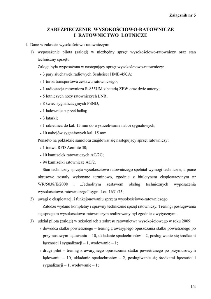 Załącznik nr 5 ZABEZPIECZENIE WYSOKOŚCIOWO-RATOWNICZE I RATOWNICTWO LOTNICZE 1. Dane w zakresie wysokościowo-ratowniczym: 1) wyposażenie pilota (załogi) w niezbędny sprzęt wysokościowo-ratowniczy oraz stan techniczny sprzętu Załoga była wyposażona w następujący sprzęt wysokościowo-ratowniczy: • 3 pary słuchawek radiowych Senheiser HME-45CA; • 1 torba transportowa zestawu ratowniczego; • 1 radiostacja ratownicza R-855UM z baterią ZEW oraz dwie anteny; • 5 lotniczych noży ratowniczych LNR; • 8 świec sygnalizacyjnych PSND; • 1 ładownica z przekładką; • 3 latarki; • 1 rakietnica do kal. 15 mm do wystrzeliwania naboi sygnałowych; • 10 nabojów sygnałowych kal. 15 mm. Ponadto na pokładzie samolotu znajdował się następujący sprzęt ratowniczy: • 1 tratwa RFD Aerolite 30; • 10 kamizelek ratowniczych AC/2C; • 94 kamizelki ratownicze AC/2. Stan techniczny sprzętu wysokościowo-ratowniczego spełniał wymogi techniczne, a prace okresowe zostały wykonane terminowo, zgodnie z biuletynem eksploatacyjnym nr WR/5038/E/2008 i „Jednolitym zestawem obsług technicznych wyposażenia wysokościowo-ratowniczego” sygn. Lot. 1631/75; 2) uwagi o eksploatacji i funkcjonowaniu sprzętu wysokościowo-ratowniczego Załodze wydano kompletny i sprawny technicznie sprzęt ratowniczy. Treningi posługiwania się sprzętem wysokościowo-ratowniczym realizowany był zgodnie z wytycznymi. 3) udział pilota (załogi) w szkoleniach z zakresu ratownictwa wysokościowego w roku 2009: • dowódca statku powietrznego – trening z awaryjnego opuszczania statku powietrznego po przymusowym lądowaniu – 10, układanie spadochronów – 2, posługiwanie się środkami łączności i sygnalizacji – 1, wodowanie – 1; • drugi pilot – trening z awaryjnego opuszczania statku powietrznego po przymusowym lądowaniu – 10, układanie spadochronów – 2, posługiwanie się środkami łączności i sygnalizacji – 1, wodowanie – 1; 1/4 • nawigator – trening z awaryjnego opuszczania statku powietrznego po przymusowym lądowaniu – 10, układanie spadochronów – 2, posługiwanie się środkami łączności i sygnalizacji – 1, wodowanie – 1; • technik pokładowy – trening z awaryjnego opuszczania statku powietrznego po przymusowym lądowaniu – 10, układanie spadochronów – 2, posługiwanie się środkami łączności i sygnalizacji – 1, wodowanie – 1; 4) liczba skoków spadochronowych wykonanych przez pilota (załogę): • dowódca statku powietrznego – 6 skoków, data ostatniego skoku – 18.05.1996 r.; • drugi pilot – 5 skoków, data ostatniego skoku – 08.08.1995 r.; • nawigator – 8 skoków, data ostatniego skoku – 26.09.2003 r.; • technik pokładowy – 0 skoków; 5) liczba katapultowań treningowych: • dowódca statku powietrznego – 4 UTKZ, data ostatniego – 05.05.1997 r.; • drugi pilot – 4 UTKZ, data ostatniego – 05.05.1997 r.; • nawigator – 4 UTKZ, data ostatniego – 29.05.2001 r.; 6) liczba katapultowań samolotowych – żaden z członków załogi nie wykonywał katapultowań samolotowych; 7) liczba treningów z wykorzystaniem kamizelki i łódki ratunkowej • dowódca statku powietrznego – 1 wodowanie; • drugi pilot – 1 wodowanie; • nawigator – 1 wodowanie; • technik pokładowy – 1 wodowanie; 8) ocena stanu wyszkolenia wysokościowo-ratowniczego pilota (załogi) Dowódca statku powietrznego, drugi pilot i nawigator odbyli wymagane szkolenia i byli właściwie przygotowani do wykorzystania sprzętu wysokościowo-ratowniczego w sytuacji awaryjnej. Technik pokładowy odbył wymagane szkolenia i był właściwie przygotowany do wykorzystania sprzętu wysokościowo-ratowniczego. Zgodne z rozkazem Dowódcy Sił Powietrznych nr 31 z dnia 13.02.2009 r. pkt 8 ppkt 1, personel latający w ramach szkolenia wysokościowo-ratowniczego zobowiązany jest do wykonywania skoków spadochronowych. Technik pokładowy do dnia wypadku nie wykonał żadnego skoku spadochronowego. 9) sposób i warunki, w jakich pilot (załoga) opuścił statek powietrzny, który uległ zdarzeniu lotniczemu Z uwagi na okoliczności i przebieg zdarzenia zarówno załoga, jak i pasażerowie nie podjęli próby opuszczenia statku powietrznego przed i po zderzeniu z ziemią. 10) wykorzystanie osobistych środków ratowniczych przez pilota (załogę) – nie wykorzystano; 2/4 11) osoba odpowiedzialna za zabezpieczenie wysokościowo-ratownicze: • stanowisko służbowe, stopień wojskowy, imię i nazwisko – starszy instruktor pionu szkolenia 36 splt; • wyszkolenie specjalistyczne – instruktor spadochronowy klasy M; • staż pracy w służbie – 17 lat; 12) stwierdzone niedociągnięcia w służbie wysokościowo-ratowniczej W 36 splt nie realizuje się szkolenia wysokościowo-ratowniczego w zakresie wykonywania skoków spadochronowych przez techników pokładowych. Technicy pokładowi z Mi-8 i M-28, którzy mają wykonane skoki spadochronowe, zrealizowali je w jednostkach, w których służyli przed przejściem do 36 splt. 2. Dane w zakresie ratownictwa lotniczego: 1) uruchomienie systemu ratownictwa lotniczego (kto, w jakim czasie i z użyciem jakich środków podjął akcję) – strona polska nie uzyskała od strony rosyjskiej dokumentów na temat uruchomienia akcji ratowniczej. Z informacji uzyskanych przez Komisję wynika, że pierwszy zespołu strażacki przybył dopiero po 14 min po zaistnieniu. Podmokły i wilgotny teren, na którym rozbił się Tu-154M, uchronił przed rozprzestrzenianiem się pożaru. Na pokładzie samolotu była niewielka ilość paliwa – w wyniku urwania się fragmentu skrzydła i rozszczelnienia się zbiorników paliwowych. Te dwa czynniki ograniczyły zasięg pożaru. W żadnym razie nie można mówić o dobrze przeprowadzonej akcji ratowniczej; 2) działanie systemu ratownictwa lotniczego (czas i sposób odnalezienia załogi, udzielanie pomocy oraz inne istotne informacje) W informacji na temat 