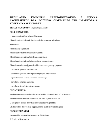 REGULAMIN KONKURSU PRZEDMIOTOWEGO Z JĘZYKA ANGIELSKIEGI DLA UCZNIÓW GIMNAZJUM ZSO IM.MIKOŁAJA KOPERNIKA W ZATORZE. TEMAT KONKURSU: Angielski jest prosty. CELE KONKURSU: 1. ukazywanie różnorodności literatury 2.kształcenie umiejętności kojarzenia i sprawnego udzielania odpowiedzi 3.rozwijanie wyobraźni 4.kształcenie poprawności stylistycznej 5.kształcenie umiejętności płynnego czytania 6.kształcenie umiejętności czytania ze zrozumieniem 7.kształtowanie umiejętności odbioru tekstu czytanego poprzez: - określanie głównej myśli tekstu - określanie głównej myśli poszczególnych części tekstu - wyszukiwanie, selekcjonowanie informacji - określanie intencji nadawcy - określanie kontekstu sytuacyjnego ORGANIZACJA: Konkurs przeznaczony jest dla uczniów klas Gimnazjum ZSO W Zatorze Konkurs odbędzie się 6 czerwca 2013 roku o godzinie 14.15 O kolejności miejsc decyduje liczba zdobytych punktów Dla laureatów przewiduje się przyznanie dyplomów oraz nagród ODPOWIEDZIALNI: Nauczyciele języka niemieckiego w ZSO Zator T.Konik, M.Fonderska FORMA KONKURSU: Test składający się z zadań zamkniętych i otwartych obejmujący następujące części: czytanie, test leksykalno- gramatyczny, reakcje językowe. Czas trwania konkursu: 60 min I Obszary umiejętności: Uczeń posługuje się w miarę rozwiniętym zasobem środków językowych (leksykalnych, gramatycznych, ortograficznych), rozumie wypowiedzi pisemne, dobiera poprawne reakcje w typowych sytuacjach komunikacyjnych, przetwarza wypowiedź pisemną. II Wymagane treści: 1. Zakres leksykalny: 1) człowiek - np. dane personalne, wygląd zewnętrzny, cechy charakteru, uczucia i emocje, zainteresowania; 2) dom – np. miejsce zamieszkania, jego położenie, rodzaje domów, opis domu, pomieszczenia i ich wyposażenie, wynajmowanie mieszkania; 3) szkoła – np. przedmioty nauczania, oceny i wymagania, życie szkoły, kształcenie pozaszkolne; 4) praca – np. popularne zawody i czynności z nimi związane, miejsca pracy, warunki pracy i zatrudnienia, praca dorywcza; 5) życie rodzinne i towarzyskie – np. okresy życia, członkowie rodziny, koledzy, przyjaciele, czynności życia codziennego, formy spędzania wolnego czasu, święta i uroczystości, styl życia, konflikty i problemy; 6) żywienie – np. artykuły spożywcze, posiłki i ich przygotowanie, lokale gastronomiczne, diety; 7) zakupy i usługi – np. rodzaje sklepów, towary, sprzedawanie i kupowanie, reklama, korzystanie z usług; 8) podróżowanie i turystyka – np. wycieczki, zwiedzanie, środki transportu, orientacja w terenie, baza noclegowa, informacja turystyczna, nazwy krajów i kontynentów; 9) kultura – np. dziedziny kultury, twórcy i ich dzieła, uczestnictwo w kulturze, media; 10) sport – np. dyscypliny sportowe, sprzęt sportowy, imprezy sportowe, sport wyczynowy; 11) zdrowie – np. zdrowy tryb życia, samopoczucie, dolegliwości i choroby, ich objawy i leczenie, uzależnienia; 12) nauka i technika – np. odkrycia naukowe, wynalazki, obsługa i korzystanie z podstawowych urządzeń technicznych, awarie, technologie informacyjno-komunikacyjne; 13) świat przyrody – np. pogoda, klimat, rośliny i zwierzęta, krajobraz, zagrożenie i ochrona środowiska naturalnego; 2. Zakres gramatyczny: 1) czasownik: ‘to be’ – Present and Past (w tym there is/are/was/were); Have/have got; czasowniki regularne i nieregularne; formy czasownika - bezokolicznik (Infinitive) i Gerund; czasowniki modalne - must, mustn’t, will, would, shall, should, shouldn’t, ought to, have to/don’t have to, can, could, needn’t, may, might; tryb rozkazujący; 2) czasy gramatyczne (zdania twierdzące, pytające, przeczące): Present Simple, Present Continuous, Past Simple, Past Continuous, Present Perfect Simple, Present Perfect Continuous, Future Simple, Future Continuous, Past Perfect Simple, Past Perfect Continuous, to be going to; 3) question tags 4) rzeczownik: liczba pojedyncza i mnoga (regularna, nieregularna), rzeczowniki policzalne i niepoliczalne; Genetive ‘s (l.poj. i l.mn.); 5) przedimek: nieokreślony, określony oraz brak przedimka; 6) określniki: any, some, many, much, a lot of, lots of, a couple of, (a) little, (a) few 7) liczebnik: liczebniki główne i porządkowe; 8) przymiotnik i przysłówek: stopniowanie przymiotników i przysłówków, przymiotniki dzierżawcze; too, not enough, so, such; konstrukcje porównawcze; szyk przymiotników w zdaniu; przysłówki częstotliwości, czasu, miejsca, stopnia, sposobu; tworzenie przysłówków od przymiotników, przymiotniki złożone (np. blue-eyed); 9) przyimek: przyimki miejsca, czasu, ruchu, celu; wyrażenia przyimkowe; 10) spójnik: and, but, or, as, because, so, unless, while, when; although, though, however, despite; 11) zaimek: zaimki wskazujące; zaimki osobowe w formie podmiotu i w formie dopełnienia; zaimki nieokreślone; zaimki dzierżawcze; zaimki pytające oraz each other, one another, others, the other, another; 12) okresy warunkowe: 0 Conditional, 1st Conditional, 2nd Conditional; 13) zdania czasowe; 14) zdania przydawkowe: defining and non-defining relative clauses; 15) następstwo czasów i mowa zależna - Reported Speech; 16) strona bierna - Passive Voice; Proponowana bibliografia: 1. Podręczniki i repetytoria do nauki języka angielskiego przeznaczone dla uczniów szkół gimnazjalnych. 2. Słowniki języka angielskiego. 3. Gramatyki języka angielskiego. 4. Czasopisma do nauki języka angielskiego. 5. Evans, V. FCE Use of English, Express Publishing. 6. Murphy, R. English Grammar in Use, Cambridge University Press.