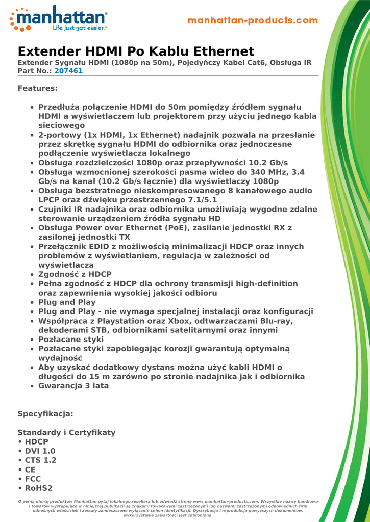 Extender HDMI Po Kablu Ethernet Extender Sygnału HDMI (1080p na 50m), Pojedyńczy Kabel Cat6, Obsługa IR Part No.: 207461 Features: Przedłuża połączenie HDMI do 50m pomiędzy źródłem sygnału HDMI a wyświetlaczem lub projektorem przy użyciu jednego kabla sieciowego 2-portowy (1x HDMI, 1x Ethernet) nadajnik pozwala na przesłanie przez skrętkę sygnału HDMI do odbiornika oraz jednoczesne podłączenie wyświetlacza lokalnego Obsługa rozdzielczości 1080p oraz przepływności 10.2 Gb/s Obsługa wzmocnionej szerokości pasma wideo do 340 MHz, 3.4 Gb/s na kanał (10.2 Gb/s łącznie) dla wyświetlaczy 1080p Obsługa bezstratnego nieskompresowanego 8 kanałowego audio LPCP oraz dźwięku przestrzennego 7.1/5.1 Czujniki IR nadajnika oraz odbiornika umożliwiają wygodne zdalne sterowanie urządzeniem źródła sygnału HD Obsługa Power over Ethernet (PoE), zasilanie jednostki RX z zasilonej jednostki TX Przełącznik EDID z możliwością minimalizacji HDCP oraz innych problemów z wyświetlaniem, regulacja w zależności od wyświetlacza Zgodność z HDCP Pełna zgodność z HDCP dla ochrony transmisji high-definition oraz zapewnienia wysokiej jakości odbioru Plug and Play Plug and Play - nie wymaga specjalnej instalacji oraz konfiguracji Współpraca z Playstation oraz Xbox, odtwarzaczami Blu-ray, dekoderami STB, odbiornikami satelitarnymi oraz innymi Pozłacane styki Pozłacane styki zapobiegając korozji gwarantują optymalną wydajność Aby uzyskać dodatkowy dystans można użyć kabli HDMI o długości do 15 m zarówno po stronie nadajnika jak i odbiornika Gwarancja 3 lata Specyfikacja: Standardy i Certyfikaty • HDCP • DVI 1.0 • CTS 1.2 • CE • FCC • RoHS2 O pełną ofertę produktów Manhattan pytaj lokalnego resellera lub odwiedź stronę www.manhattan-products.com. Wszystkie nazwy handlowe i towarów występujące w niniejszej publikacji są znakami towarowymi zastrzeżonymi lub nazwami zastrzeżonymi odpowiednich firm odnośnych właścicieli i zostały zamieszczone wyłącznie celem identyfikacji. Dystrybucja i reprodukcja powyższych dokumentów, wykorzystanie zawartości jest zabronione. Specyfikacja techniczna • 1080p przy użyciu kabla Cat6 o długości do 50 m • 720p przy użyciu kabla Cat6 o długości do 70 m • 480p przy użyciu kabla Cat6 o długości do 100 m • Zasilanie: 5V DC / 1A, kabel 1.4m Złącza • 2 x HDMI żeńskie (nadajnik) • 1 x HDMI żeńskie (odbiornik) • 1 x RJ45 żeńskie (nadajnik / odbiornik) • 1 x zasilanie 5V DC żeńskie (nadajnik) • 1 x 3.5 mm/IR żeńskie: (nadajnik / odbiornik) Sygnał wejściowy/wyjściowy • Wejściowy sygnał wideo: 0.5 V - 1 V p-p • Wejściowy sygnał DDC: 5 V p-p (TTL) • Maksymalny zakres pojedynczego linku:1920x1200/60Hz, 1080p • Wyjście wideo: HDCP 1.2, DVI 1.0 • Częstotliwość: 3.4 Gb/s / 340 MHz Rozdzielczość wideo • VGA: 640 x 480, 800 x 600, 1024 x 768, 1920 x 1200 • DTV/HDTV: 480i/480p/576i/576p/720p/1080i/1080p Parametry fizyczne • Wymiary: 69 x 80 x 17 mm • Waga: 0,35 kg • Metalowa obudowa Warunki otoczenia: • Temperatura pracy: 0 ~ 40°C (32 ~ 104°F) • Temperatura magazynowania: -20 ~ 60°C (-4 ~ 140°F) • Wilgotność: 0 ~ 96% (bez kondensacji) Zawartość opakowania • Extender HDMI (Moduł nadajnika oraz odbiornika) • Adapter zasilania • Czujnik IR • Instrukcja szybkiej instalacji O pełną ofertę produktów Manhattan pytaj lokalnego resellera lub odwiedź stronę www.manhattan-products.com. Wszystkie nazwy handlowe i towarów występujące w niniejszej publikacji są znakami towarowymi zastrzeżonymi lub nazwami zastrzeżonymi odpowiednich firm odnośnych właścicieli i zostały zamieszczone wyłącznie celem identyfikacji. Dystrybucja i reprodukcja powyższych dokumentów, wykorzystanie zawartości jest zabronione. O pełną ofertę produktów Manhattan pytaj lokalnego resellera lub odwiedź stronę www.manhattan-products.com. Wszystkie nazwy handlowe i towarów występujące w niniejszej publikacji są znakami towarowymi zastrzeżonymi lub nazwami zastrzeżonymi odpowiednich firm odnośnych właścicieli i zostały zamieszczone wyłącznie celem identyfikacji. Dystrybucja i reprodukcja powyższych dokumentów, wykorzystanie zawartości jest zabronione.