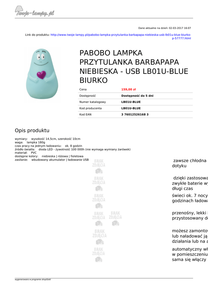 Dane aktualne na dzień: 02-03-2017 16:07 Link do produktu: http://www.twoje-lampy.pl/pabobo-lampka-przytulanka-barbapapa-niebieska-usb-lb01u-blue-biurkop-57777.html PABOBO LAMPKA PRZYTULANKA BARBAPAPA NIEBIESKA - USB LB01U-BLUE BIURKO Cena 159,00 zł Dostępność Dostępność do 5 dni Numer katalogowy LB01U-BLUE Kod producenta LB01U-BLUE Kod EAN 3 76012526168 3 Opis produktu wymiary: wysokość 14,5cm, szerokość 10cm waga: lampka 180g czas pracy na jednym ładowaniu: ok. 8 godzin źródło światła: dioda LED - żywotność 100 000h (nie wymaga wymiany żarówek) materiał: PVC dostępne kolory: niebieska | różowa | fioletowa zasilanie: wbudowany akumulator | ładowanie USB zawsze chłodna i dotyku dzięki zastosowa zwykłe baterie wy długi czas świeci ok. 7 nocy godzinach ładowa przenośny, lekki i przystosowany do możesz zamontow lub naładować ją działania lub na a automatyczny wł w pomieszczeniu sama się włączy wygenerowano w programie shopGold dla dzieci od uro prosta w obsłudz produkt certyfikowany wygenerowano w programie shopGold Powered by TCPDF (www.tcpdf.org) nie wymaga baterii bez żarówek