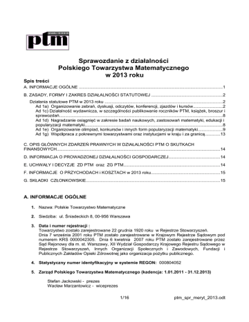 Sprawozdanie z działalności Polskiego Towarzystwa Matematycznego w 2013 roku Spis treści A. INFORMACJE OGÓLNE ......................................................................................................................1 B. ZASADY, FORMY I ZAKRES DZIAŁALNOŚCI STATUTOWEJ ..........................................................2 Działania statutowe PTM w 2013 roku .................................................................................................2 Ad 1a) Organizowanie zebrań, dyskusji, odczytów, konferencji, zjazdów i kursów........................2 Ad 1c) Działalność wydawnicza, w szczególności publikowanie roczników PTM, książek, broszur i sprawozdań......................................................................................................................................8 Ad 1d) Nagradzanie osiągnięć w zakresie badań naukowych, zastosowań matematyki, edukacji i popularyzacji matematyki.................................................................................................................8 Ad 1e) Organizowanie olimpiad, konkursów i innych form popularyzacji matematyki....................9 Ad 1g) Współpraca z pokrewnymi towarzystwami oraz instytucjami w kraju i za granicą............13 C. OPIS GŁÓWNYCH ZDARZEŃ PRAWNYCH W DZIAŁALNOŚCI PTM O SKUTKACH FINANSOWYCH......................................................................................................................................14 D. INFORMACJA O PROWADZONEJ DZIAŁALNOŚCI GOSPODARCZEJ..........................................14 E. UCHWAŁY I DECYZJE ZD PTM oraz ZG PTM...............................................................................14 F. INFORMACJE O PRZYCHODACH i KOSZTACH w 2013 roku.........................................................15 G. SKŁADKI CZŁONKOWSKIE..............................................................................................................15 A. INFORMACJE OGÓLNE 1. Nazwa: Polskie Towarzystwo Matematyczne 2. Siedziba: ul. Śniadeckich 8, 00-956 Warszawa 3. Data i numer rejestracji : Towarzystwo zostało zarejestrowane 22 grudnia 1920 roku w Rejestrze Stowarzyszeń. Dnia 7 września 2001 roku PTM zostało zarejestrowane w Krajowym Rejestrze Sądowym pod numerem KRS 0000042305. Dnia 6 kwietnia 2007 roku PTM zostało zarejestrowane przez Sąd Rejonowy dla m. st. Warszawy, XII Wydział Gospodarczy Krajowego Rejestru Sądowego w Rejestrze Stowarzyszeń, Innych Organizacji Społecznych i Zawodowych, Fundacji i Publicznych Zakładów Opieki Zdrowotnej jako organizacja pożytku publicznego. 4. Statystyczny numer identyfikacyjny w systemie REGON: 000804052 5. Zarząd Polskiego Towarzystwa Matematycznego (kadencja: 1.01.2011 - 31.12.2013) Stefan Jackowski - prezes Wacław Marzantowicz - wiceprezes 1/16 ptm_spr_meryt_2013.odt Grzegorz Karch - wiceprezes Krystyna Jaworska - sekretarz oraz p.o. skarbnika Zbigniew Błocki - członek zarządu Wojciech Domitrz - członek zarządu Stanisława Kanas - członek zarządu Paweł Strzelecki - członek zarządu 6. Komisja Rewizyjna PTM Andrzej Cegielski, Jacek Jakubowski (przewodniczący), Stefania Krasińska, Jacek Rogowski (sekretarz), Ewa Schmeidel. 7. Cele statutowe PTM a) reprezentowanie opinii i interesów polskiego środowiska matematycznego; b) krzewienie kultury matematycznej, w tym wspieranie edukacji matematycznej i popularyzacja matematyki; c) wspieranie badań matematycznych i zastosowań matematyki; d) dbałość o zachowanie tradycji matematyki polskiej; e) integracja polskiego środowiska matematycznego, w tym podtrzymywanie więzi z matematykami polskimi pracującymi za granicą; f) dbałość o należytą organizację i warunki pracy matematyków polskich. B. ZASADY, FORMY I ZAKRES DZIAŁALNOŚCI STATUTOWEJ Cele statutowe PTM realizowane są w szczególności przez: a) organizowanie zebrań, dyskusji, odczytów, konferencji, zjazdów i kursów; b) utrzymywanie i udostępnianie baz danych, zasobów internetowych i księgozbiorów; c) działalność wydawniczą, w szczególności publikowanie roczników PTM, książek, broszur i sprawozdań; d) nagradzanie osiągnięć w zakresie badań naukowych, zastosowań matematyki, edukacji i popularyzacji matematyki; e) organizowanie olimpiad, konkursów i innych form popularyzacji matematyki; f) współdziałanie z właściwymi podmiotami w zakresie kształcenia nauczycieli matematyki oraz nauczania matematyki na wszystkich poziomach; g) współpraca z pokrewnymi towarzystwami oraz instytucjami w kraju i za granicą; h) prezentowanie stanowiska polskiego środowiska matematycznego wobec władz, instytucji oraz opinii publicznej. Działalność PTM w określonym powyżej zakresie jest nieodpłatną działalnością pożytku publicznego. Ale działalność w zakresie określonym w punktach a), b), c), f) może być prowadzona także jako odpłatna działalność pożytku publicznego (§9 Statutu PTM). Działania statutowe PTM w 2013 roku Ad 1a) Organizowanie zebrań, dyskusji, odczytów, konferencji, zjazdów i kursów Informacje o zebraniach naukowych podano w sprawozdaniach oddziałów. Bieżące informacje nadchodzące do ZG PTM o programie posiedzeń ukazywały się na stronie głównej portalu internetowego www.ptm.org.pl i tam są zarchiwizowane. Ogółem w oddziałach odbyło się 112 odczytów naukowych, 18 odczytów dla nauczycieli i 37 odczytów dla uczniów szkół różnych szczebli. Oto zestawienia liczbowe z podziałem na oddziały. Odczyty naukowe: białostocki – 2, częstochowski – 0, gdański – 4, górnośląski – 16, kielecki – 1, krakowski – 16, lubelski – 15, łódzki – 4, olsztyński – 0, opolski – 0, poznański – 0, rzeszowski – 4, sądecki – 6, szczeciński – 3, toruński – 0, warszawski – 6, wrocławski – 33, zielonogórski – 2. Odczyty dla nauczycieli miały miejsce w następujących oddziałach: częstochowski – 7, łódzki – 1, olsztyński – 1, opol
