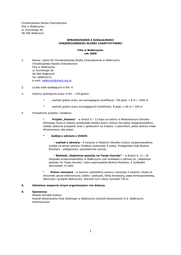 Chrześcijańska Służba Charytatywna Filia w Wałbrzychu ul. Kunickiego 3A 58-300 Wałbrzych SPRAWOZDANIE Z DZIAŁALNOSCI CHRZEŚCIJAŃSKIEJ SŁUŻBY CHARYTATYWNEJ Filia w Wałbrzychu rok 2009 1. Nazwa i adres filii Chrześcijańskiej Służby Charytatywnej w Wałbrzychu Chrześcijańska Służba Charytatywna Filia w Wałbrzychu ul. Kunickiego 3A 58-300 Wałbrzych Tel. 609610312 e-mail: [email protected] 2. Liczba osób działających w filii: 6 3. Godziny poświęcone pracy w filii – 138 godzin: 4. ° wartość godzin pracy nie wymagającej kwalifikacji: 130 godz. x 8 zł = 1040 zł ° wartość godzin pracy wymagających kwalifikacji: 8 godz. x 40 zł = 320 zł Prowadzone projekty i działania: ° Projekt „Kolonia” - w dniach 5 – 13 lipca na kolonii w Młodzieżowym Ośrodku Zdrowego Życia w Zatoniu przebywała dwójka dzieci, którym ten pobyt zorganizowaliśmy, zostały opłacone przejazdy wraz z opiekunem na miejsce i z powrotem, jedno dziecko miało sfinansowany cały pobyt. ° Zadbaj o zdrowie z ChSCH: - wykład o zdrowiu - 9 sierpnia w Kłodzkim Ośrodku Kultury zorganizowaliśmy wykład na temat zdrowia. Prelekcji wysłuchały 4 osoby. Prelegentem była Bożena Rosińska – pielęgniarka, wykształcenie wyższe. - Wykłady „Najtańsze sposoby na Twoje choroby” - w dniach 4, 11 i 18 listopada przeprowadziliśmy w Wałbrzychu cykl wykładów o zdrowiu pt. „Najtańsze sposoby na Twoje choroby”, które poprowadziła Bożena Rosińska. Z wykładów skorzystało 15 osób. ° Pomoc rzeczowa - w sierpniu udzieliliśmy pomocy rzeczowej 4 osobom. Osoby te otrzymały sprzęt elektroniczny, kołdry i poduszki, farbę emulsyjną, papę termozgrzewalną, odkurzacz i grzejnik elektryczny. Wartość tych rzeczy wynosiła 750 zł. 5. Udzielono wsparcia innym organizacjom: nie dotyczy. 6. Sponsorzy: Kłodzki Ośrodek Kultury Kościół Adwentystów Dnia Siódmego w Wałbrzychu (Kościół Adwentystów D.S. Wałbrzych) Wolontariusze 1 Część finansowa Lp. Rodzaj udzielonej pomocy Liczba osób objętych pomocą I Liczba Wartość w PLN Źródła finansowania Projekt "Kolonia" 1 Praca Wolontarystyczna 2 3 4 Pobyt na koloni 5 Wartość projektu 112 Wolontariusze Przejazdy 370 Filia ChSCh Telefony 14 Filia ChSCh 390 ChSCh II 14 h * 8 zł 2 886 Zadbaj o zdrowie z ChSCh - Wykład o zdrowiu 1 Praca Wolontarystyczna 16 h * 8 zł 128 Wolontariusze 2 Wynajęcie pomieszczenia 2 h * 40 zł 80 Kłodzki Ośrodek Kultury 3 Prelegent 2 h * 40 zł 80 Wolontariusze 4 Wyposarzenie sprzętowe (wideoskop i sprzęt nagłaśniający) 2 h * 50 zł + 2 h * 30 zł 160 Kłodzki Ośrodek Kultury 5 Ulotki 500 szt * 0,20 zł 100 6 Plakaty 50 szt * 0,50 zł 25 7 Wartość projektu 4 III Kościół Adwentystów Dnia Siódmego Kościół Adwentystów Dnia Siódmego 573 Pomoc rzeczowa 1 Praca Wolontarystyczna 2 Przedmioty 3 Telefony 4 Wartość projektu IV 34 h * 8 zł 4 272 Wolontariusze 750 Wolontariusze 8 Filia ChSCh 1030 Zadbaj o zdrowie z ChSCh - Wykłady "Najtańsze Sposoby Na Twoje Choroby” 1 Praca Wolontarystyczna 56 h * 8 zł 448 Wolontariusze 2 Wynajęcie pomieszczenia 6 h * 40 zł 240 Kościół Adwentystów Dnia Siódmego 3 Prelegent 6 h * 40 zł 240 Wolontariusze 4 Wyposarzenie sprzętowe (wideoskop i sprzęt nagłaśniający) 6 h * 50 zł + 6 h * 30 zł 480 Kościół Adwentystów Dnia Siódmego 5 Ulotki 200 Kościół Adwentystów Dnia Siódmego 6 Plakaty 115 Kościół Adwentystów Dnia Siódmego 7 telefony 226,74 Filia ChSCh 8 Wartość projektu V 1000 szt * 0,20 zł 150 szt * 0,50 + 50 szt * 0,80 zł 15 1949,74 CAŁKOWITA WARTOŚĆ UDZIELONEJ POMOCY 4438,74 Filia Chrześcijańskiej Służby Charytatywnej w Wałbrzychu udzieliła pomocy dla 25 osób o łącznej wartości 4438,74 zł. Sporządził Kierownik filii ChSCh w Wałbrzychu 2 Dariusz Bieniek 3