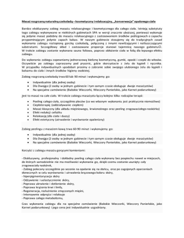 Masaż rozgrzaną naturalną czekoladą – kosmetyczny i relaksacyjny, „konserwacja” opalonego ciała Bardzo ekskluzywny zabieg masażu relaksacyjnego i kosmetycznego dla całego ciała. Istnieją substytuty tego zabiegu wykonywane w niektórych gabinetach SPA w wersji znacznie uboższej, ponieważ wykonuje się jedynie masaż podobny do masażu relaksacyjnego z zastosowaniem środków poślizgowych o zapachu przypominającym jedynie zapach kakao. W naszym gabinecie stosujemy się do tradycyjnych zasad wykonania zabiegu roztopioną gorzką czekoladą, połączoną z innymi nawilżającymi i natłuszczającymi substratami. Szczegółowy skład i zastosowane proporcje stanowi tajemnicę naszego gabinetu. W trakcie zabiegu zostanie wykonana sauna foliowa, poprzez obłożenie ciała w folią dla lepszego efektu zabiegu. Do wykonania zabiegu zapewniamy jednorazową bieliznę kosmetyczną, gumki, opaski i czepki do włosów. Oczywiście po zabiegu zapraszamy pod prysznic, gdzie skorzystacie z żelu do kąpieli i ręcznika. W przypadku indywidualnych upodobań prosimy o zabranie sobie swojego ulubionego żelu do kąpieli i balsamu do ciała i innych środków higieny osobistej. Zabieg rozgrzaną czekoladą trwa 60 lub 90 minut i wykonujemy go: Indywidualnie (dla jednej osoby) Dla Dwojga (2 osoby w jednym gabinecie i tym samym czasie obsługuje dwoje masażystów) Na specjalne zamówienie (Babskie Wieczorki, Wieczory Panieńskie, jako Karnet podarunkowy) Jest to masaż na całe ciało. W trakcie zabiegu masażysta łączy kolejno kilka rodzajów terapii: Peeling całego ciała, szczególnie pleców (co we własnym wykonaniu jest praktycznie niemożliwe) Ciepłoterapię (oddziaływanie ciepłem) Masaż klasyczny (dla układu mięśniowego, krwionośnego oraz peeling zrogowaciałego naskórka) Efekt redukcji cellulitu Relaksację (dla ciała i duszy) Efekt estetyczny (utrwalenie i wyrównanie opalenizny) Zabieg peelingu z masażem kawą trwa 60-90 minut i wykonujemy go: Indywidualnie (dla jednej osoby) Dla Dwojga (2 osoby w jednym gabinecie i tym samym czasie obsługuje dwoje masażystów) Na specjalne zamówienie (Babskie Wieczorki, Wieczory Panieńskie, jako Karnet podarunkowy) Korzyści z zabiegu masażu gorącymi kamieniami: - Ekskluzywny, profesjonalny i dokładny peeling całego ciała wykonany bez pospiechu nawet w miejscach, do których samodzielnie nie ma możliwości wykonania go, dzięki czemu zostanie usunięty cały zrogowaciały naskórek, - Zabieg polecany szczególnie po sezonie na opalanie się na słońcu, oraz po zagojonych oparzeniach słonecznych w celu wyrównania i utrwalenia brązowego koloru skóry, - hiperpigmentaryzacja skóry - Odżywienie i uelastycznienie skóry, - Poprawa ukrwienie i dotlenienie skóry, - Poprawa krążenia krwi i limfy, - Regeneracja, rozluźnienie zmęczonych mięśni, - Intensywnie odpręża i relaksuje - Poprawa całego metabolizmu, Czas wykonania zabiegu dla na specjalne zamówienie (Babskie Wieczorki, Wieczory Panieńskie, jako Karnet podarunkowy) i jego cena jest indywidualnie uzgadniany. Przeciwskazania do zabiegu: świeża opalenizna, gorączka, choroby zakaźne i stany zapalne skóry, otwarte rany, stan tuż po operacjach, chemioterapii i radioterapii, ciąża, menstruacja, skłonność do powstawania skrzepów krwi, żylaki kończyn dolnych, 3 i 4 stadium choroby Burgera, daleko posunięta miażdżyca, choroby serca.