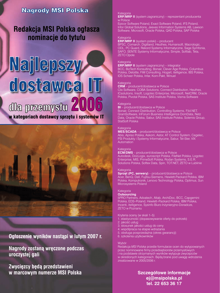Kategoria ERP/MRP II (system zagraniczny) – reprezentant producenta w Polsce Epicor Software Poland, Exact Software Poland, IFS Poland, Infor Global Solutions, Jeeves Information Systems AB, Lawson Software, Microsoft, Oracle Polska, QAD Polska, SAP Polska Kategoria ERP/MRP II (system polski) – producent BPSC, Comarch, Digitland, Heuthes, Humansoft, Macrologic, ODL, PC Guard, Rekord Systemy Informatyczne, Sage Symfonia, SAFO, SENTE Systemy Informatyczne, Simple, Softlab, Teta, ZETO Opole Kategoria ERP/MRP II (system zagraniczny) – integrator BCC, BizTech Konsulting, Bonair, Clever Age Polska, Columbus Polska, Deloitte, FiM Consulting, Hogart, itelligence, IBS Polska, IDS Scheer Polska, Infar, Kom-Pakt, Winuel Kategoria CRM – producent/dostawca w Polsce Clix Software, COBA Solutions, Connect Distribution, Heuthes, ICsolutions, Insoft, Logotec Enterprise, Microsoft, NetCRM, Oracle Polska, Pivotal Polska, SAS Institute Polska, Visma Software Kategoria BI – producent/dostawca w Polsce Bonair, Connect Distribution, Controlling Systems, Fild.NET, GramSoftware, InForum Business Intelligence DomData, Netz Data, Oracle Polska, Sabur, SAS Institute Polska, Solemis Group, StatSoft Polska Kategoria MES/SCADA – producent/dostawca w Polsce Abis, Apriso Polska, Askom, Astor, AT Control System, Cegelec, PSI Produkty i Systemy Informatyczne, Sabur, Tel-Ster, VIX Automation Kategoria ECM/DMS – producent/dostawca w Polsce Autodesk, DocLogix, euroscript Polska, FileNet Polska, Logotec Enterprise, MIS, PrimeSoft Polska, Rodan Systems, S.E.R. Solutions Polska, Softex Data, Spin, TOT.NET, ZETO w Lublinie Kategoria Sprzęt (PC, serwery) – producent/dostawca w Polsce Acer, BenQ, Dell, Fujitsu-Siemens, Hewlett-Packard Polska, IBM Polska, Komputronik, Lenovo Technology Polska, Optimus, Sun Microsystems Poland Kategoria Outsourcing 5PRO Partners, Advatech, Altab, ArchiDoc, BCC, Capgemini Polska, EDS–Poland, Hewlett–Packard Polska, IBM Polska, Incenti, itelligence, Sysinfo Biuro Inżynieryjno-Doradcze, ZETO w Poznaniu Kryteria oceny (w skali 1–5) 1. elastyczność (dopasowywanie oferty do potrzeb) 2. jakość usług 3. stosunek jakości usług do ceny 4. współpraca na etapie wdrażania 5. obsługa posprzedażna (okres gwarancji) 6. szkolenia użytkowników Wybór Redakcja MSI Polska prześle formularze ocen do wytypowanych przez nominowane firmy przedsiębiorstw przemysłowych i na podstawie otrzymanych wyników wytypuje zwycięzców w określonych kategoriach. Będą brane pod uwagę wdrożenia zrealizowane w 2005/2006 r. Szczegółowe informacje [email protected] tel. 22 653 36 17