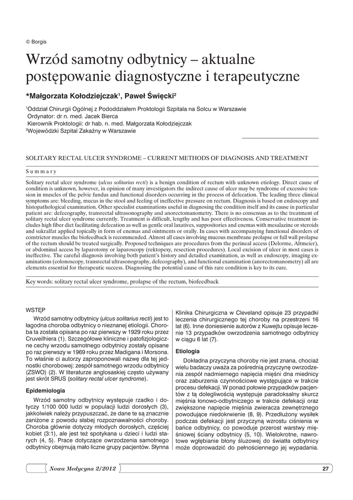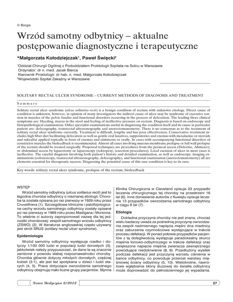 © Borgis Wrzód samotny odbytnicy – aktualne postępowanie diagnostyczne i terapeutyczne *Małgorzata Kołodziejczak1, Paweł Święcki2 Oddział Chirurgii Ogólnej z Pododdziałem Proktologii Szpitala na Solcu w Warszawie Ordynator: dr n. med. Jacek Bierca Kierownik Proktologii: dr hab. n. med. Małgorzata Kołodziejczak 2 Wojewódzki Szpital Zakaźny w Warszawie 1 Solitary rectal ulcer syndrome – current methods of diagnosis and treatment Summary Solitary rectal ulcer syndrome (ulcus solitarius recti) is a benign condition of rectum with unknown etiology. Direct cause of condition is unknown, however, in opinion of many investigators the indirect cause of ulcer may be syndrome of excessive tension in muscles of the pelvic fundus and functional disorders occurring in the process of defecation. The leading three clinical symptoms are: bleeding, mucus in the stool and feeling of ineffective pressure on rectum. Diagnosis is based on endoscopy and histopathological examination. Other specialist examinations useful in diagnosing the condition itself and its cause in particular patient are: defecography, transrectal ultrasonography and anorectomanometry. There is no consensus as to the treatment of solitary rectal ulcer syndrome currently. Treatment is difficult, lengthy and has poor effectiveness. Conservative treatment includes high fiber diet facilitating defecation as well as gentle oral laxatives, suppositories and enemas with mesalazine or steroids and sukralfat applied topically in form of enemas and ointments or orally. In cases with accompanying functional disorders of constrictor muscles the biofeedback is recommended. Almost all cases involving mucous membrane prolapse or full wall prolapse of the rectum should be treated surgically. Proposed techniques are procedures from the perineal access (Delorme, Altmeier), or abdominal access by laparotomy or laparoscopy (rektopexy, resection procedures). Local excision of ulcer in most cases is ineffective. The careful diagnosis involving both patient’s history and detailed examination, as well as endoscopy, imaging examinations (colonoscopy, transrectal ultrasonography, defecography), and functional examination (anorectomanometry) all are elements essential for therapeutic success. Diagnosing the potential cause of this rare condition is key to its cure. Key words: solitary rectal ulcer syndrome, prolapse of the rectum, biofeedback Wstęp Wrzód samotny odbytnicy (ulcus solitarius recti) jest to łagodna choroba odbytnicy o nieznanej etiologii. Choroba ta została opisana po raz pierwszy w 1929 roku przez Cruveilhiera (1). Szczegółowe kliniczne i patofizjologiczne cechy wrzodu samotnego odbytnicy zostały opisane po raz pierwszy w 1969 roku przez Madigana i Morsona. To właśnie ci autorzy zaproponowali nazwę dla tej jednostki chorobowej: zespół samotnego wrzodu odbytnicy (ZSWO) (2). W literaturze anglosaskiej często używany jest skrót SRUS (solitary rectal ulcer syndrome). Epidemiologia Wrzód samotny odbytnicy występuje rzadko i dotyczy 1/100 000 ludzi w populacji ludzi dorosłych (3), jakkolwiek należy przypuszczać, że dane te są znacznie zaniżone z powodu słabej rozpoznawalności choroby. Choroba głównie dotyczy młodych dorosłych, częściej kobiet (3:1), ale jest też spotykana u dzieci i ludzi starych (4, 5). Prace dotyczące owrzodzenia samotnego odbytnicy obejmują mało liczne grupy pacjentów. Słynna Nowa Medycyna 2/2012 Klinika Chirurgiczna w Cleveland opisuje 23 przypadki leczenia chirurgicznego tej choroby na przestrzeni 16 lat (6). Inne doniesienie autorów z Kuwejtu opisuje leczenie 13 przypadków owrzodzenia samotnego odbytnicy w ciągu 6 lat (7). Etiologia Dokładna przyczyna choroby nie jest znana, chociaż wielu badaczy uważa za pośrednią przyczynę owrzodzenia zespół nadmiernego napięcia mięśni dna miednicy oraz zaburzenia czynnościowe występujące w trakcie procesu defekacji. W ponad połowie przypadków pacjentów z tą dolegliwością występuje paradoksalny skurcz mięśnia łonowo-odbytniczego w trakcie defekacji oraz zwiększone napięcie mięśnia zwieracza zewnętrznego powodujące niedokrwienie (8, 9). Przedłużony wysiłek podczas defekacji jest przyczyną wzrostu ciśnienia w bańce odbytnicy, co powoduje przerost warstwy mięśniowej ściany odbytnicy (5, 10). Wielokrotne, nawrotowe wgłębianie błony śluzowej do światła odbytnicy może doprowadzić do pełnościennego jej wypadania. 27 Małgorzata Kołodziejczak, Paweł Święcki Jak wspomniano, owrzodzenie często towarzyszy wypadaniu odbytnicy i wówczas jest zlokalizowane na szczycie wypadającej błony śluzowej. U tych pacjentów operacja lecząca wypadanie pełnościenne odbytnicy może wyleczyć również owrzodzenie. Pomimo tego faktu, wypadania błony śluzowej odbytnicy nie można uznać za jednoznaczną przyczynę choroby, gdyż w wielu przypadkach pomimo obecności owrzodzenia nie występuje wypadanie błony śluzowej. Jedni autorzy uważają niedokrwienie błony śluzowej za główną przyczynę choroby, inni podkreślają rolę urazu mechanicznego, np. spowodowanego manualną ewakuacją kamieni kałowych z odbytnicy (11). Są też teorie biorące pod uwagę działanie miejscowych leków na błonę śluzową odbytnicy (np. ergotaminy, niesterydowych leków przeciwzapalnych, antybiotyków) oraz radioterapii (12). Na koniec należy wspomnieć o pojedynczych doniesieniach, jakoby owrzodzenie samotne było objawem choroby systemowej mającej związek z fenotypem HLA-B27 (13). Reasumując, przyczyna powstania wrzodu samotnego jest złożona, zależna od kilku czynników, głównie zaburzeń czynnościowych i być może urazu mechanicznego. Obraz kliniczny Podstawowym objawem klinicznym jest krwawienie świeżą krwią z odbytnicy – 91,4% przypadków oraz obecność śluzu w stolcu – 76,5% przypadków (14). Pacjent może też się skarżyć na uczucie nieskutecznego parcia na odbytnicę, ból, zaparcie b