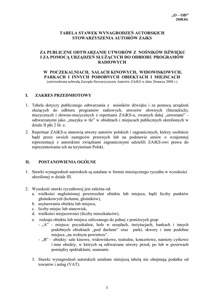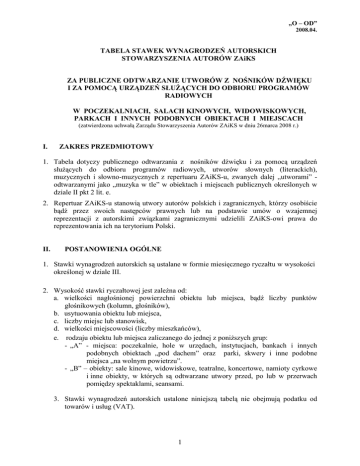 „O – OD” 2008.04. TABELA STAWEK WYNAGRODZEŃ AUTORSKICH STOWARZYSZENIA AUTORÓW ZAiKS ZA PUBLICZNE ODTWARZANIE UTWORÓW Z NOŚNIKÓW DŹWIĘKU I ZA POMOCĄ URZĄDZEŃ SŁUśĄCYCH DO ODBIORU PROGRAMÓW RADIOWYCH W POCZEKALNIACH, SALACH KINOWYCH, WIDOWISKOWYCH, PARKACH I INNYCH PODOBNYCH OBIEKTACH I MIEJSCACH (zatwierdzona uchwałą Zarządu Stowarzyszenia Autorów ZAiKS w dniu 26marca 2008 r.) I. ZAKRES PRZEDMIOTOWY 1. Tabela dotyczy publicznego odtwarzania z nośników dźwięku i za pomocą urządzeń słuŜących do odbioru programów radiowych, utworów słownych (literackich), muzycznych i słowno-muzycznych z repertuaru ZAiKS-u, zwanych dalej „utworami” odtwarzanymi jako „muzyka w tle” w obiektach i miejscach publicznych określonych w dziale II pkt 2 lit. e. 2. Repertuar ZAiKS-u stanowią utwory autorów polskich i zagranicznych, którzy osobiście bądź przez swoich następców prawnych lub na podstawie umów o wzajemnej reprezentacji z autorskimi związkami zagranicznymi udzielili ZAiKS-owi prawa do reprezentowania ich na terytorium Polski. II. POSTANOWIENIA OGÓLNE 1. Stawki wynagrodzeń autorskich są ustalane w formie miesięcznego ryczałtu w wysokości określonej w dziale III. 2. Wysokość stawki ryczałtowej jest zaleŜna od: a. wielkości nagłośnionej powierzchni obiektu lub miejsca, bądź liczby punktów głośnikowych (kolumn, głośników), b. usytuowania obiektu lub miejsca, c. liczby miejsc lub stanowisk, d. wielkości miejscowości (liczby mieszkańców), e. rodzaju obiektu lub miejsca zaliczanego do jednej z poniŜszych grup: - „A” - miejsca: poczekalnie, hole w urzędach, instytucjach, bankach i innych podobnych obiektach „pod dachem” oraz parki, skwery i inne podobne miejsca „na wolnym powietrzu”. - „B” – obiekty: sale kinowe, widowiskowe, teatralne, koncertowe, namioty cyrkowe i inne obiekty, w których są odtwarzane utwory przed, po lub w przerwach pomiędzy spektaklami, seansami. 3. Stawki wynagrodzeń autorskich ustalone niniejszą tabelą nie obejmują podatku od towarów i usług (VAT). 1 „O – OD” 2008.04. 4. NaleŜności z tytułu wynagrodzeń autorskich wyliczone na podstawie niniejszej tabeli, zaokrągla się do pełnych złotych według zasady: do 0,50 zł w dół, powyŜej 0,50 zł w górę. III. STAWKI 1. W obiektach grupy „A” a. „pod dachem” - 15,- zł za kaŜde rozpoczęte 100 m 2, b. „na wolnym powietrzu” - do 10 głośników ( kolumn, punktów głośnikowych) – 50,-zł, - powyŜej 10 głośników - 50zł plus 2,50 zł za kaŜdy głośnik. 2. W obiektach grupy „B” - 0,30 zł – za 1 miejsce na widowni. IV. PODWYśSZENIE STAWKI 1. PodwyŜszenie stawki do 50% stawki podstawowej stosuje się dla miejsc i obiektów: a. znajdujących się w miejscowościach atrakcyjnych turystycznie w okresie sezonu, b. o podwyŜszonym standardzie, stopniu atrakcyjności w stosunku do podobnych obiektów i miejsc w tej samej miejscowości. V. UPUSTY 1. Upusty stosuje się wyłącznie na podstawie pisemnego wniosku podmiotu publicznie odtwarzającego utwory w następującej wysokości: a. dla kontrahentów, którzy wystąpili do Stowarzyszenia Autorów ZAiKS z wnioskiem o zawarcie umowy przed rozpoczęciem publicznego odtwarzania utworów, bez uprzedniego podjęcia działań przez Stowarzyszenie – upust: - do 10% na okres 1 roku, b. dla kontrahentów, którzy wpłacili wynagrodzenia autorskie z góry (bez moŜliwości zwrotu w przypadku wcześniejszego zakończenia publicznego odtwarzania utworów) – upusty: - do 15% - przy jednorazowej wpłacie za kwartał, - do 20% - przy jednorazowej wpłacie za pół roku, - do 25% - przy jednorazowej wpłacie za rok, c. dla członków izb gospodarczych i związków branŜowych w wysokości określonej w porozumieniu podpisanym ze Stowarzyszeniem Autorów ZAiKS, d. dla kontrahentów firm nagłaśniających, które mają podpisane porozumienie ze Stowarzyszeniem Autorów ZAiKS – w wysokości określonej w tym porozumieniu. 2. Łączna kwota upustów nie moŜe przekroczyć 30% naleŜnych wynagrodzeń autorskich. 2 „O – OD” 2008.04. VI. POSTANOWIENIA KOŃCOWE 1. Stawki wynagrodzeń podlegać będą zmianie (waloryzacji) w okresach rocznych na dzień 1 kwietnia, począwszy od dnia 1 kwietnia 2009 roku, z uwzględnieniem średniorocznego wskaźnika cen towarów i usług konsumpcyjnych w poprzednim roku, ogłaszanego przez Prezesa GUS. Waloryzacja na dany rok będzie dokonywana, o ile od ostatniego ustalenia wysokości stawki ceny towarów i usług konsumpcyjnych wzrosną nie mniej, niŜ 1 %. Waloryzacja stawki dokonywana będzie równieŜ w przypadku, gdy w kaŜdym z kolejnych trzech lat wskaźnik, o którym mowa powyŜej będzie niŜszy, niŜ 1%, zaś suma wskaźników za cały okres trzyletni przekroczy 2,5%. 2. W przypadkach nieprzewidzianych w niniejszej Tabeli naleŜy stosować stawki określone w Tabeli dla najbardziej zbliŜonego rodzaju obiektu lub miejsca. 3. Tabela wchodzi w Ŝycie z dniem 1 kwietnia 2008 r. 3
