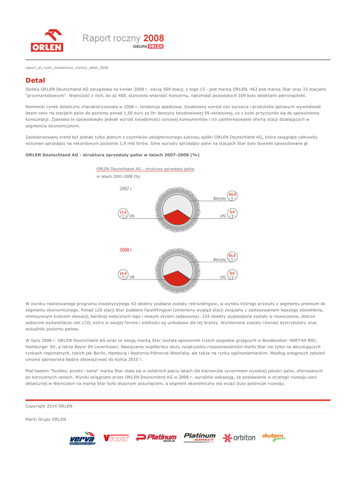 raport_pl_rynki_dzialalnosci_niemcy_detal_2008 Detal Spółka ORLEN Deutschland AG zarządzała na koniec 2008 r. siecią 509 stacji, z tego 13 - pod marką ORLEN, 463 pod marką Star oraz 33 stacjami "przymarketowymi". Większość z nich, bo aż 400, stanowiła własność Koncernu, natomiast pozostałych 109 było obiektami patronackimi. Niemiecki rynek detaliczny charakteryzowała w 2008 r. tendencja spadkowa. Gwałtowny wzrost cen surowca i produktów gotowych wywindował latem ceny na stacjach paliw do poziomu ponad 1,50 euro za litr benzyny bezołowiowej 95-oktanowej, co z kolei przyczyniło się do spowolnienia konsumpcji. Zjawiska te spowodowały jednak wzrost świadomości cenowej konsumentów i ich zainteresowanie ofertą stacji działających w segmencie ekonomicznym. Zaobserwowany trend był jednak tylko jednym z czynników ubiegłorocznego sukcesu spółki ORLEN Deutschland AG, która osiągnęła całkowity wolumen sprzedaży na rekordowym poziomie 1,9 mld litrów. Silne wzrosty sprzedaży paliw na stacjach Star były bowiem spowodowane gł ORLEN Deutschland AG - struktura sprzedaży paliw w latach 2007-2008 (%) W wyniku realizowanego programu inwestycyjnego 43 obiekty poddane zostały rebrandingowi, w wyniku którego przeszły z segmentu premium do segmentu ekonomicznego. Ponad 120 stacji Star poddano faceliftingowi (zmieniony wygląd stacji związany z zastosowaniem lepszego oświetlenia, intensywnym kolorem elewacji, bardziej widocznym logo i nowym stylem zadaszenia). 124 obiekty wyposażone zostały w nowoczesne, dobrze widoczne wyświetlacze cen LCD, które w swojej formie i wielkości są unikatowe dla tej branży. Wymienione zostały również dystrybutory oraz wskaźniki poziomu paliwa. W lipcu 2008 r. ORLEN Deutschland AG wraz ze swoją marką Star została sponsorem trzech zespołów grających w Bundeslidze: HERTHA BSC, Hamburger SV, a także Bayer 04 Leverkusen. Nawiązanie współpracy służy zwiększeniu rozpoznawalności marki Star nie tylko na decydujących rynkach regionalnych, takich jak Berlin, Hamburg i Nadrenia-Północna Westfalia, ale także na rynku ogólnoniemieckim. Według wstępnych założeń umowa sponsorska będzie obowiązywać do końca 2010 r. Pod hasłem "Szybko, prosto i tanio" marka Star stała się w ostatnich pięciu latach dla kierowców synonimem wysokiej jakości paliw, oferowanych po korzystnych cenach. Wyniki osiągnięte przez ORLEN Deutschland AG w 2008 r. wyraźnie wskazują, że postawienie w strategii rozwoju sieci detalicznej w Niemczech na markę Star było słusznym posunięciem, a segment ekonomiczny ma wciąż duży potencjał rozwoju. Copyright 2014 ORLEN Marki Grupy ORLEN