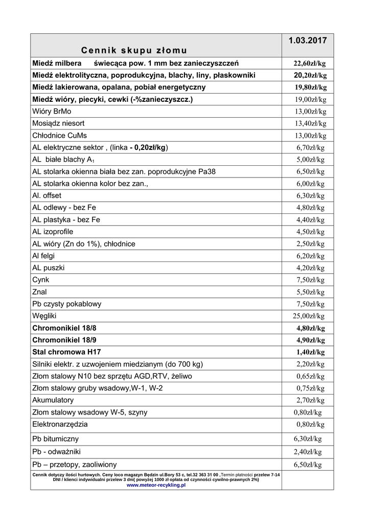 1.03.2017 Cennik skupu złomu Miedź milbera świecąca pow. 1 mm bez zanieczyszczeń 22,60zł/kg Miedź elektrolityczna, poprodukcyjna, blachy, liny, płaskowniki 20,20zł/kg Miedź lakierowana, opalana, pobiał energetyczny 19,80zł/kg Miedź wióry, piecyki, cewki (-%zanieczyszcz.) 19,00zł/kg Wióry BrMo 13,00zł/kg Mosiądz niesort 13,40zł/kg Chłodnice CuMs 13,00zł/kg AL elektryczne sektor , (linka - 0,20zł/kg) 6,70zł/kg AL białe blachy A1 5,00zł/kg AL stolarka okienna biała bez zan. poprodukcyjne Pa38 6,50zł/kg AL stolarka okienna kolor bez zan., 6,00zł/kg Al. offset 6,30zł/kg AL odlewy - bez Fe 4,80zł/kg AL plastyka - bez Fe 4,40zł/kg AL izoprofile 4,50zł/kg AL wióry (Zn do 1%), chłodnice 2,50zł/kg Al felgi 6,20zł/kg AL puszki 4,20zł/kg Cynk 7,50zł/kg Znal 5,50zł/kg Pb czysty pokablowy 7,50zł/kg Węgliki 25,00zł/kg Chromonikiel 18/8 4,80zł/kg Chromonikiel 18/9 4,90zł/kg Stal chromowa H17 1,40zł/kg Silniki elektr. z uzwojeniem miedzianym (do 700 kg) 2,20zł/kg Złom stalowy N10 bez sprzętu AGD,RTV, żeliwo 0,65zł/kg Złom stalowy gruby wsadowy,W-1, W-2 0,75zł/kg Akumulatory 2,70zł/kg Złom stalowy wsadowy W-5, szyny Elektronarzędzia 0,80zł/kg 0,80zł/kg Pb bitumiczny 6,30zł/kg Pb - odważniki 2,40zł/kg Pb – przetopy, zaoliwiony 6,50zł/kg Cennik dotyczy ilości hurtowych. Ceny loco magazyn Będzin ul.Bory 53 c, tel.32 363 31 00 ,Termin płatności przelew 7-14 DNI / klienci indywidualni przelew 3 dni( powyżej 1000 zł opłata od czynności cywilno-prawnych 2%) www.meteor-recykling.pl