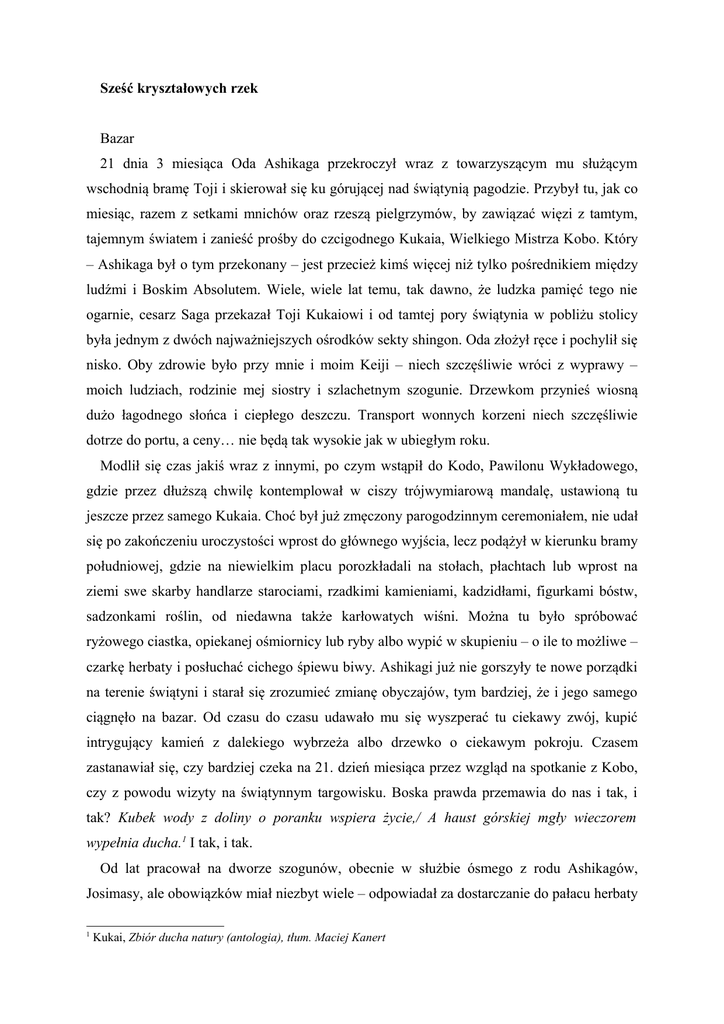 Sześć kryształowych rzek Bazar 21 dnia 3 miesiąca Oda Ashikaga przekroczył wraz z towarzyszącym mu służącym wschodnią bramę Toji i skierował się ku górującej nad świątynią pagodzie. Przybył tu, jak co miesiąc, razem z setkami mnichów oraz rzeszą pielgrzymów, by zawiązać więzi z tamtym, tajemnym światem i zanieść prośby do czcigodnego Kukaia, Wielkiego Mistrza Kobo. Który – Ashikaga był o tym przekonany – jest przecież kimś więcej niż tylko pośrednikiem między ludźmi i Boskim Absolutem. Wiele, wiele lat temu, tak dawno, że ludzka pamięć tego nie ogarnie, cesarz Saga przekazał Toji Kukaiowi i od tamtej pory świątynia w pobliżu stolicy była jednym z dwóch najważniejszych ośrodków sekty shingon. Oda złożył ręce i pochylił się nisko. Oby zdrowie było przy mnie i moim Keiji – niech szczęśliwie wróci z wyprawy – moich ludziach, rodzinie mej siostry i szlachetnym szogunie. Drzewkom przynieś wiosną dużo łagodnego słońca i ciepłego deszczu. Transport wonnych korzeni niech szczęśliwie dotrze do portu, a ceny… nie będą tak wysokie jak w ubiegłym roku. Modlił się czas jakiś wraz z innymi, po czym wstąpił do Kodo, Pawilonu Wykładowego, gdzie przez dłuższą chwilę kontemplował w ciszy trójwymiarową mandalę, ustawioną tu jeszcze przez samego Kukaia. Choć był już zmęczony parogodzinnym ceremoniałem, nie udał się po zakończeniu uroczystości wprost do głównego wyjścia, lecz podążył w kierunku bramy południowej, gdzie na niewielkim placu porozkładali na stołach, płachtach lub wprost na ziemi swe skarby handlarze starociami, rzadkimi kamieniami, kadzidłami, figurkami bóstw, sadzonkami roślin, od niedawna także karłowatych wiśni. Można tu było spróbować ryżowego ciastka, opiekanej ośmiornicy lub ryby albo wypić w skupieniu – o ile to możliwe – czarkę herbaty i posłuchać cichego śpiewu biwy. Ashikagi już nie gorszyły te nowe porządki na terenie świątyni i starał się zrozumieć zmianę obyczajów, tym bardziej, że i jego samego ciągnęło na bazar. Od czasu do czasu udawało mu się wyszperać tu ciekawy zwój, kupić intrygujący kamień z dalekiego wybrzeża albo drzewko o ciekawym pokroju. Czasem zastanawiał się, czy bardziej czeka na 21. dzień miesiąca przez wzgląd na spotkanie z Kobo, czy z powodu wizyty na świątynnym targowisku. Boska prawda przemawia do nas i tak, i tak? Kubek wody z doliny o poranku wspiera życie,/ A haust górskiej mgły wieczorem wypełnia ducha.1 I tak, i tak. Od lat pracował na dworze szogunów, obecnie w służbie ósmego z rodu Ashikagów, Josimasy, ale obowiązków miał niezbyt wiele – odpowiadał za dostarczanie do pałacu herbaty 1 Kukai, Zbiór ducha natury (antologia), tłum. Maciej Kanert i przypraw. Przynależność do wielkiego rodu dawała przywileje i wygodne życie. Miał więc sporo czasu na wszystkie swoje pasje. Pochłaniały go ostatnio zupełnie i nawet uczyniły sławnym. Po pierwsze: kaligrafia. Nikt jak on nie znał się na starych i nowych znakach. Ale nie tylko. „Oda. Mistrz miniaturowych drzew i ogrodów”. Tak teraz mówiono o nim w mieście, a na cotygodniowych spotkaniach u szoguna, gdzie dyskutowano reguły piękna absolutnego, już kilkakrotnie dawano jego struktury i formy za przykład właściwego rozumienia wysublimowanej prostoty. Tak twierdził Soami, a kto trafniej niż on może wypowiedzieć się na temat sztuki komponowania przestrzeni? Nawet Geiami przyznawał się do inspiracji pracami mistrza Ody, a czyż może być coś bardziej wzniosłego niż opinia najważniejszego artysty w otoczeniu szoguna? Cierpliwie więc hodował swoje miniaturowe drzewka, rok po roku, rok po roku, formował i kształtował – przecież to on, nikt inny, wymyślił aluzyjną, wyrafinowaną formę literacką, która tak zachwyciła szoguna. Sadził młode drzewka, pojedynczo i w grupach, okręcał pnie i pędy miedzianym, giętkim drutem, przycinał i wyginał gałązki – przecież to on, właśnie on, wymyślił sprytne wklęsłe cęgi, które nie kaleczyły gałęzi – uszczykiwał delikatne końcówki, przecinał i skracał korzenie, polerował korę i zamarłe fragmenty. Tak, by drzewka wyglądały jak stare okazy. Przesadzał je do nowych pojemników, na płyty i kamienie, dobierał podłoże, podlewał rośliny i nawoził, walczył ze szkodnikami, suszą, ale i nadmierną wilgocią, wysiewał cierpliwie nasiona, sadzonkował, szczepił, szczepił, szczepił. Bambusy i pigwowce, klony, dęby, buki, graby, brzozy, figowce, ostrokrzewy, sosny, cisy, jałowce, kryptomerie, modrzewie i świerki, magnolie, wiśnie, morele i śliwy. To nie zaspokajało w pełni jego estetycznych ambicji i artystycznych pragnień. Przecież był artystą. Jego subtelny umysł i zręczne ręce powołały zatem do życia dziesiątki miniaturowych ogrodów. Z fantazyjnych, zbieranych latami kamieni, żwiru, gliny, z drzew i krzewów z jego własnej hodowli, mchu, porostów i wrzosów. W jego żyjących krajobrazach był i dramatyczny krzyk morskiego wichru, i łagodny oddech przedwieczornej bryzy. Znajdował piękno w różowych pąkach i białych płatkach jabłoni, w błyszczących, czerwonych jak usta kobiety owocach irgi, ale również w uschniętej gałęzi wiązu, zmurszałym pniu starej wierzby i surowym, szarym a przecież tak niezwykłym kamieniu ze wschodniej prowincji. Rozglądał się teraz uważnie… Ryszard Lenc Katowice, listopad–grudzień 2008 r.