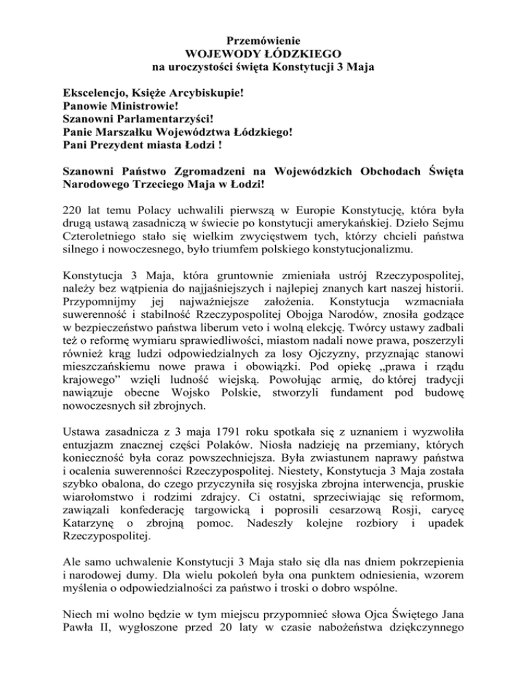 Przemówienie WOJEWODY ŁÓDZKIEGO na uroczystości święta Konstytucji 3 Maja Ekscelencjo, Księże Arcybiskupie! Panowie Ministrowie! Szanowni Parlamentarzyści! Panie Marszałku Województwa Łódzkiego! Pani Prezydent miasta Łodzi ! Szanowni Państwo Zgromadzeni na Wojewódzkich Obchodach Święta Narodowego Trzeciego Maja w Łodzi! 220 lat temu Polacy uchwalili pierwszą w Europie Konstytucję, która była drugą ustawą zasadniczą w świecie po konstytucji amerykańskiej. Dzieło Sejmu Czteroletniego stało się wielkim zwycięstwem tych, którzy chcieli państwa silnego i nowoczesnego, było triumfem polskiego konstytucjonalizmu. Konstytucja 3 Maja, która gruntownie zmieniała ustrój Rzeczypospolitej, należy bez wątpienia do najjaśniejszych i najlepiej znanych kart naszej historii. Przypomnijmy jej najważniejsze założenia. Konstytucja wzmacniała suwerenność i stabilność Rzeczypospolitej Obojga Narodów, znosiła godzące w bezpieczeństwo państwa liberum veto i wolną elekcję. Twórcy ustawy zadbali też o reformę wymiaru sprawiedliwości, miastom nadali nowe prawa, poszerzyli również krąg ludzi odpowiedzialnych za losy Ojczyzny, przyznając stanowi mieszczańskiemu nowe prawa i obowiązki. Pod opiekę „prawa i rządu krajowego” wzięli ludność wiejską. Powołując armię, do której tradycji nawiązuje obecne Wojsko Polskie, stworzyli fundament pod budowę nowoczesnych sił zbrojnych. Ustawa zasadnicza z 3 maja 1791 roku spotkała się z uznaniem i wyzwoliła entuzjazm znacznej części Polaków. Niosła nadzieję na przemiany, których konieczność była coraz powszechniejsza. Była zwiastunem naprawy państwa i ocalenia suwerenności Rzeczypospolitej. Niestety, Konstytucja 3 Maja została szybko obalona, do czego przyczyniła się rosyjska zbrojna interwencja, pruskie wiarołomstwo i rodzimi zdrajcy. Ci ostatni, sprzeciwiając się reformom, zawiązali konfederację targowicką i poprosili cesarzową Rosji, carycę Katarzynę o zbrojną pomoc. Nadeszły kolejne rozbiory i upadek Rzeczypospolitej. Ale samo uchwalenie Konstytucji 3 Maja stało się dla nas dniem pokrzepienia i narodowej dumy. Dla wielu pokoleń była ona punktem odniesienia, wzorem myślenia o odpowiedzialności za państwo i troski o dobro wspólne. Niech mi wolno będzie w tym miejscu przypomnieć słowa Ojca Świętego Jana Pawła II, wygłoszone przed 20 laty w czasie nabożeństwa dziękczynnego z okazji dwusetnej rocznicy uchwalenia wielkiego dzieła Sejmu Wielkiego, który powiedział wtedy: „Po upływie dwóch wieków doceniamy pełniej jeszcze wagę tego dokumentu: odczytujemy w nim prawdę o Polsce zakorzenionej w przeszłości, a równocześnie wychyloną w przyszłość”. W te pierwsze majowe dni postać Ojca Świętego jest nam szczególnie bliska. Jest dla nas Polaków powodem do szczególnej dumy. W naszych sercach wciąż żywe są emocje i wzruszenia jakich doświadczyliśmy przed dwoma dniami na Wzgórzach Watykańskich podczas beatyfikacji Jana Pawła II. Jest dla mnie zaszczytem, że wspólnie z innymi wiernymi z naszej archidiecezji mogłam być uczestnikiem tego wydarzenia. W poczuciu wspólnoty, szukając w nas tego co nas łączy a nie dzieli wypełniliśmy plac św. Piotra miłością i pokorą do Ojca Świętego. Nad naszymi głowami radośnie powiewały biało-czerwone flagi – nasze narodowe barwy, które zawsze towarzyszą nam w ważnych, dla Polski i Polaków, chwilach. Wiemy, że podobna atmosfera była na wielu placach i ulicach polskich miast i miasteczek, w tysiącach polskich rodzin. Aby jednak to poczucie wspólnoty zostało w nas trwale zakorzenione musimy w nas samych pielęgnować dobro, przekazywać naszym dzieciom i nam samym właściwe postawy moralne i wzorce. Dlatego niezależnie od politycznych podziałów i sporów, dzielących nas różnic, w imię hołdu dla dziedzictwa Konstytucji 3 Maja, z szacunku dla mądrości płynącej z nauk i życia Jana Pawła II, z chwały patriotycznych czynów naszych przodków i współczesnych, starajmy się szukać drogi do zrozumienia wzajemnych racji i przezwyciężania uprzedzeń. To będzie nasza najlepsza praca dla Polski i jej miejsca w świecie. Pracujmy tak, by – mówiąc słowami Konstytucji Trzeciego Maja – na „błogosławieństwo, na wdzięczność współczesnych i przyszłych pokoleń zasłużyć”. Pamiętajmy o przesłaniu Naszego Wielkiego Papieża, który mówił do nas – „Jesteście świadkami historii. Przypominajcie, że Wolność jest nam nie tylko dana, ale i zadana.” Szanowni Państwo, Na zakończenie bardzo gorące podziękowania kieruję do wszystkich, którzy przyczynili się do organizacji dzisiejszej podniosłej uroczystości. Dziękuję Księdzu Metropolicie za odprawienie mszy świętej i wygłoszoną homilię. Słowa podziękowania za obecność i oprawę uroczystości kieruję do orkiestry górniczej z Bełchatowa oraz do kompanii honorowych i pocztów sztandarowych. Szczególnie serdecznie dziękuję kombatantom i weteranom. Dziękuję również młodzieży i harcerzom, oraz licznie przybyłym delegacjom reprezentującym liczne środowiska zawodowe i społeczne Łodzi i województwa. Nasza obecność tu, w sercu Łodzi, a także na uroczystościach, które dla uczczenia Konstytucji 3 Maja odbywają się w wielu miastach województwa łódzkiego, jest wymownym świadectwem, że pozostajemy wierni „całemu duchowemu dziedzictwu, któremu na imię Polska”. Niech Majowa Jutrzenka zagości w polskich sercach i niech owocuje miłością, pokojem i sprawiedliwością!